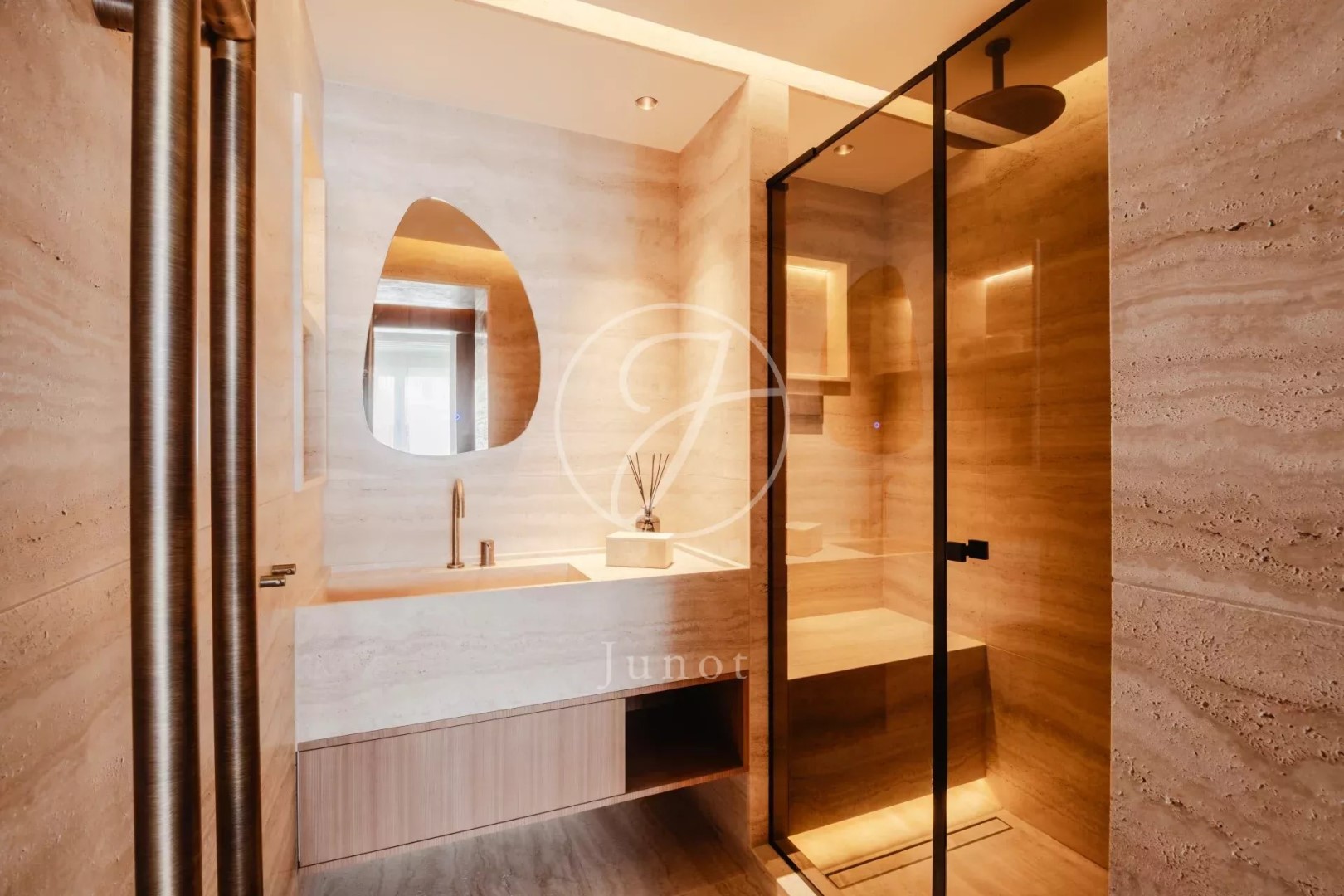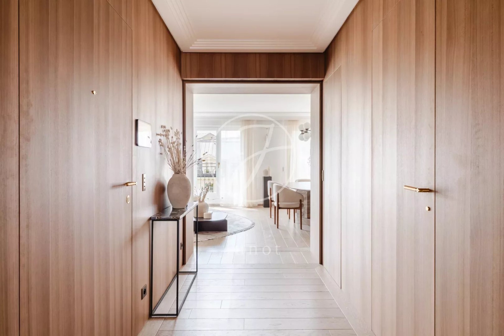 Ideally located on avenue d'Iéna, a stone's throw from Place de l'Étoile. On the fifth floor of a secure luxury building with live-in janitor, this walk-through apartment offers unobstructed views of the Eiffel Tower and Arc de Triomphe. Entirely renovated by an architect, it features a vast, bright living room with open kitchen, two suites, each with bathroom and toilet, guest toilet and plenty of built-in storage space. The common thread running through the décor is the refined combination of travertine and oak. Dressing rooms, woodwork, custom-designed furniture. Air-conditioned, furnished with top-of-the-range pieces, this apartment is sold turnkey. A rare property, ideal as a pied-à-terre, for customers looking for an exceptional location.