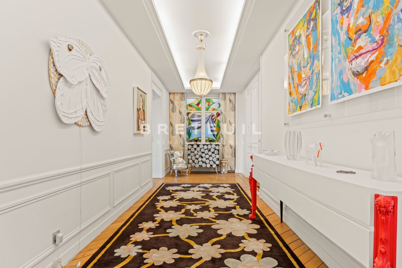Foch. On the fifth floor, served by elevator, of a superb Haussmann-style building of high standing and security (concierge 24/24) with noble common areas, magnificent reception apartment tastefully renovated by architect and benefiting from an exemplary floor plan, spacious rooms and an exceptional view from its large 20 m² balcony. Entrance gallery, spacious living room, dining room, fitted kitchen, two good-sized bedrooms, bathroom with toilet, shower room, separate toilet, laundry room, hallway, plenty of storage space. Cellar.