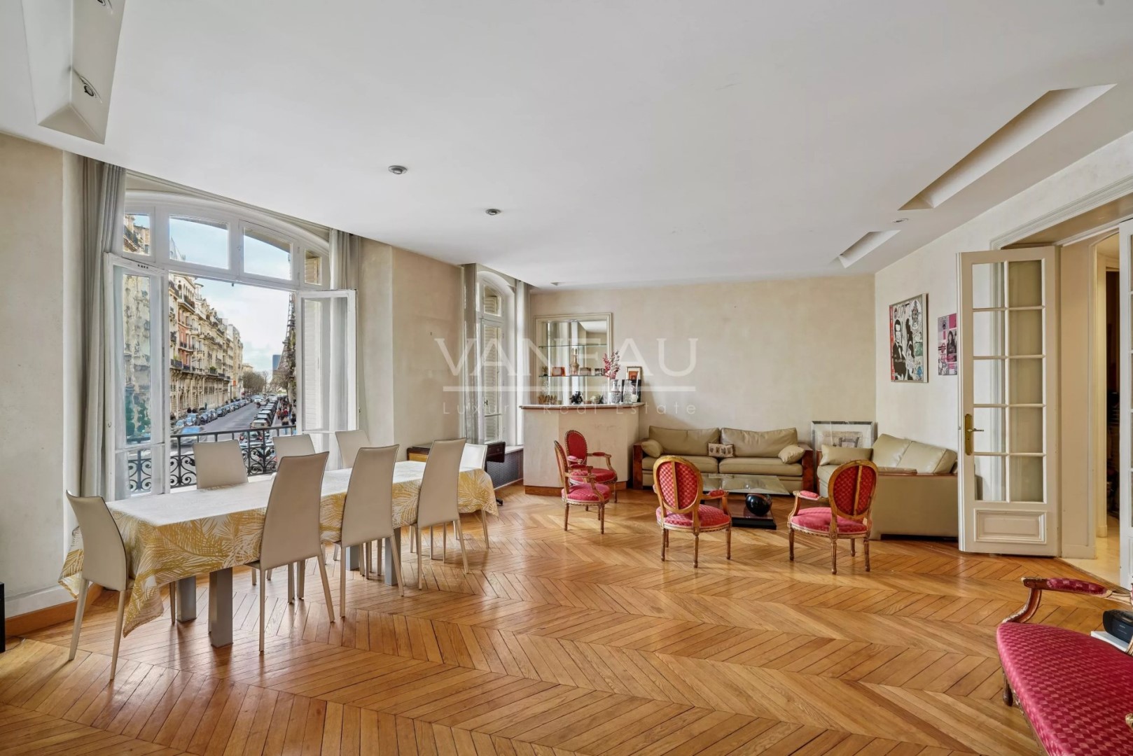 Ideally located on the highly sought-after Place de Mexico, in a luxury condominium with janitor, this elegant 200 sqm family apartment with high ceilings (3,25 m), comprises a beautiful entrance gallery, a double angled living room opening onto Place de Mexico, with a view of the Eiffel Tower, a beautiful dining kitchen renovated less than three years ago, four bedrooms, two bathrooms and two separate toilets. Old-world charm, spaciousness, emblematic views and a prestigious address make this apartment a rarity on the market. The apartment is complemented by two cellars. A nearby parking space in addition 50.000 €.