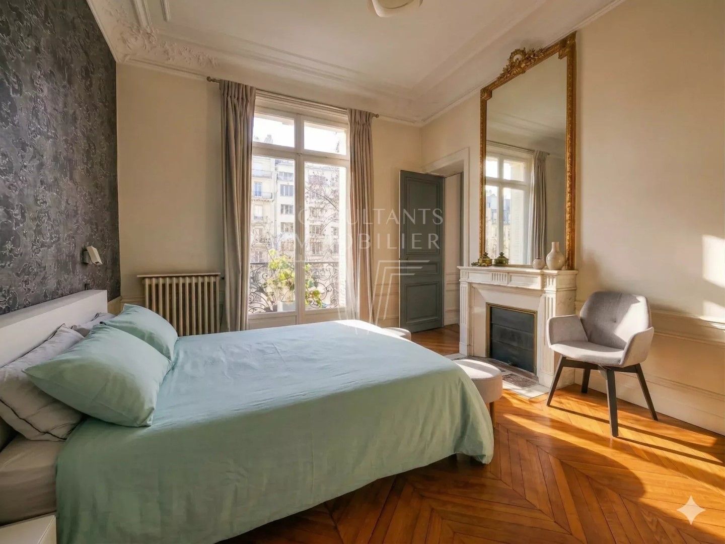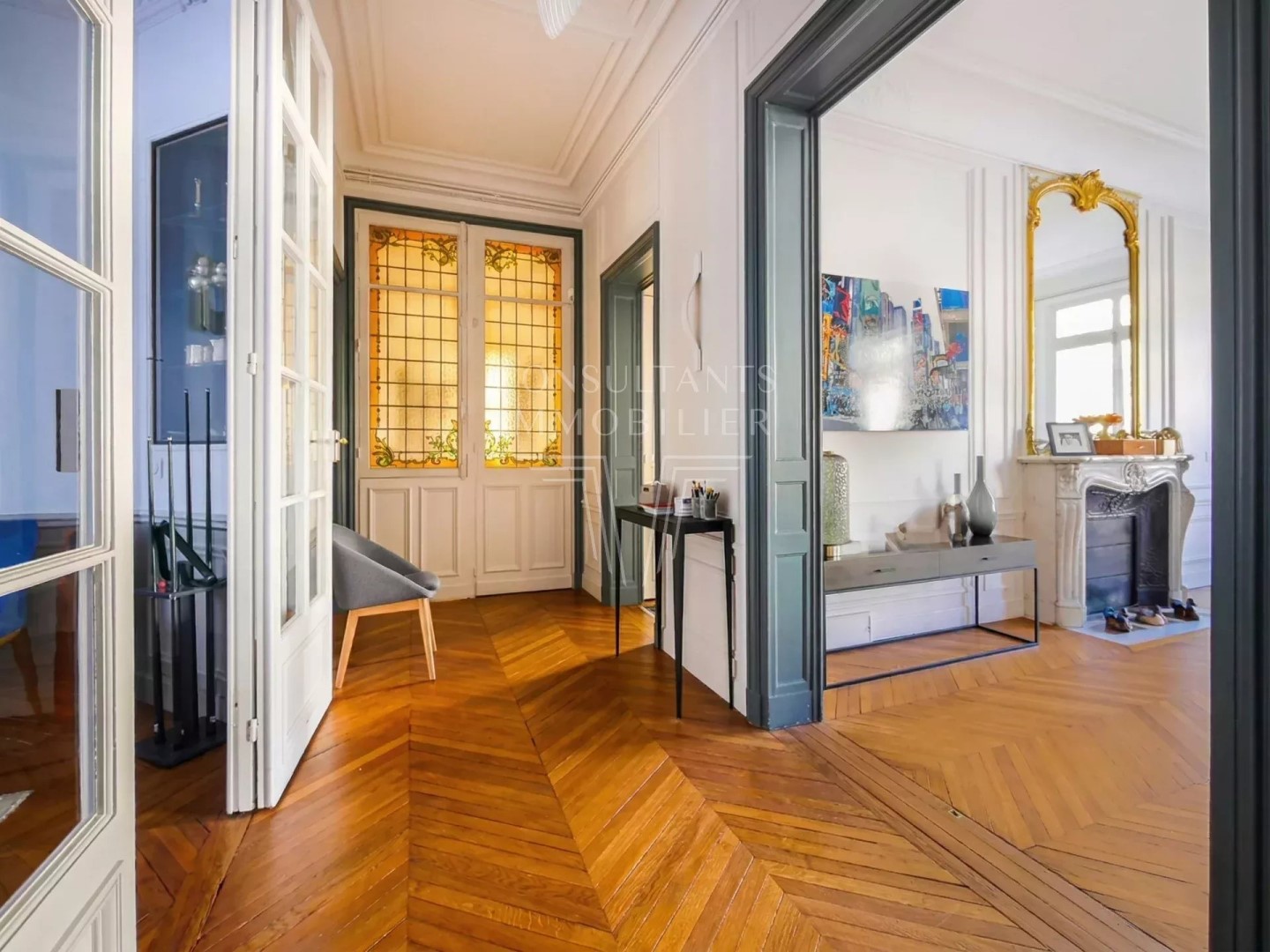 SOLE AGENT. PARIS 16th. SUNBATHED HAUSMANNIAN APARTMENT. FOUR BEDROOMS. CONTINUOUS BALCONY WITH NO FACONG NEIGHBOURS. On the second floor - third level -, of a magnificent Haussmannian freestone building with sumptuous common areas, and a caretaker : Four-bedroom apartment benefiting from 3.40 m ceiling height and a south-facing continuous balcony. This Parisian property includes an entrance hall, a large living/reception room opening onto a sunbathed balcony with no facing neighbours, a dining room, a kitchen/dining room, four bedrooms, three shower rooms with toilet, a separate toilet, a laundry room, and ample storage. This apartment retains all the period charm with its herringbone parquet flooring, and moldings. With two cellars. A 17;26 sqm one-room apartment (for staff or a student) is available as an option. Ideally located near the Janson de Sailly and Paris-Dauphine University CONSULTANTS IMMOBILIER LUXURY REAL ESTATE PARIS