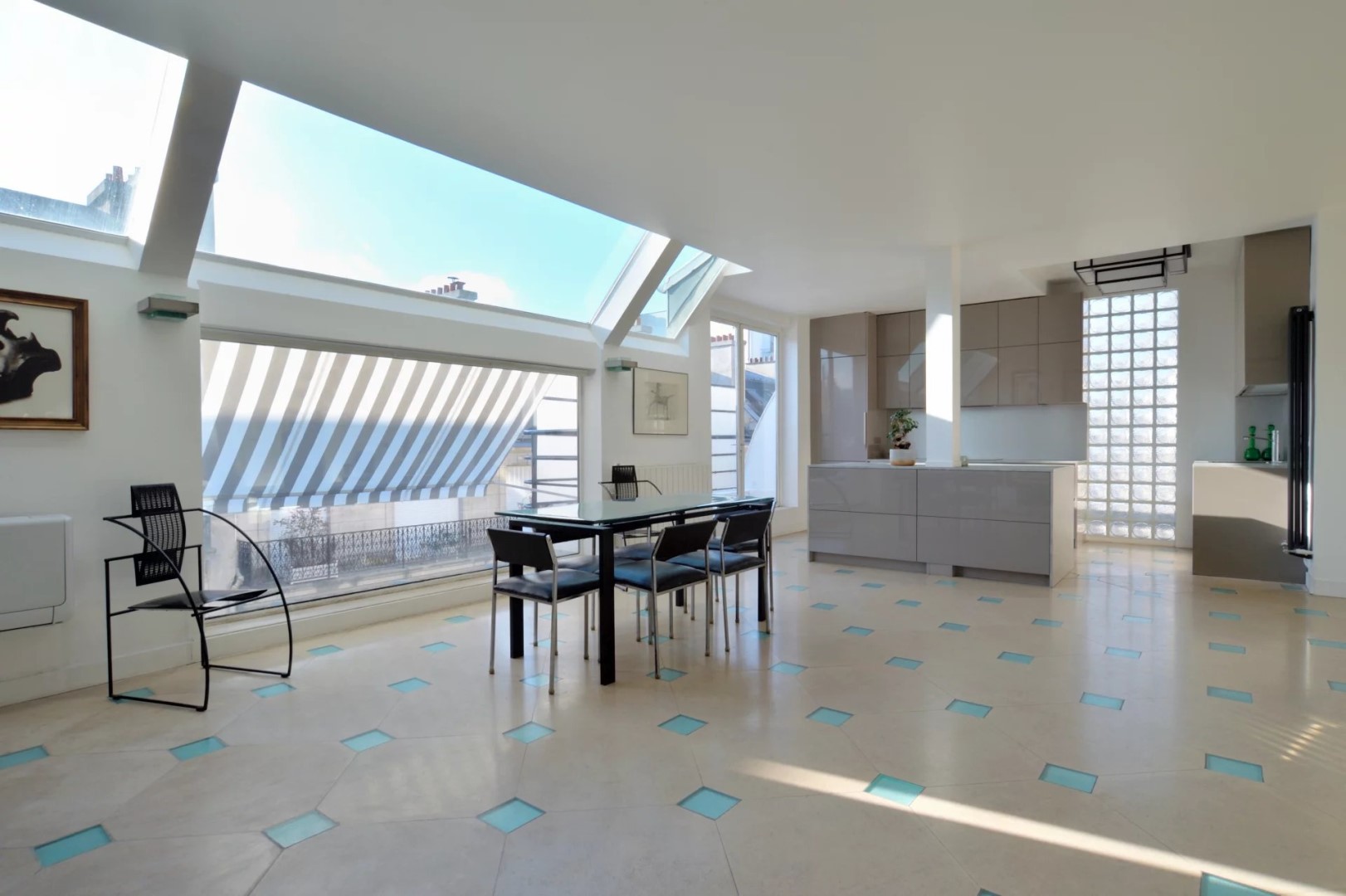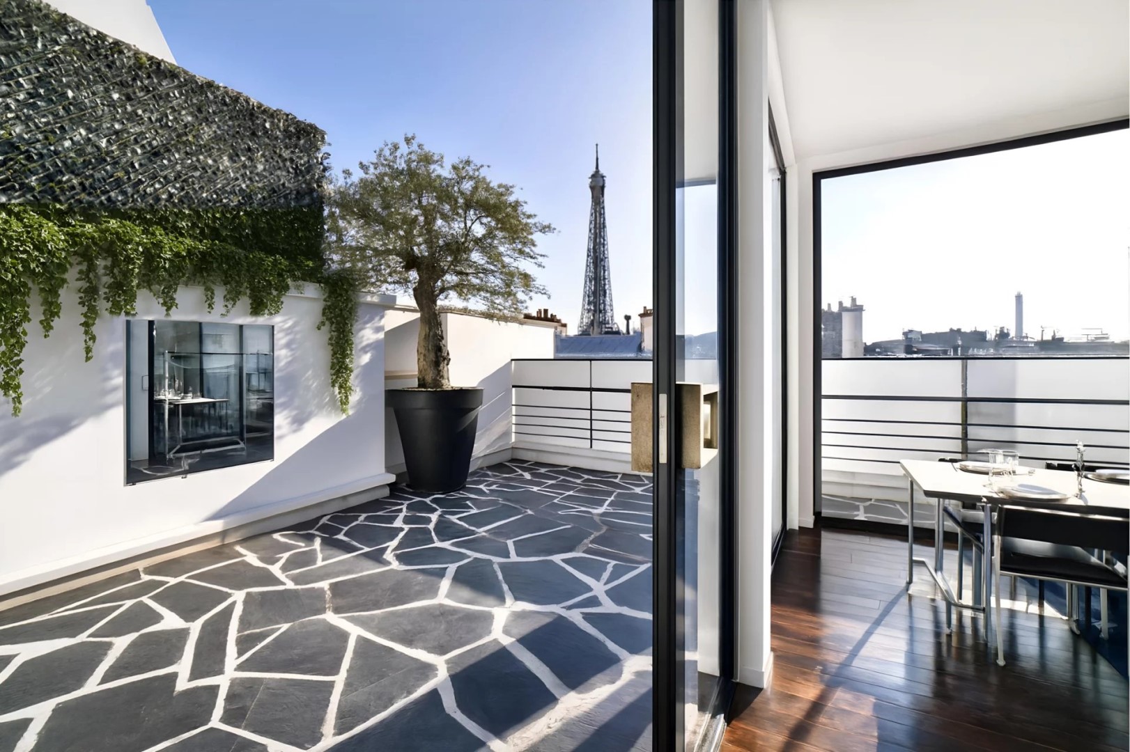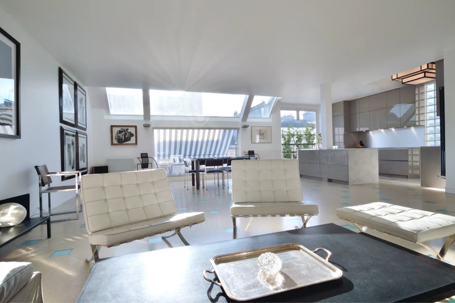 A stone’s throw from the Trocadero square, on the top 3 floors of a fine building with elevator of 1895, a most unusual, 229 sqm (2,465 sqft),ceiling height between 2.72m and 3.20m, ‘glass house’ triplex apartment designed in 1927 by a renowned architect and a famed interior designer, that hosted the most fashionable Parisian parties in the 30’s with guests of the like of Coco Chanel, Jean Cocteau and Man Ray, opening onto 47 sqm of terrace and balconies, featuring: 5th (U.S. 6th) floor Entry 3 bedrooms, one with dressing room opening onto balcony 2 bathrooms 6th (U.S. 7th) floor Living room with open kitchen opening onto balcony Bedroom Bathroom 7th (U.S. 8th) floor Dining room surrounded by glass walls, opening onto a 32 sqm terrace Cellar in basement A parking space may be acquired at extra cost (€ 80,000)