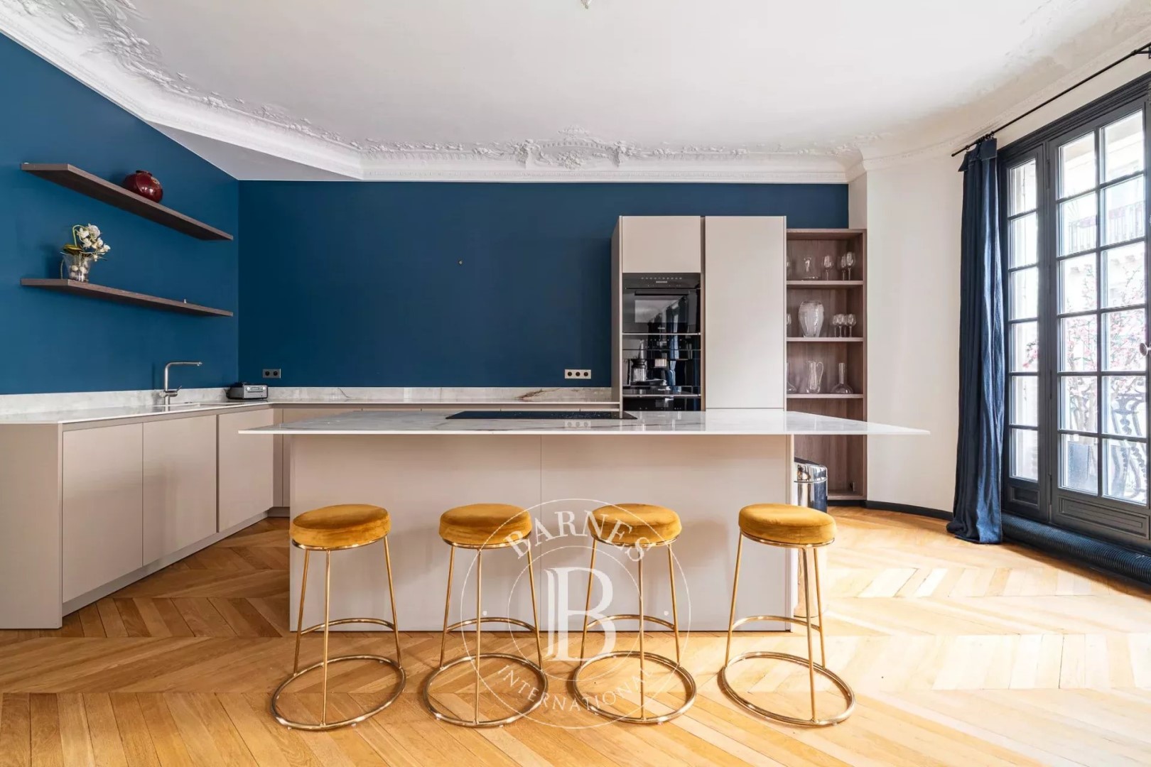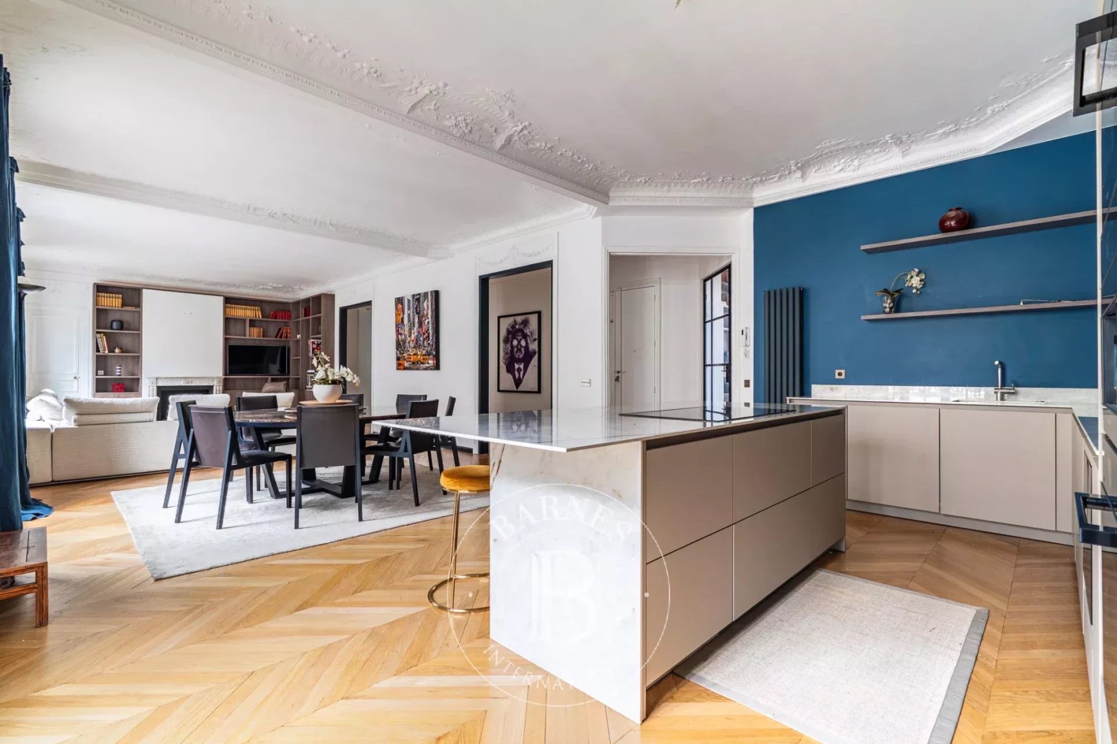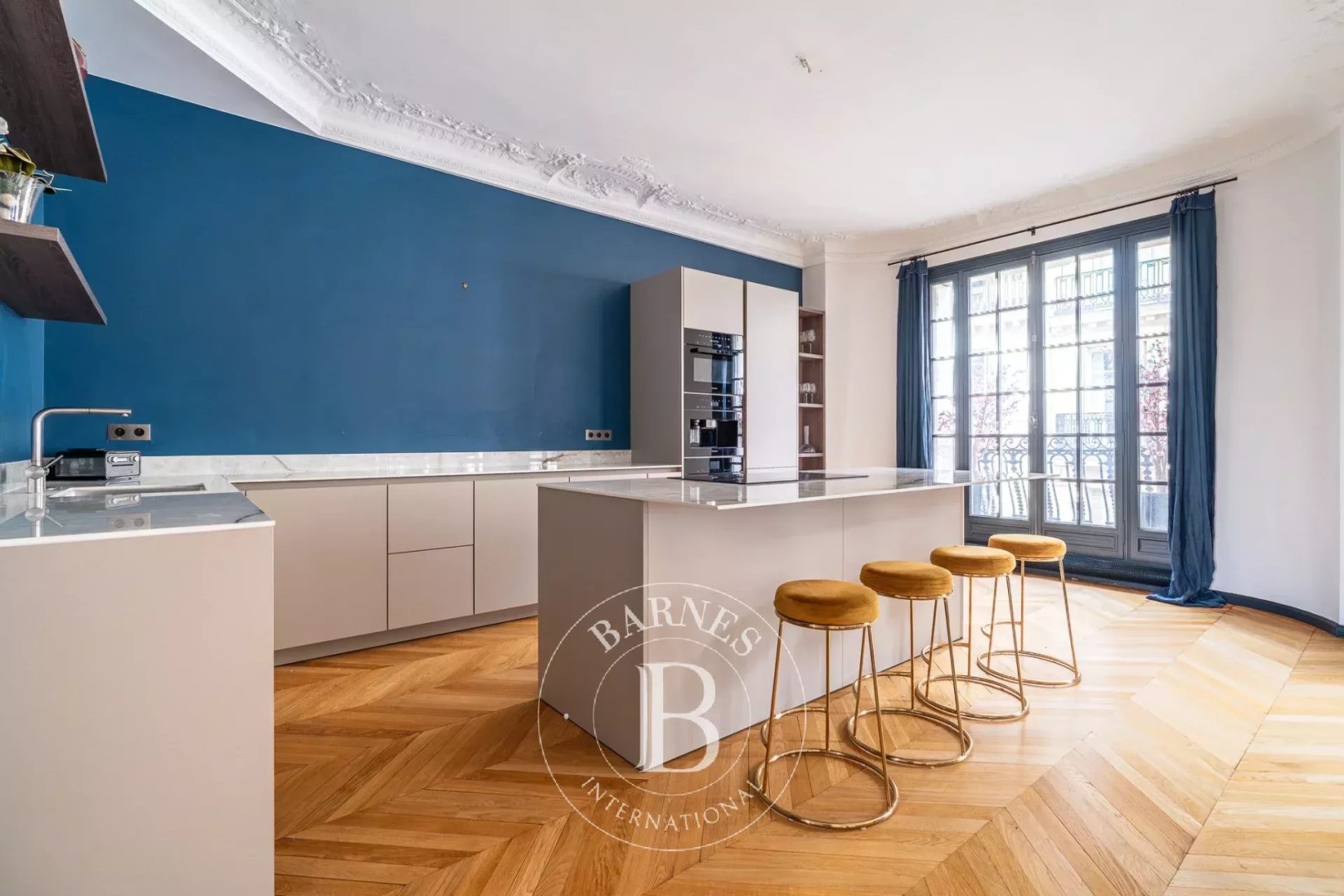 Located on the 4th floor of a corner building dating from 1900, this apartment offers 183.55 sqm of living space. Quiet and very bright (south and west facing), it proposes spacious rooms and a high-end renovation that has preserved its original charm (parquet flooring/moldings/fireplaces). The layout is perfectly arranged: a beautiful entrance gallery leads to a triple reception room comprising an open-plan kitchen, living room, and dining room and an office. It leads then to the night space including a master suite with dressing room, shower room, and toilet; two further bedrooms with storage; a bathroom/shower room; a laundry room; and a guest toilet. Close to shops and schools. Janson de Sailly school district. Two cellars and a parking complete the property. Property subject to co-ownership regulations. Fees payable by the buyer amount to €100,000 including VAT (3.5%), resulting in a net price to the seller of €2,790,000.