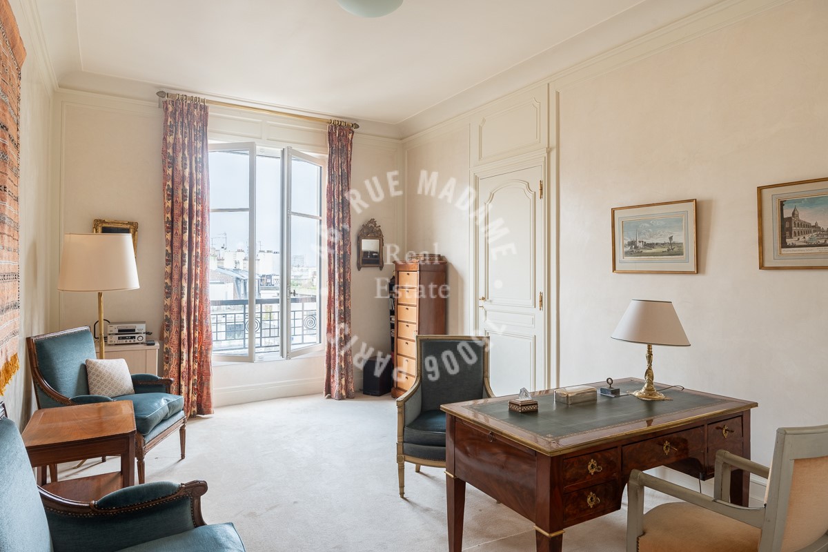 In a quiet environment, this apartment220 m² (about 2365 ft²), built in 1930, in a building of 8 floors comprises 7 rooms including 4 bedrooms and 2 bathrooms. It is provided with dining room, with a Fitted separate kitchen, with a terrace and with a cellar. It's located on the 5th floor with a lift. Heating : Collective radiator. Others : intercom, digicode. Fees : 3.448276.
