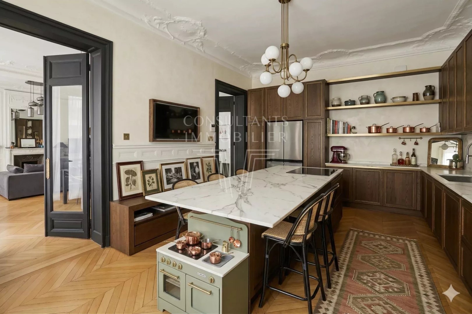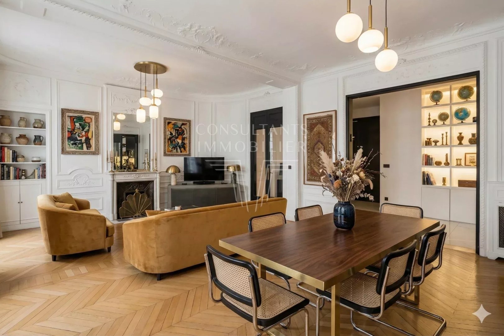 This apartment172 m² (about 1849 ft²), built in 1900, in a building of 8 floors comprises 7 rooms including 4 bedrooms and 2 bathrooms. It is provided with a living room, with a None and with a cellar. It's located on the 2nd floor with a lift. Heating : Collective gaz radiator. Others : digicode, guard, fireplace, cable television. Fees : 3.704.