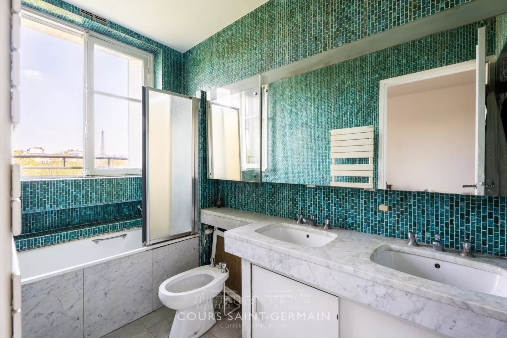 With an open view and east exposure this apartment195.2 m² (about 2098 ft²), built in 1930, in a building of 7 floors contains 7 rooms including 4 bedrooms, 1 bathroom and 1 toilet. It is equipped with a living room, with a None, with a balcony, with a cellar17.5 m² (about 188 ft²) and with a parking lot. It's located on the 6th floor with a lift. Heating : Collective gaz radiator. Others : intercom, digicode, guard, fireplace, cable television. Fees : 3.901. This text is an automatic translation.