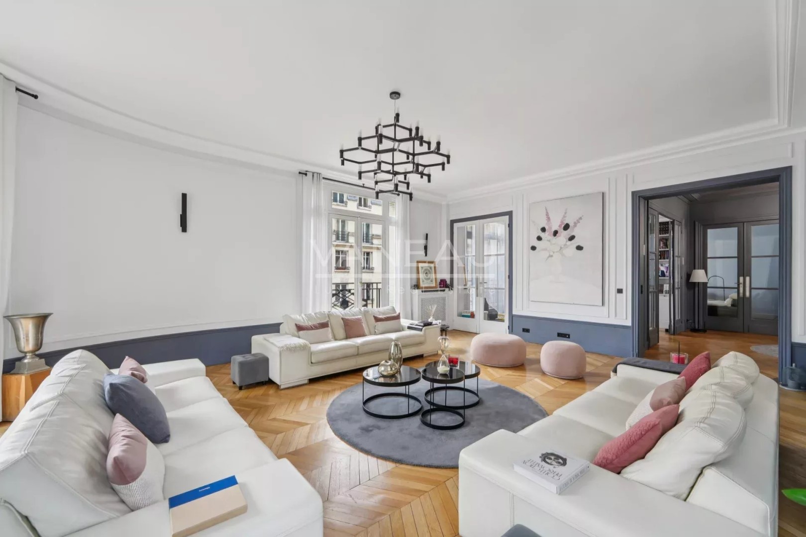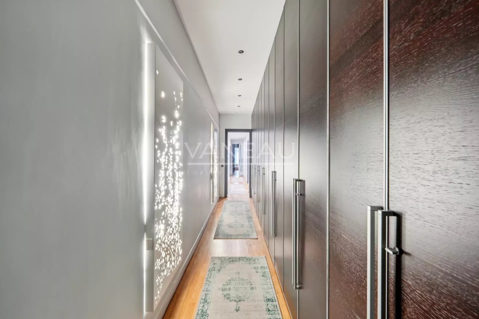 In a superb Art Deco corner building, ideally located in the heart of the 16th arrondissement, in one of the most sought-after areas, a rare apartment for sale, 332 sqm recently renovated and air-conditioned on a high floor, bathed in light, with full southern exposure and no facing building. This apartment strikes the perfect balance between family life and entertaining, with its generous volumes and ceiling heights of over 3m. It opens onto a star-shaped entrance hall leading to a double reception room, a vast dining room, an office, a TV lounge and a family kitchen with a pantry and laundry room. The sleeping quarters offer five bedrooms (possibility of six), five bathrooms and two separate toilets. Annexes include two cellars and a garage in the building for several vehicles (150.000 €).