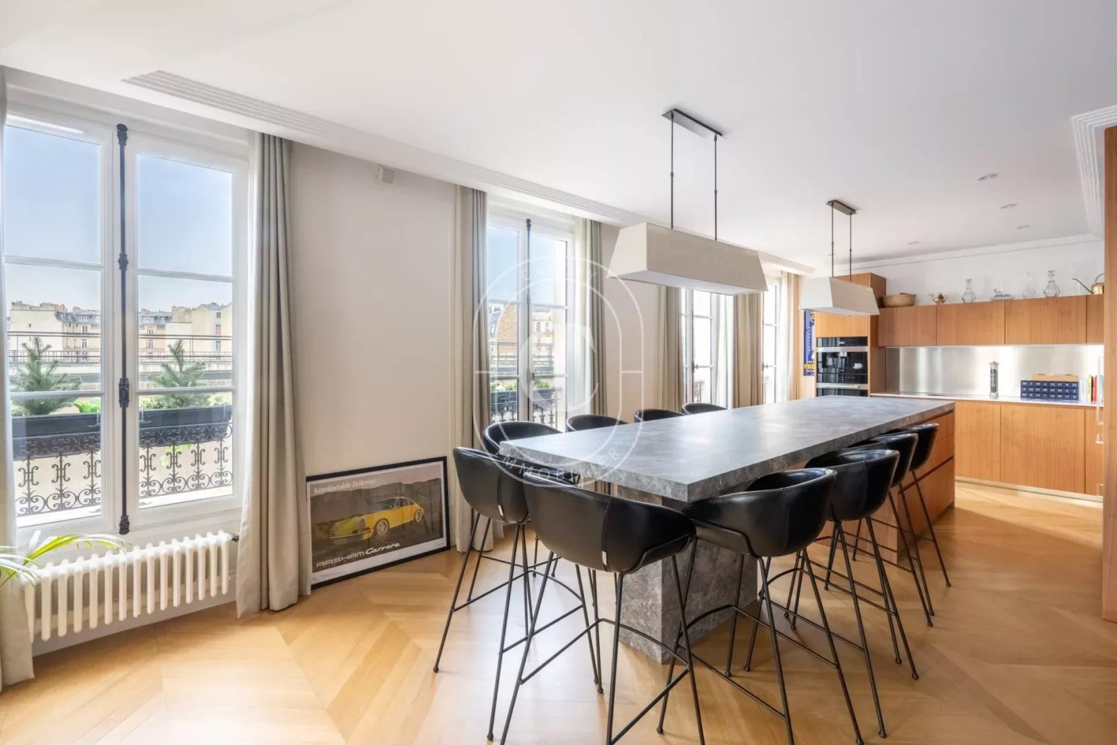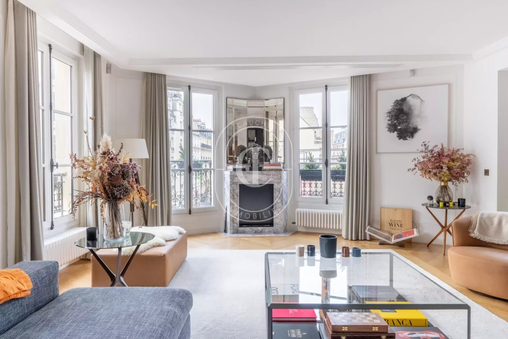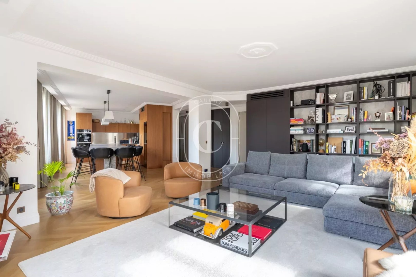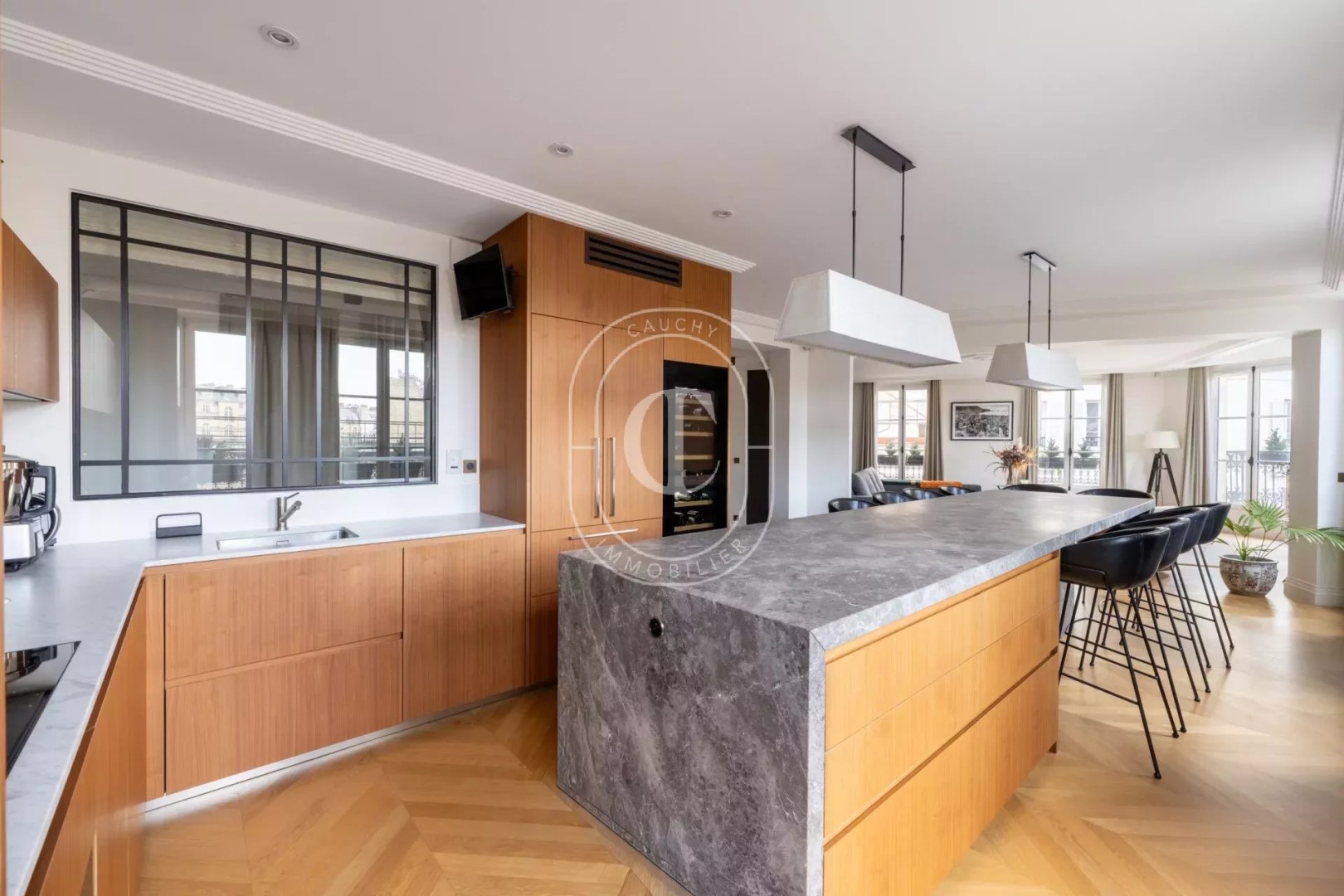 With an open view and west exposure this apartment160 m² (about 1720 ft²), built in 1880, in a building of 7 floors has 5 rooms including 3 bedrooms, 2 bathrooms and 2 toilets. It has a living room 35.28 m² (about 379 ft²), a Kitchen/dining room and a cellar. Totally renovated, it's located on the 4th floor with a lift. Heating : Individual gaz radiator. Others : digicode, parquet floor, fireplace, cable television.