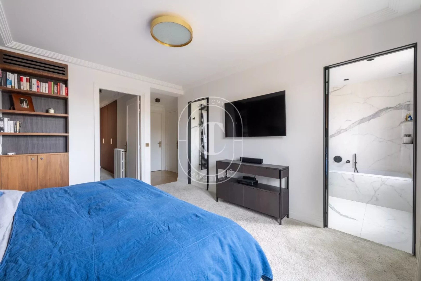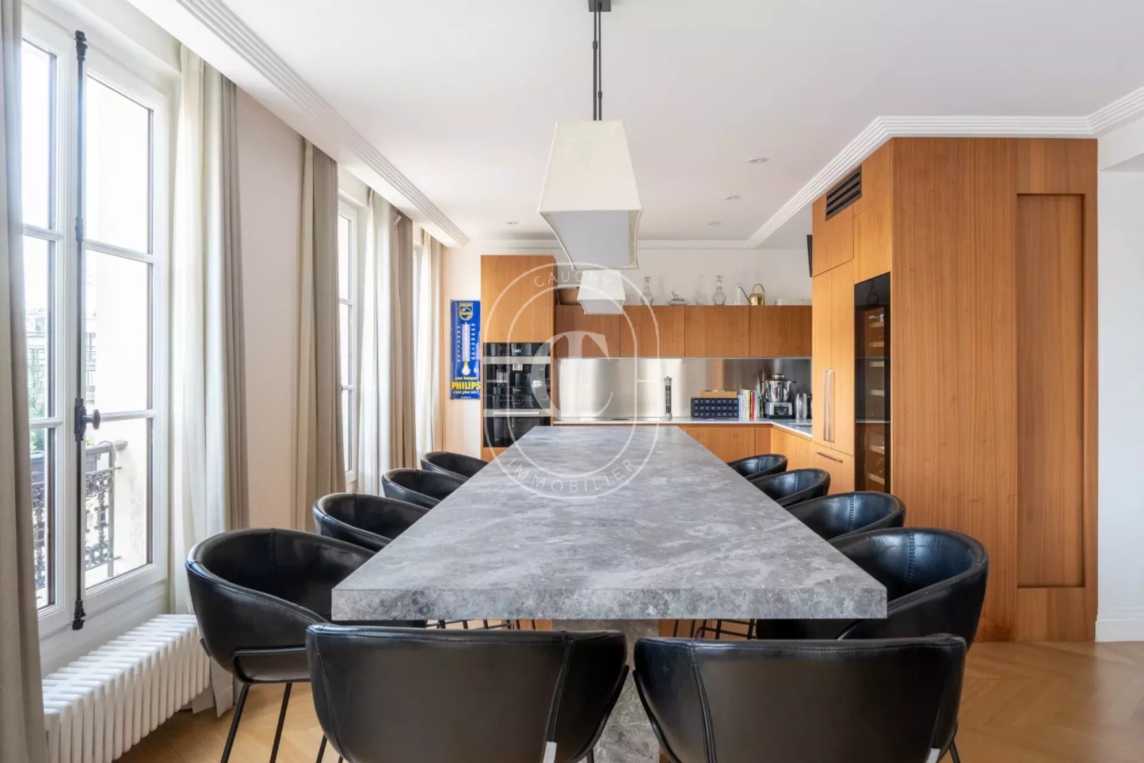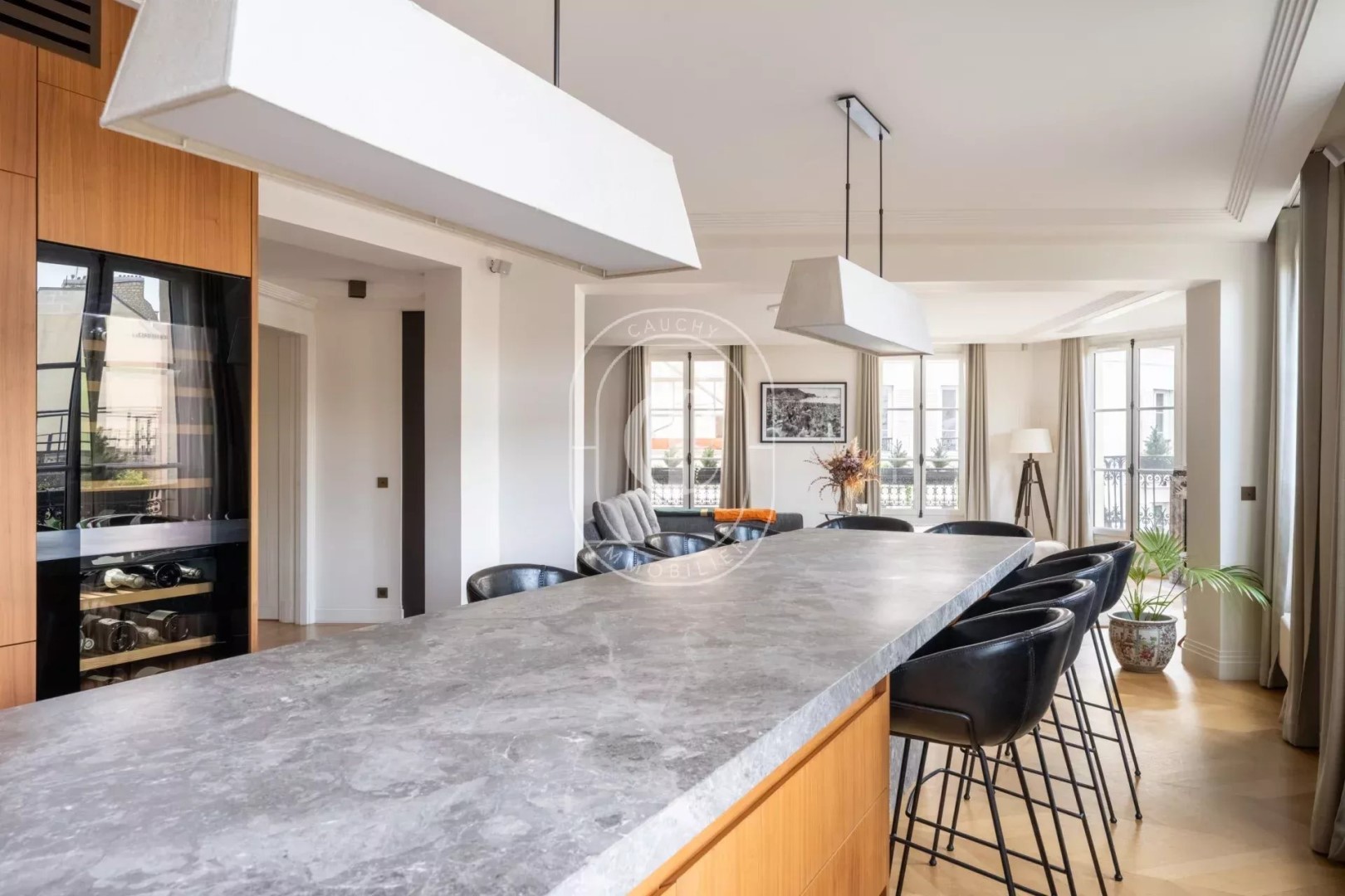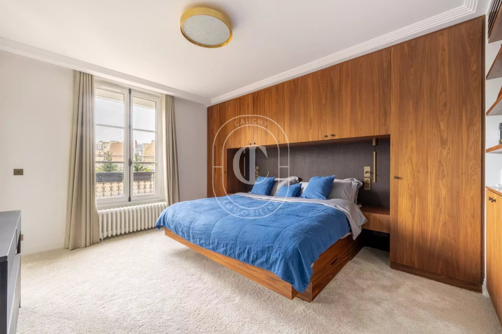 With an open view and west exposure this apartment160 m² (about 1720 ft²), built in 1880, in a building of 7 floors has 5 rooms including 3 bedrooms, 2 bathrooms and 2 toilets. It has a living room 35.28 m² (about 379 ft²), a Kitchen/dining room and a cellar. Totally renovated, it's located on the 4th floor with a lift. Heating : Individual gaz radiator. Others : digicode, parquet floor, fireplace, cable television.