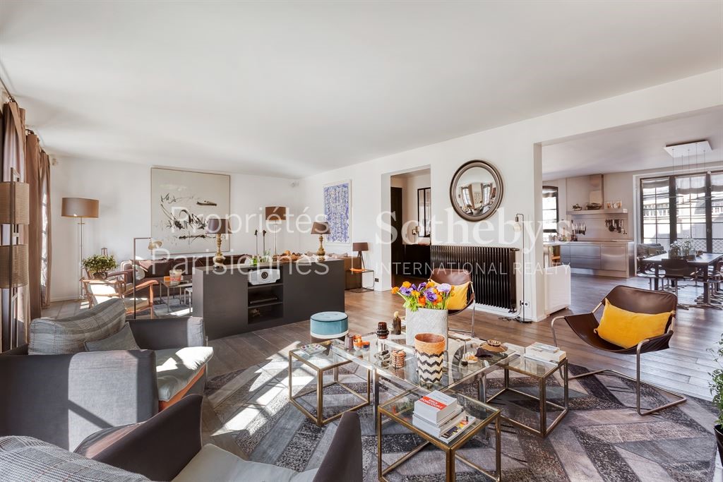 Close to the Trocadéro Gardens, located on the 4th floor with elevator access in a secure, luxury Haussmann-style building with a live-in caretaker, this elegant 273,30 m² apartment has been completely renovated by an architect in a contemporary style and opens onto a balcony with a view of the Eiffel Tower. <BR><BR>Facing south, this family home and reception property is composed as follows: an entrance hall leading to a beautiful living room comprising a double reception room with fireplace opening onto a continuous balcony, a fully fitted and equipped open kitchen, a master bedroom with its own bathroom and a spacious dressing room, three other bedrooms with three shower rooms, a laundry room and two toilets. <BR> <BR>In addition, there are two cellars, a 17.28 m² service studio, a 6.10 m² storage room, and a parking space in the courtyard. <BR><BR>This apartment combines old-world charm (parquet flooring, moldings, fireplace) with contemporary decor and features high ceilings.