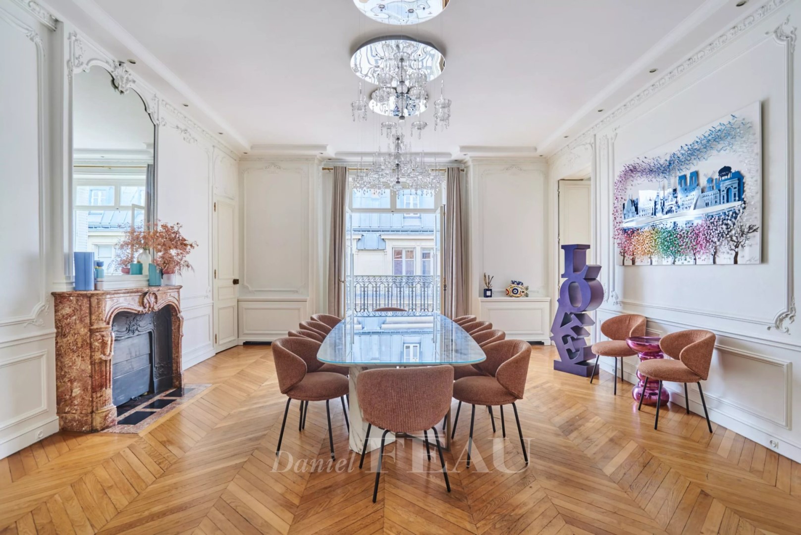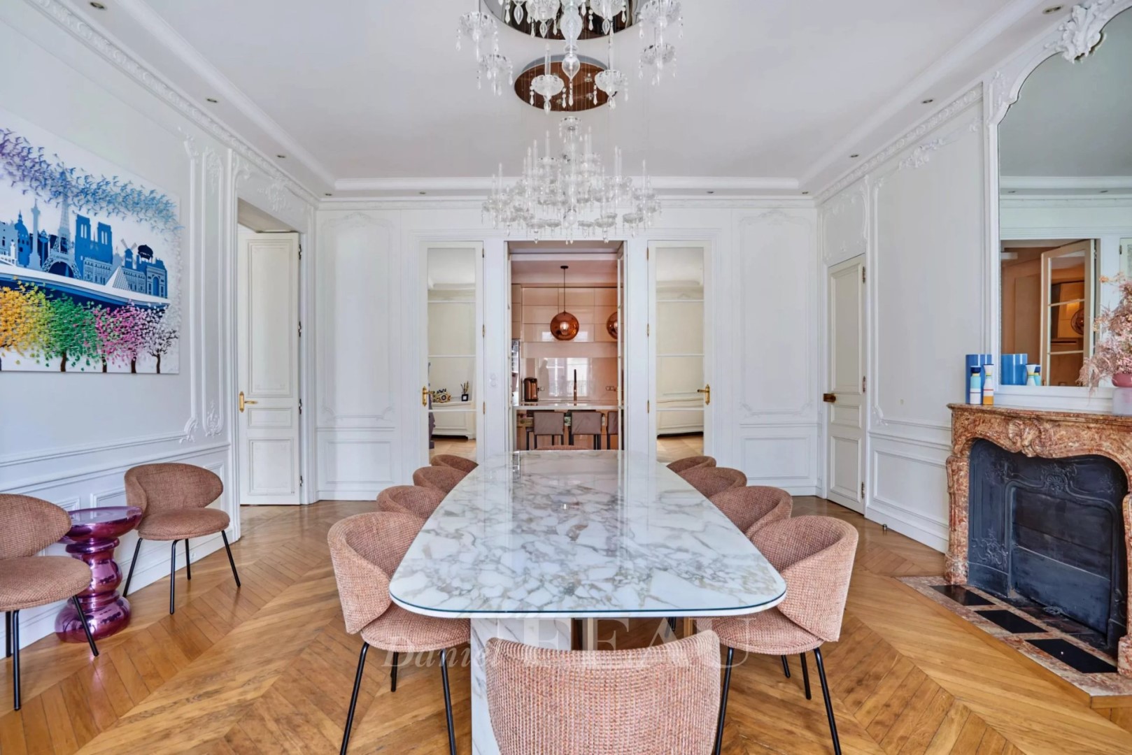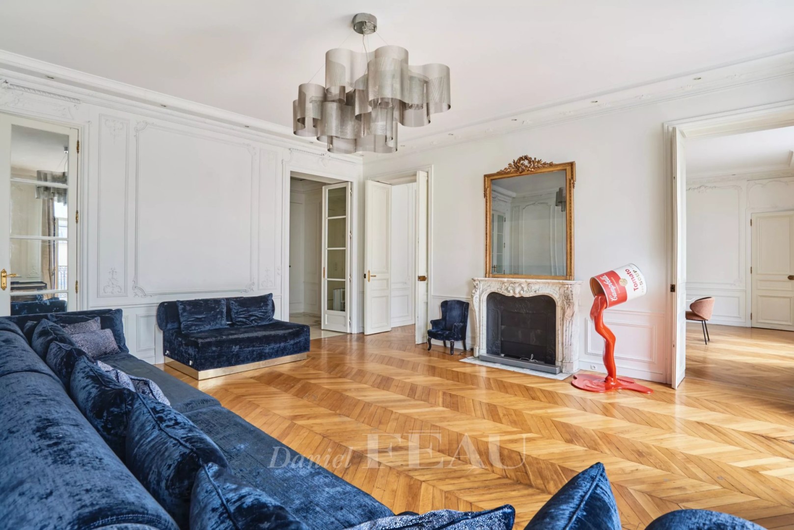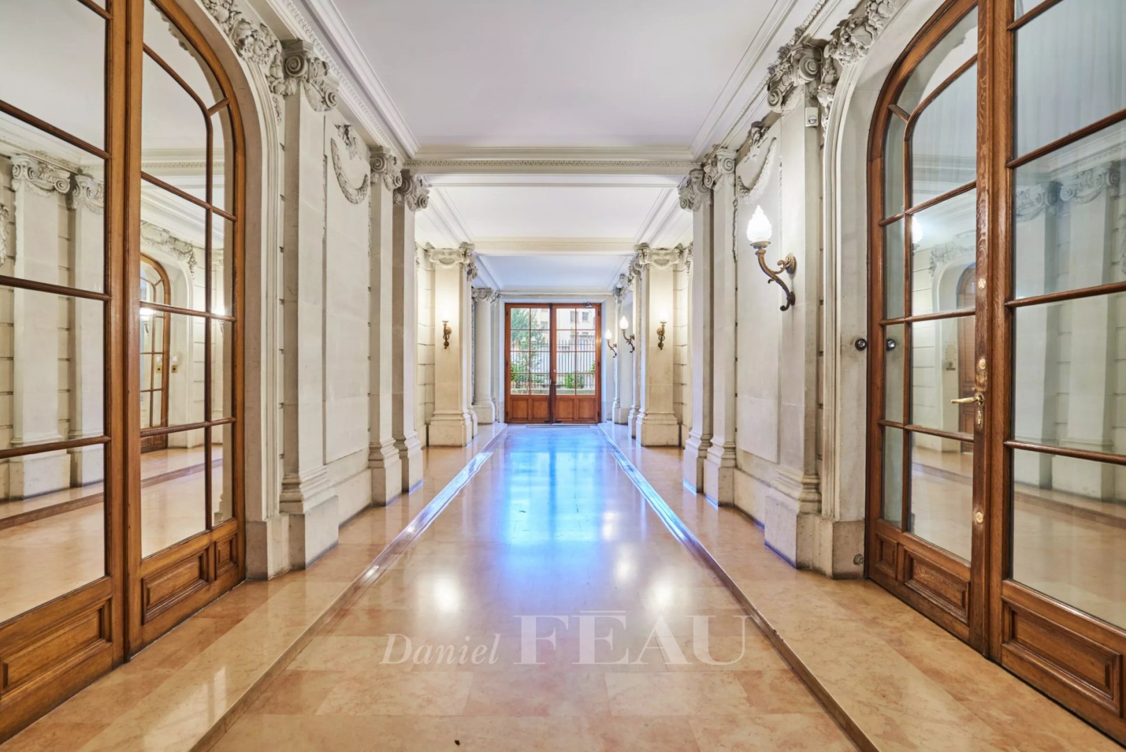 In a Haussmannian building with luxurious common areas, the fifth-floor apartment comprises an entrance hall, a living room, a dining room, a kitchen, a master bedroom with a dressing room and shower room, two further bedrooms, and a bathroom. A cellar is also included. Two maid's rooms on the sixth floor, which can be connected to the apartment via a (permitted) stairwell, and a nearby parking space are available in addition to the price.