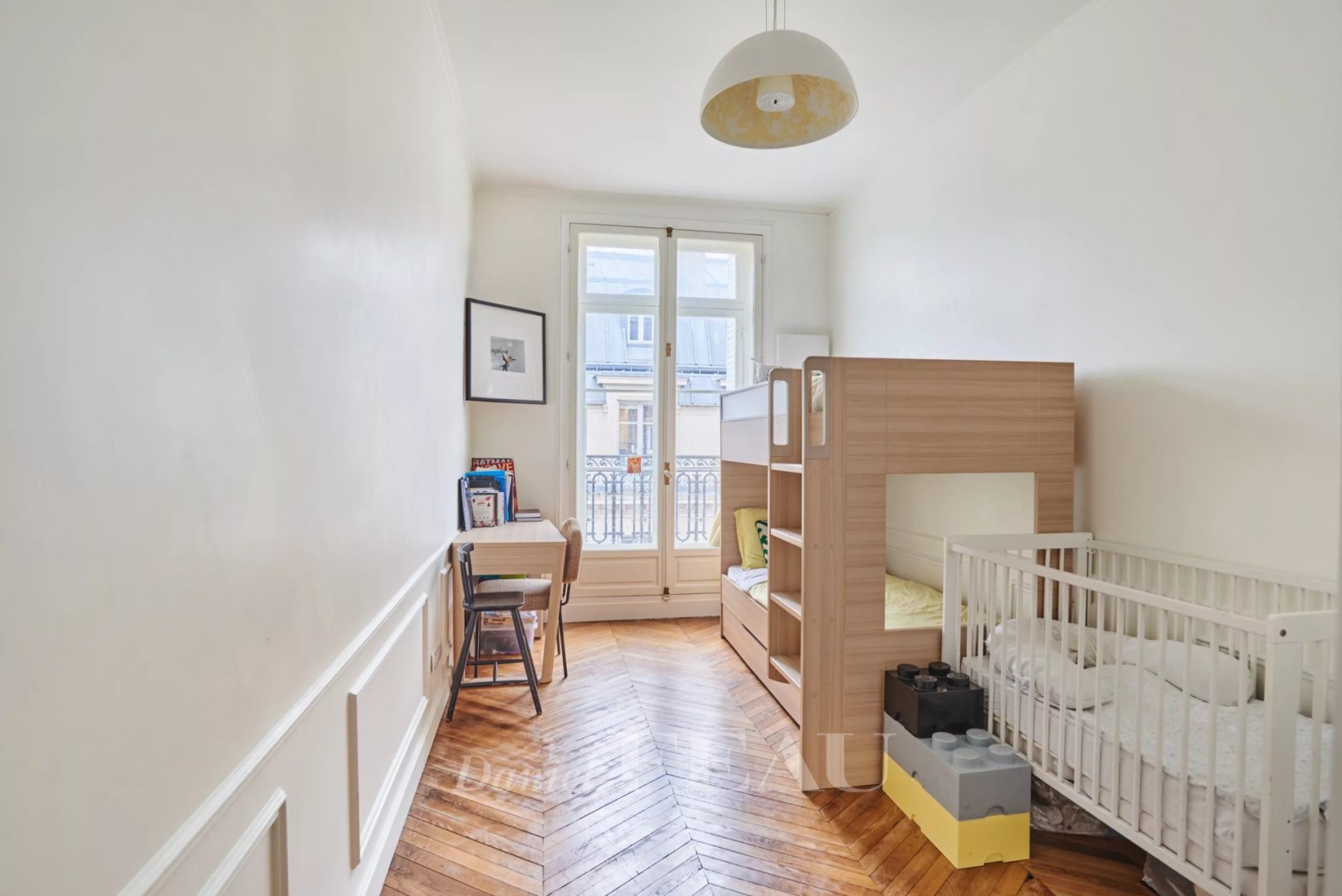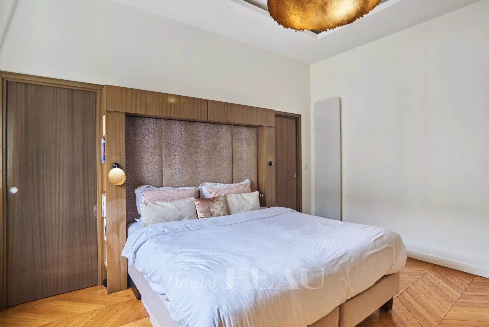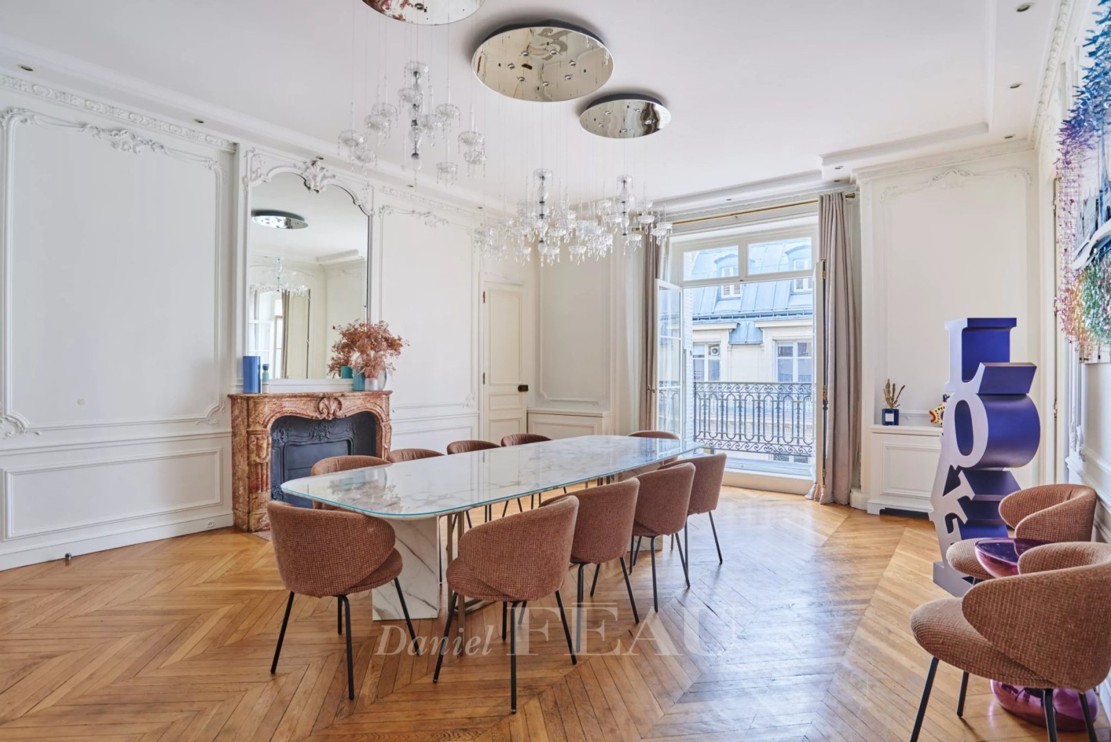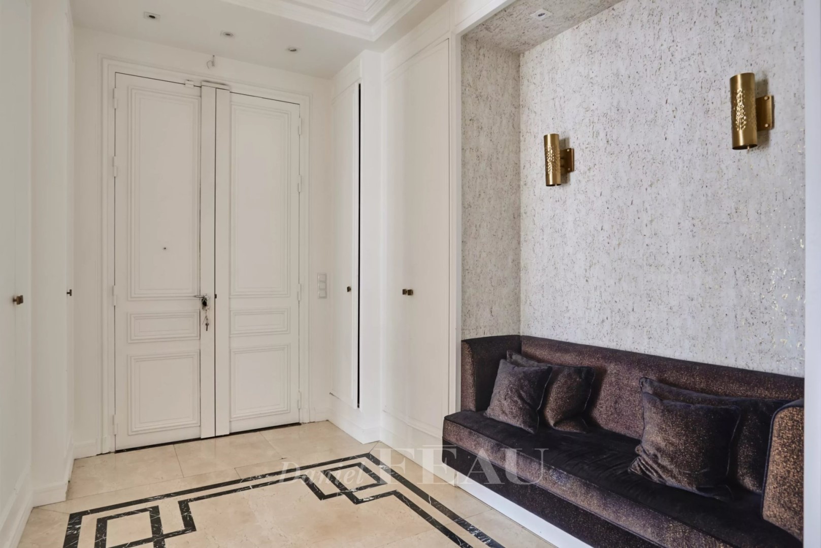 In a Haussmannian building with luxurious common areas, the fifth-floor apartment comprises an entrance hall, a living room, a dining room, a kitchen, a master bedroom with a dressing room and shower room, two further bedrooms, and a bathroom. A cellar is also included. Two maid's rooms on the sixth floor, which can be connected to the apartment via a (permitted) stairwell, and a nearby parking space are available in addition to the price.