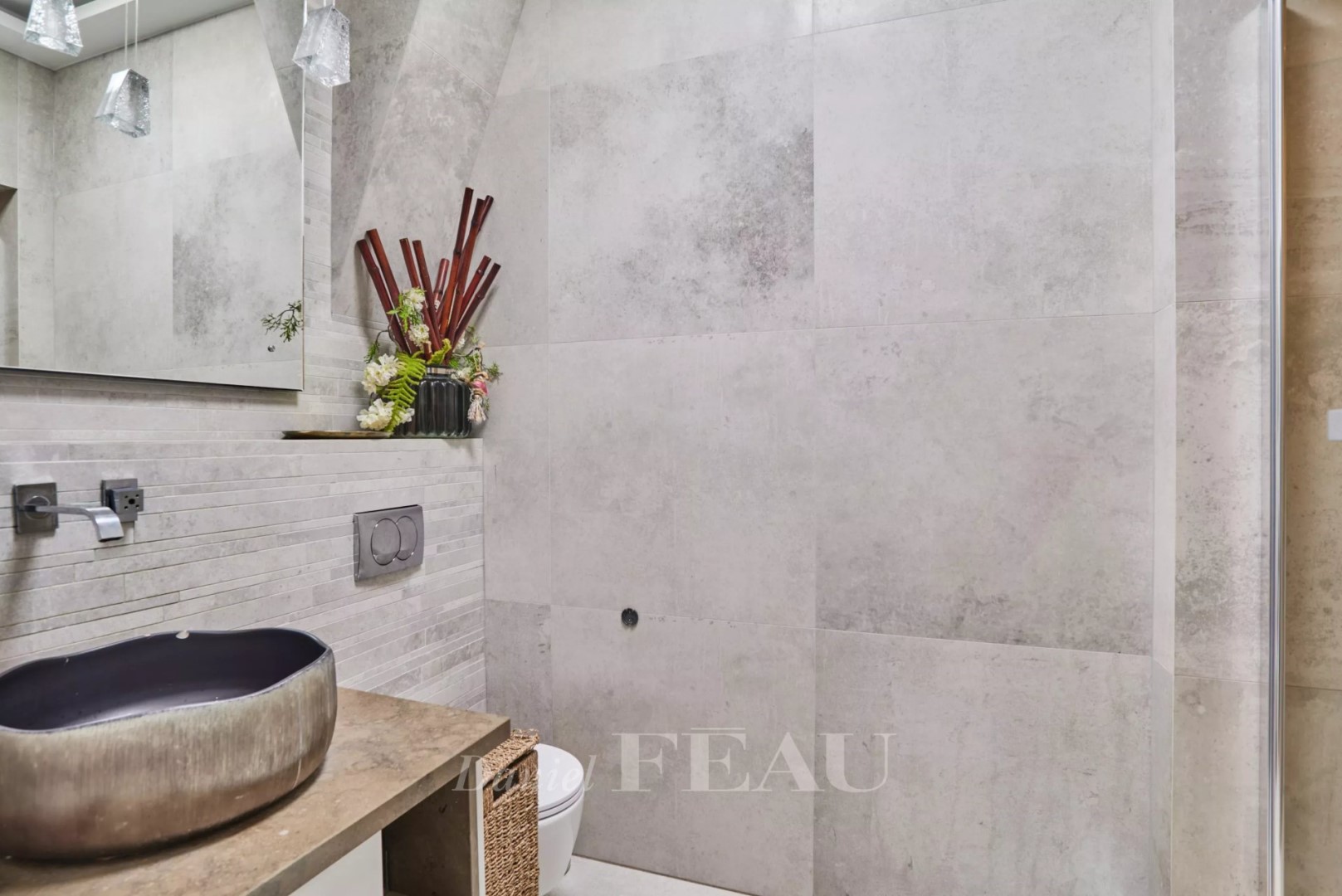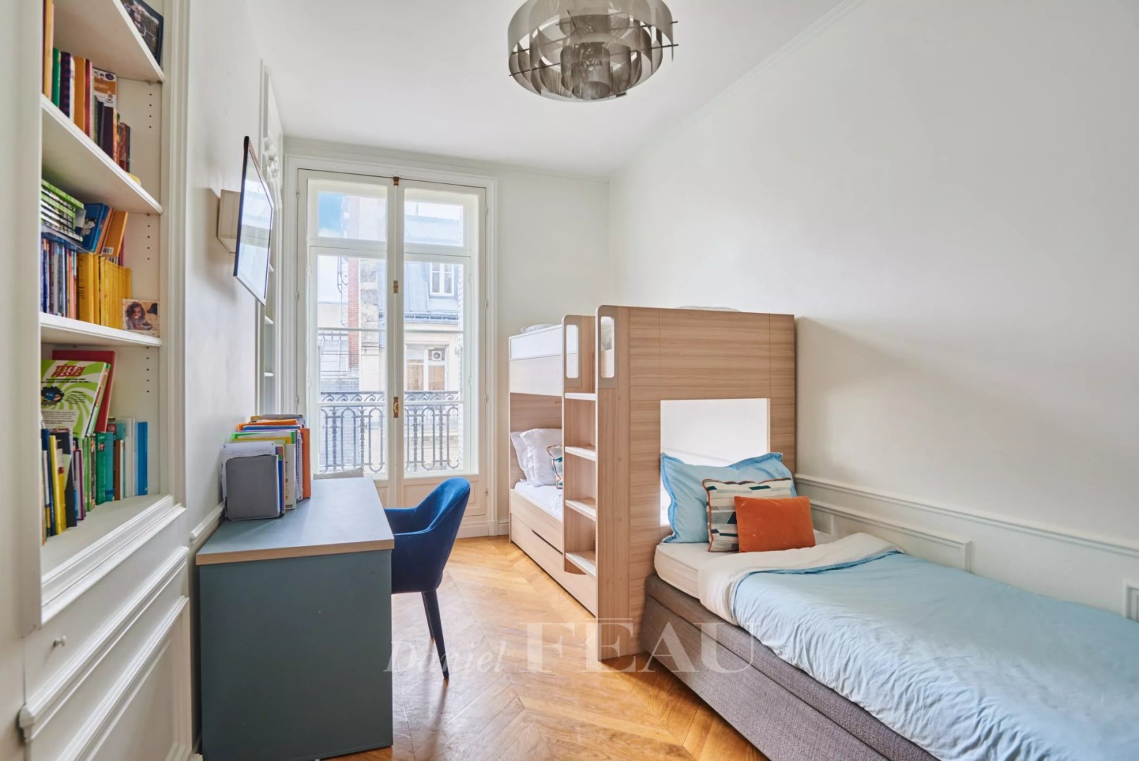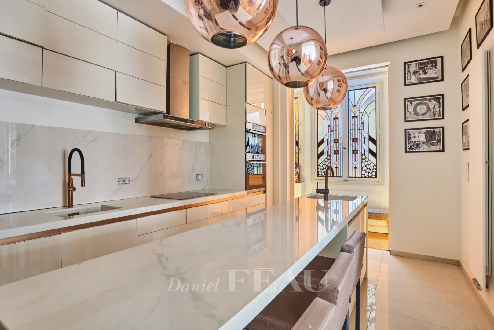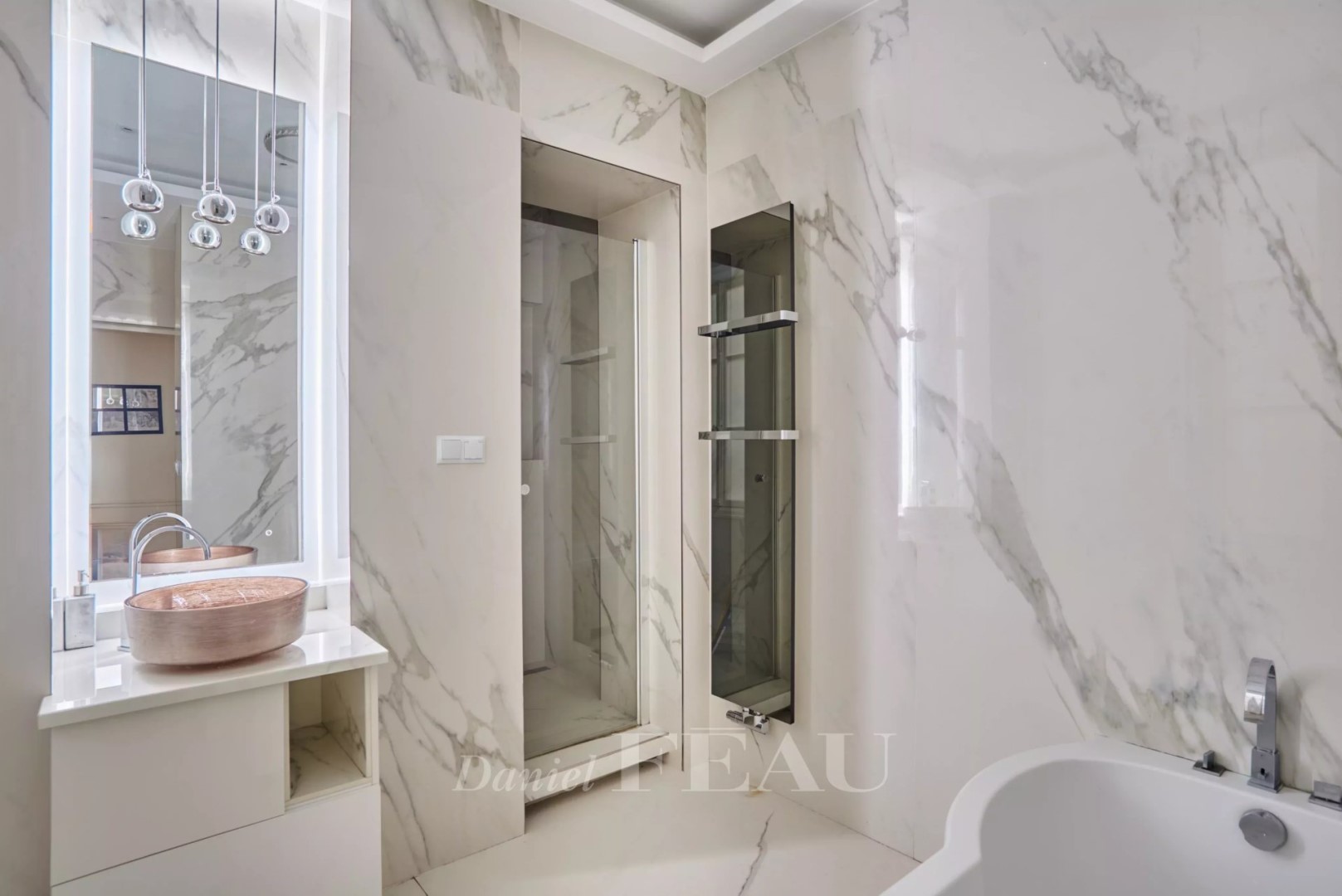 In a Haussmannian building with luxurious common areas, the fifth-floor apartment comprises an entrance hall, a living room, a dining room, a kitchen, a master bedroom with a dressing room and shower room, two further bedrooms, and a bathroom. A cellar is also included. Two maid's rooms on the sixth floor, which can be connected to the apartment via a (permitted) stairwell, and a nearby parking space are available in addition to the price.
