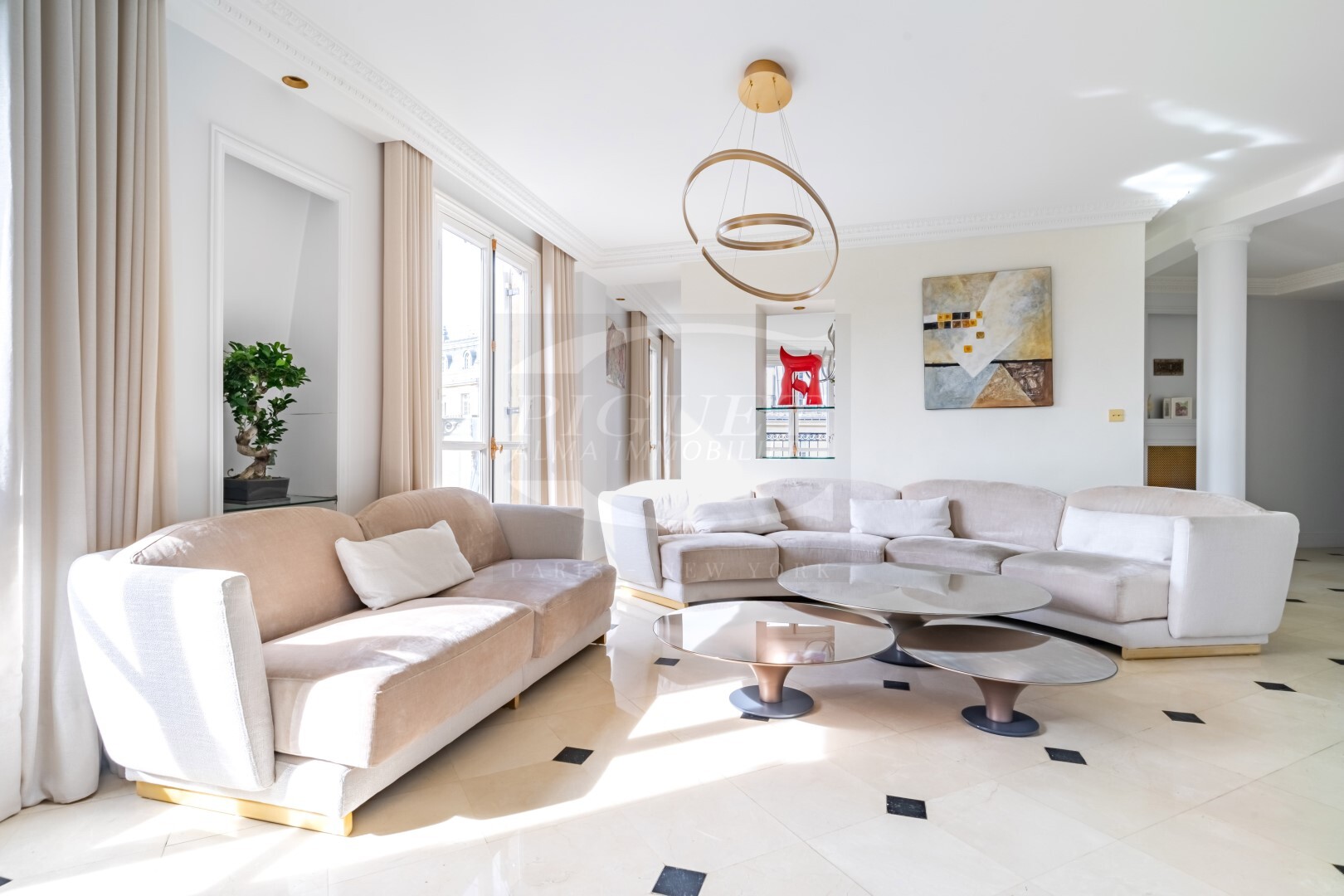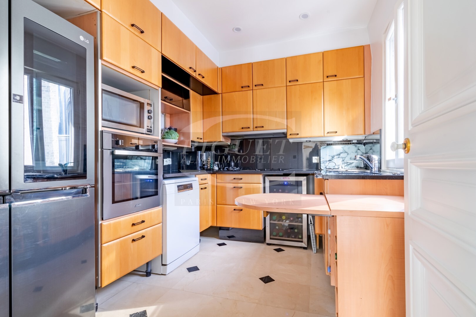In a quiet environment, with an open view and south-west exposure this apartment133 m² (about 1430 ft²), built in 1900, in a building of 6 floors contains 5 rooms including 2 bedrooms, 1 bathroom and 2 toilets. It is equipped with a living room, with dining room, with a Separate kitchen, with a balcony and with a cellar. It's located on the 6th floor with a lift. Heating : Gaz. Others : intercom, digicode, guard, parquet floor, fireplace. This text is an automatic translation.