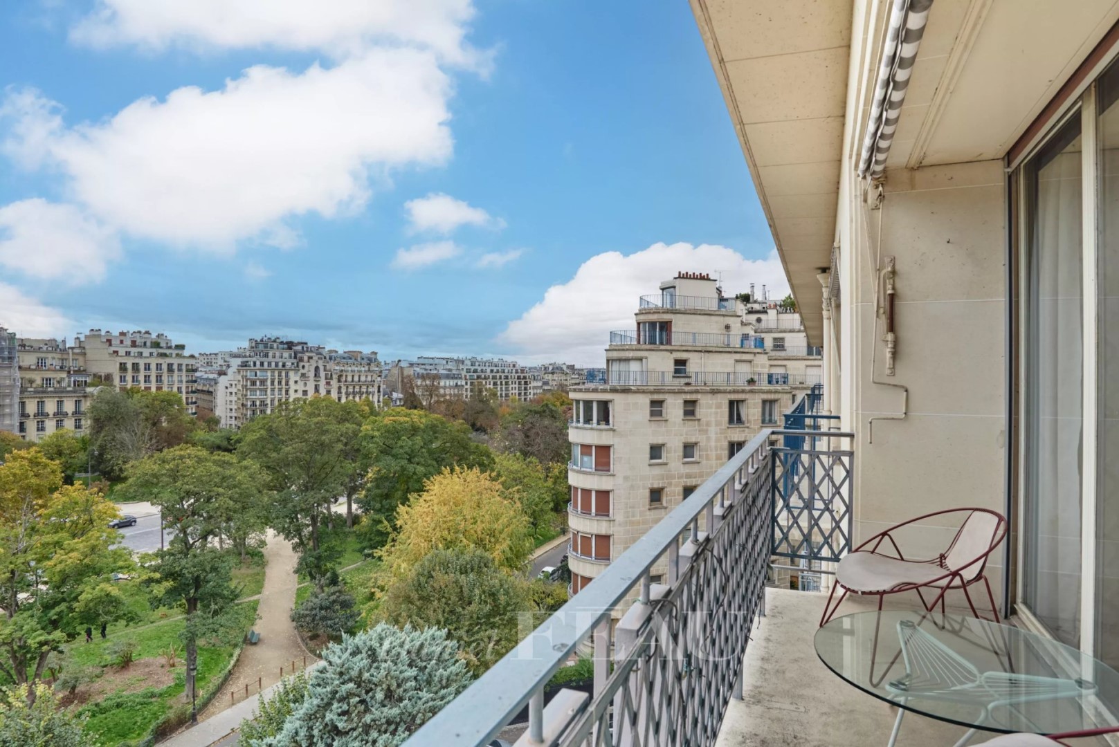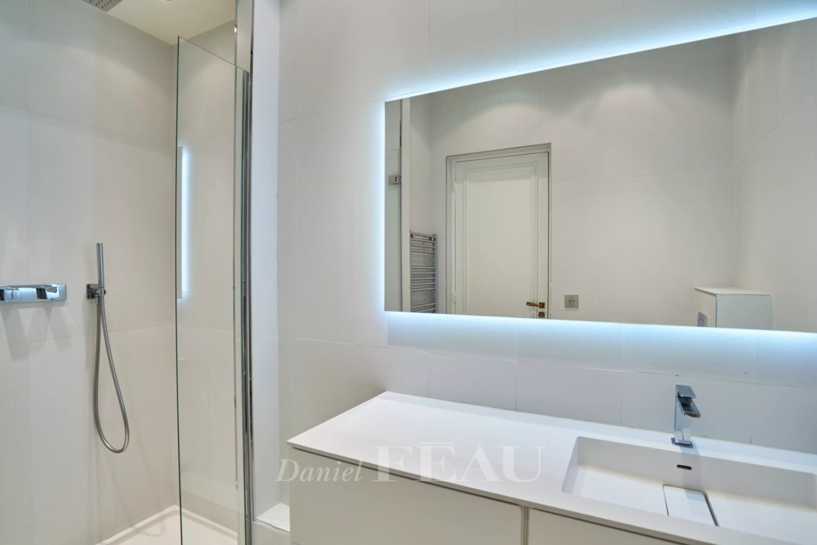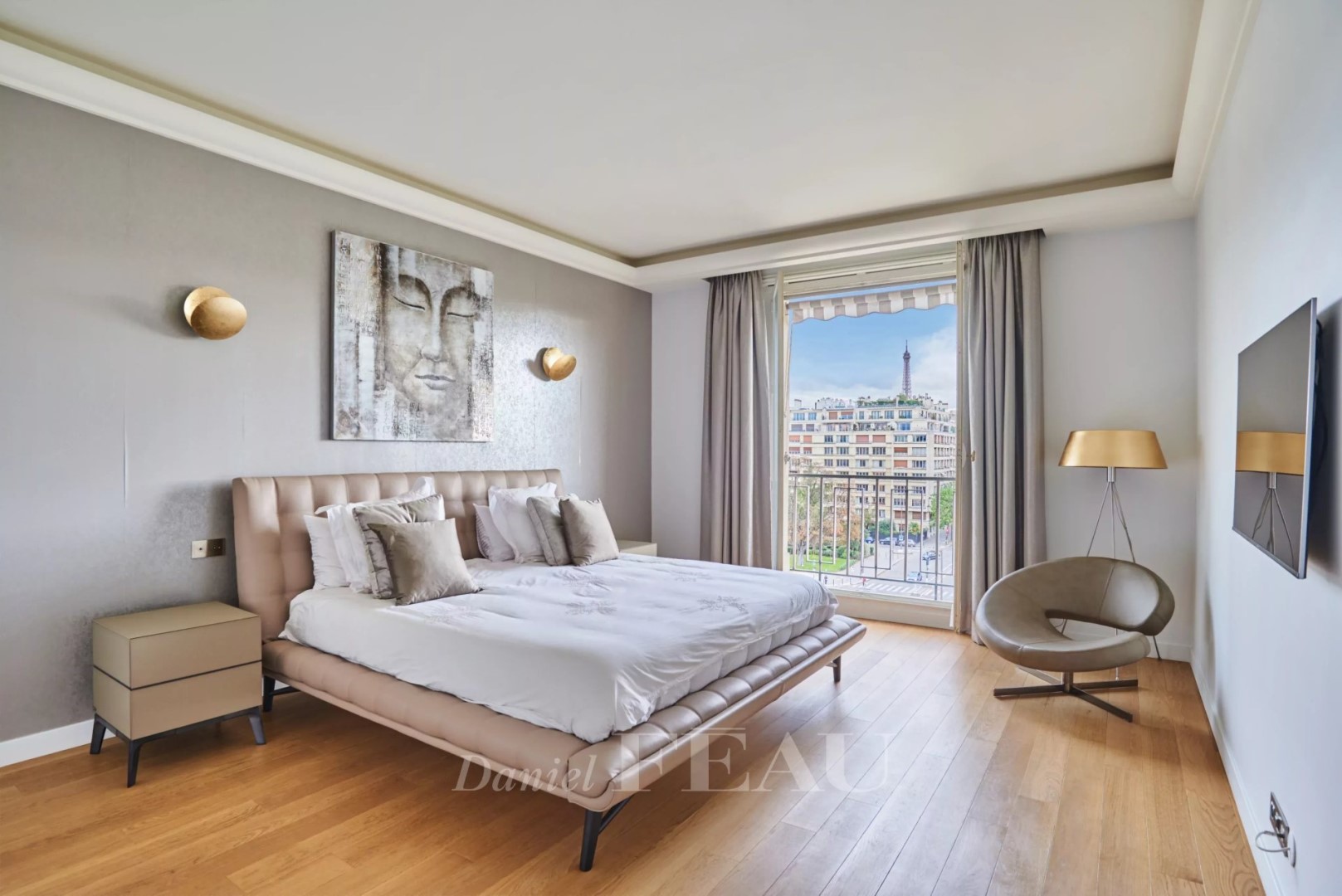 Prestigious Avenue Foch. This elegant apartment on the 6th floor of a recent building with a 24/24 caretaker benefits from a wide balcony commanding an open view of the Eiffel Tower. South-facing and air-conditioned, it includes an entrance hall, a living/reception room bathed in sunshine, a dining room/kitchen, a master suite with two shower rooms and a dressing room, and three further bedrooms with a shower room. With a 2-car lock-up garage and a cellar. A 21 sqm studio apartment in the building available to buy.