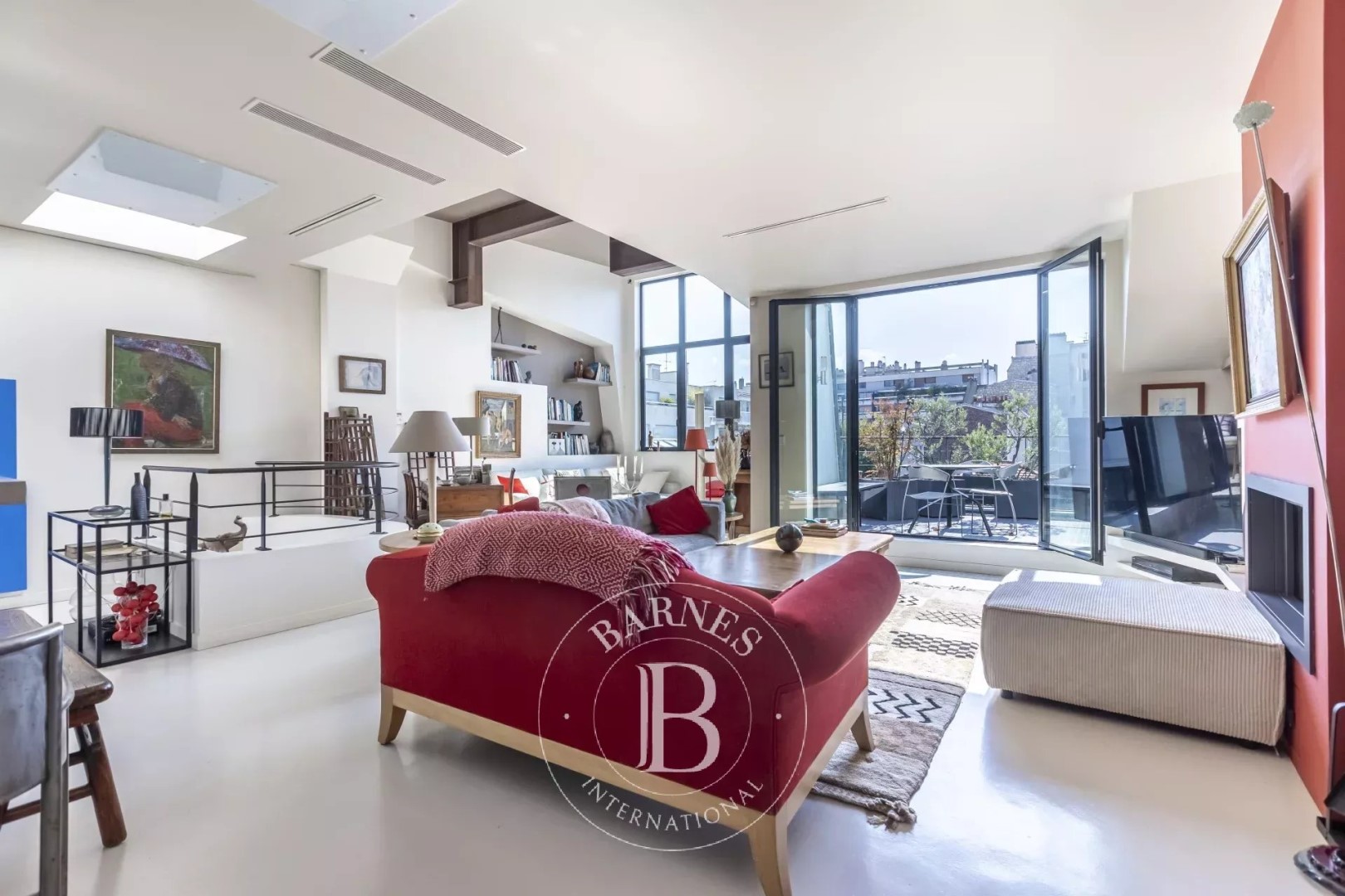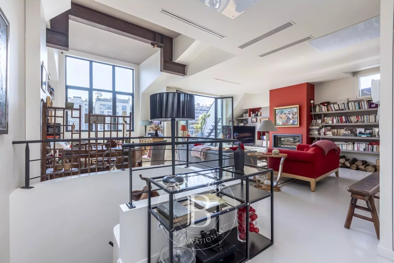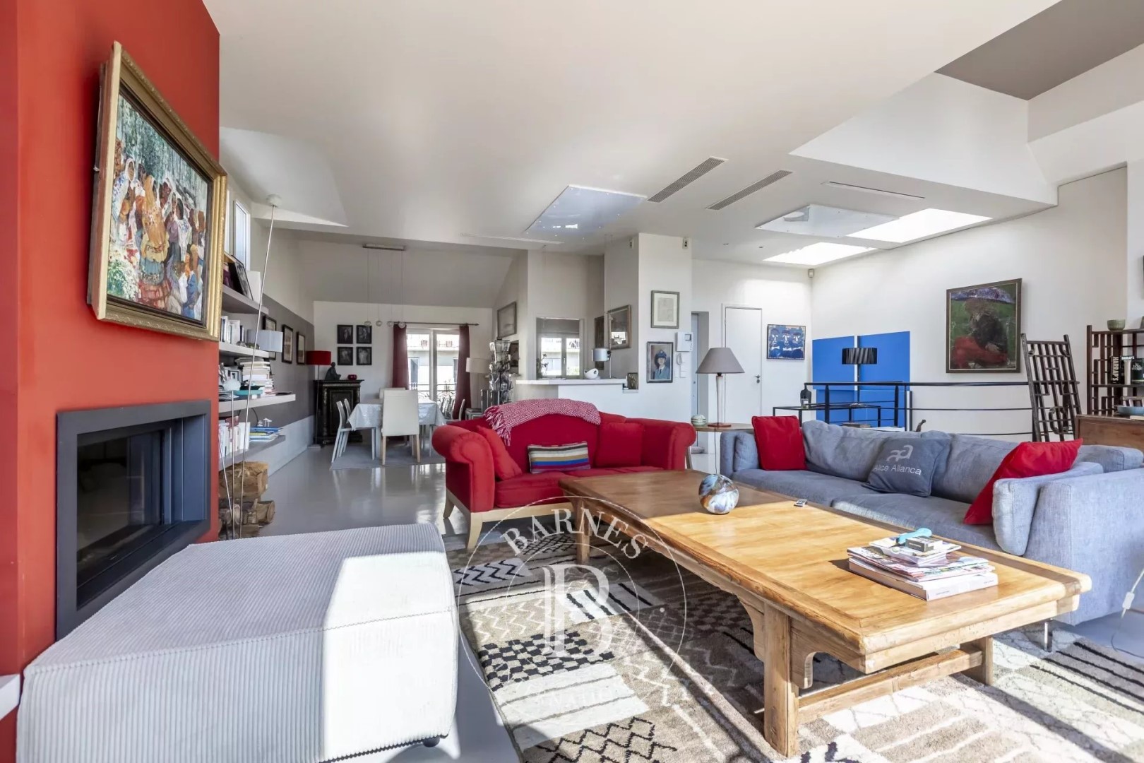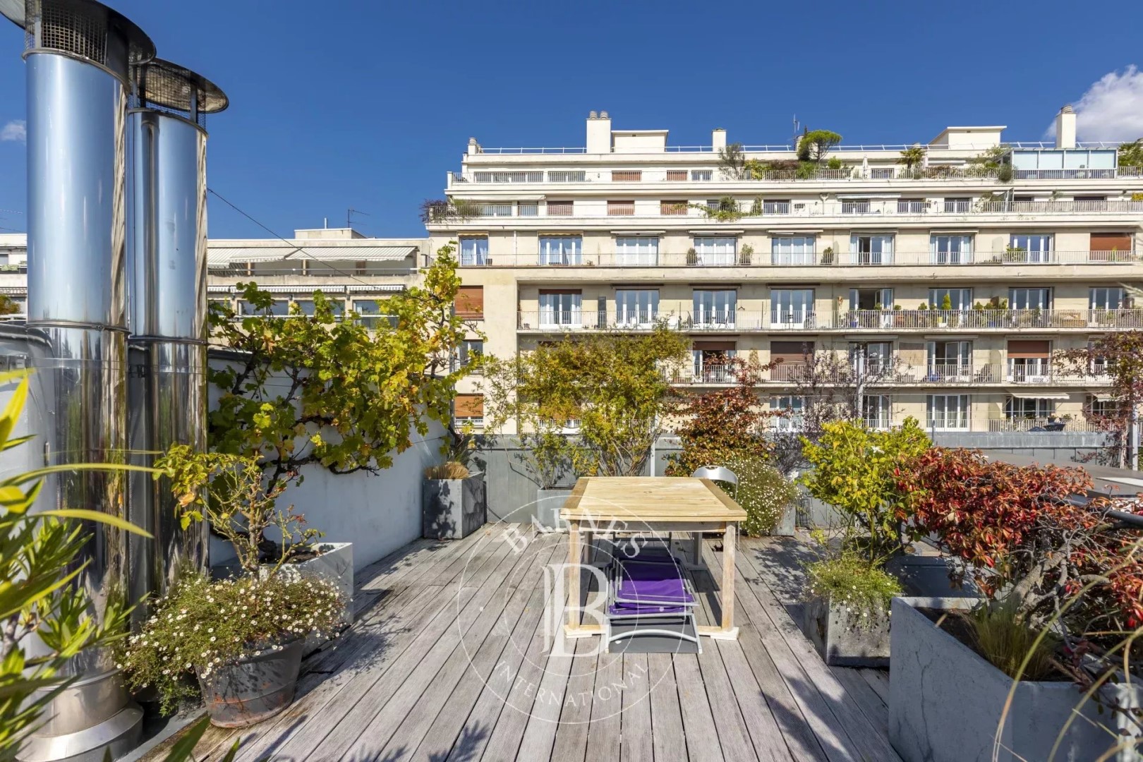 In a small condominium, duplex apartment on the top two floors with two south-facing terraces and a roof top. On the 3rd floor, the flat comprises a large, very bright lounge/dining room (4 windows) opening onto a terrace, a kitchen/diner and a toilet. On the 2nd floor, the sleeping area comprises a master bedroom with its own terrace, bathroom and dressing room, two other bedrooms, a shower room and toilet. A roof top completes the outdoor spaces. A loft feel, with ceilings up to 4 metres high in the living room. A fireplace with wood burner. Air conditioning in the south-facing rooms. Unobstructed views, peace and light. A large cellar. Rental parking in the building opposite.
