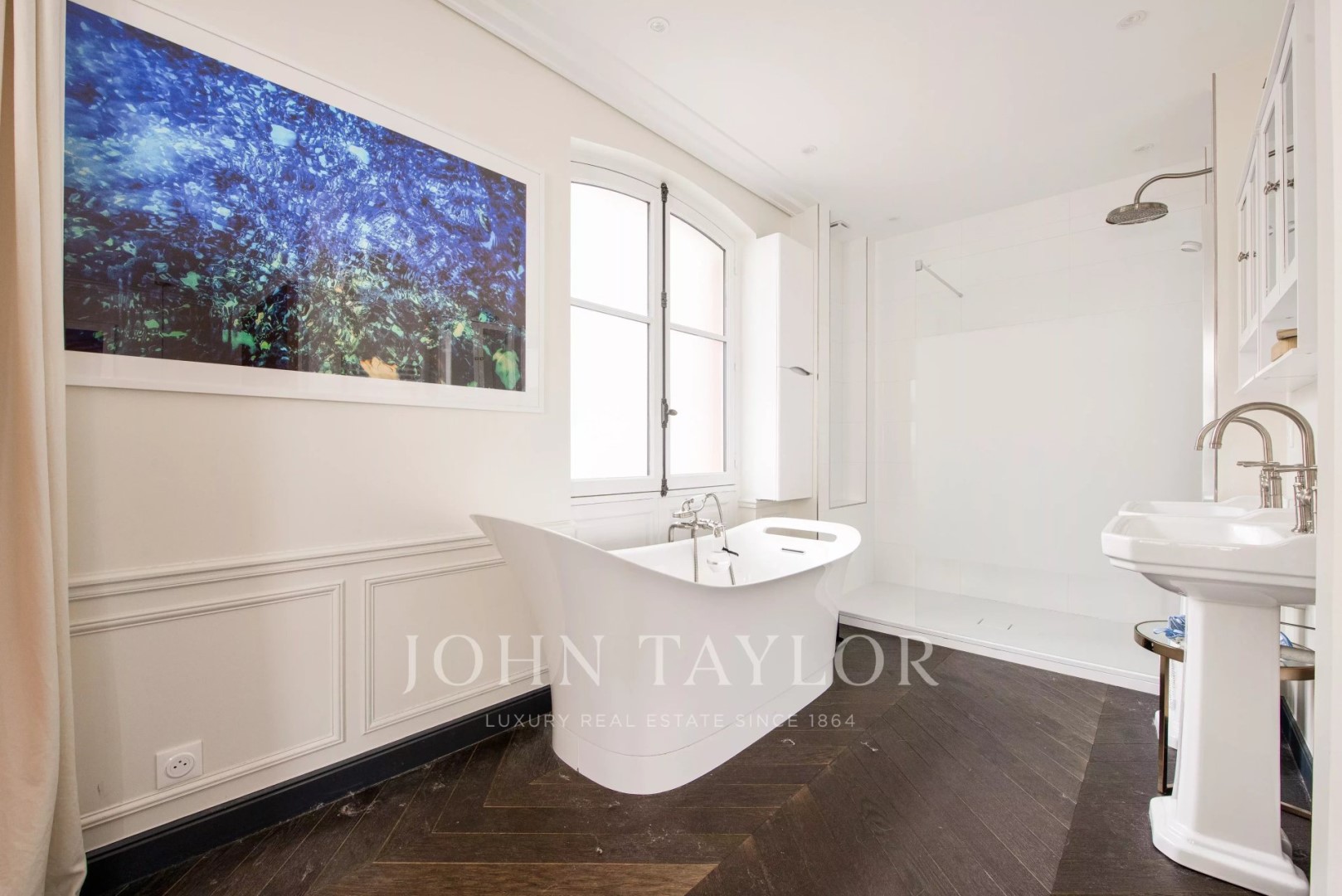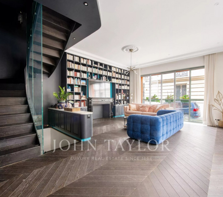 In absolute calm, in the heart of a private lane, this fully renovated, south-facing town house offers a rare and privileged living environment. The property opens onto a beautiful, bright reception area, extended by a private 30 m² courtyard. The souplex features a vast dining kitchen with 3.50 m high ceilings, a laundry room and a guest toilet. Upstairs, an elegant 26 m² master suite features a bathroom, custom dressing room and separate toilet. The second floor features two bedrooms opening onto the terrace, a laundry room and a shower room with toilet. A third bedroom is possible. Two parking spaces complete this rare property, located in the heart of a particularly sought-after neighborhood, combining discretion and comfort.