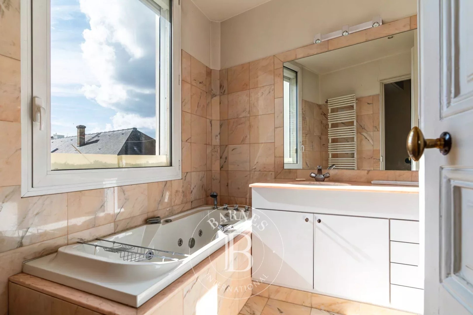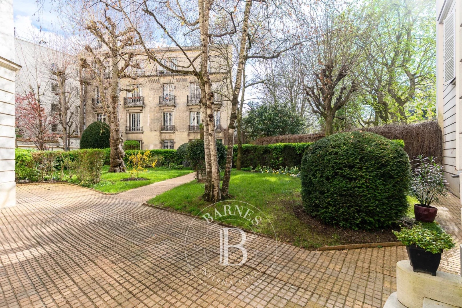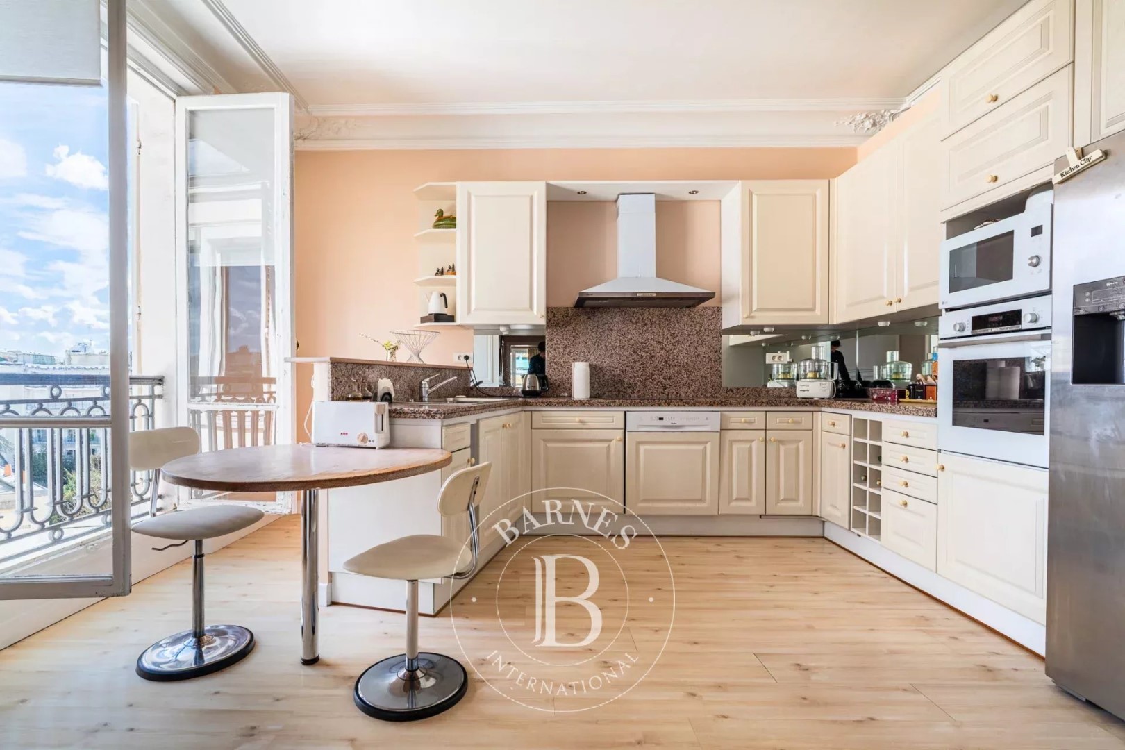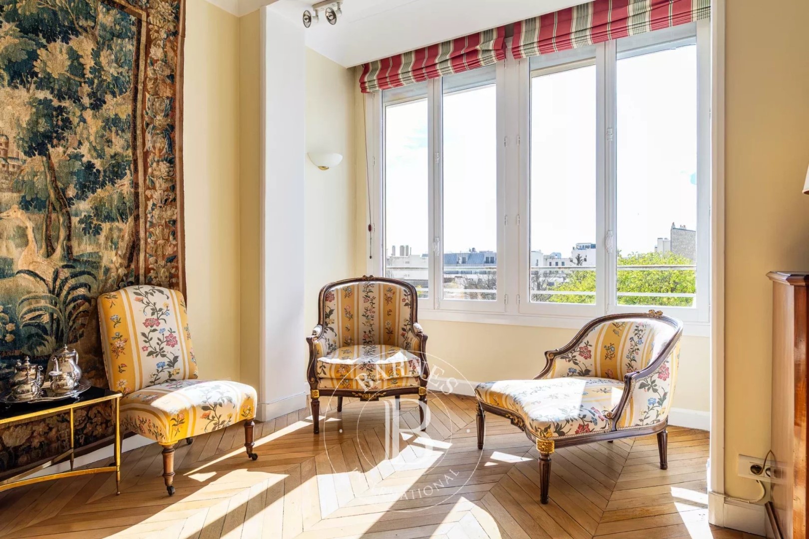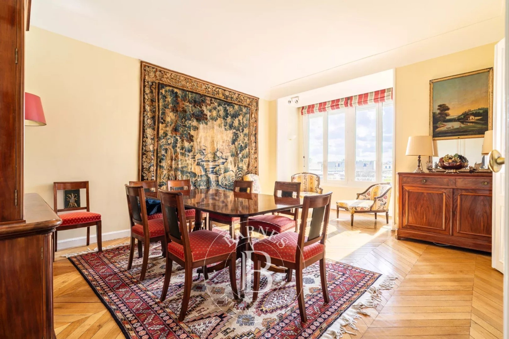 A 168 m² duplex apartment on the 5th and 6th floors of a beautiful, recently renovated Haussmann-style building. Very bright with windows facing four directions, unobstructed south-facing views over a tree-lined garden and a glimpse of the Eiffel Tower. Traditional charm with 2.93 m high ceilings, herringbone parquet flooring, mouldings and fireplaces. Quiet, with bedrooms overlooking a private garden. Good layout featuring a spacious reception room. The apartment comprises, on the 5th floor, an entrance hall, a living room with a wrap-around balcony, a dining room adjacent to a large kitchen-diner, 2 bedrooms, a bathroom, a shower room with WC, a guest WC and a utility room. On the 6th floor, there is a bedroom/study, a bedroom and a shower room. A secure, well-maintained building of a very high standard with a private garden and attractive communal areas. The main water supply on the 6th floor was refurbished in 2022. The apartment has two cellars, one of which is very large. A 8.8 m² staff room is available as an optional extra for €70,000. Property subject to co-ownership regulations.