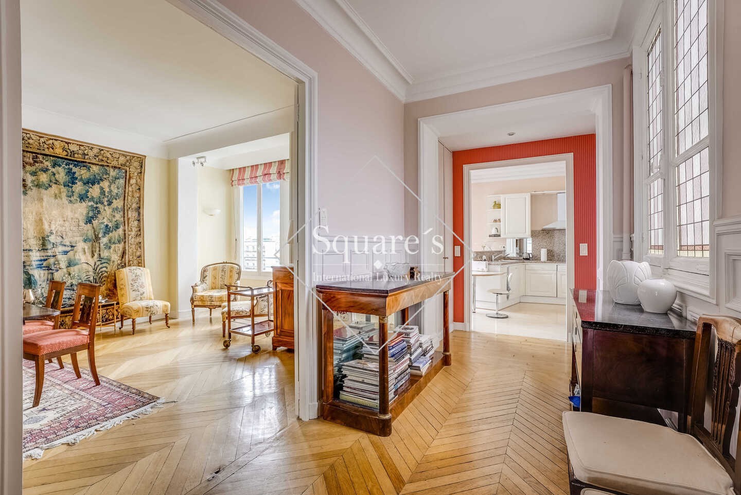 In a prestigious Haussmannian building, a magnificent family and reception apartment is located on the 5th and 6th floors. This property, with its preserved period charm (parquet floors, moldings, fireplace), boasts a perfectly designed and adaptable layout and generous proportions. Entrance gallery, a double living room opening onto a continuous balcony, a light-filled dining room with unobstructed views, and a kitchen, 3 bedrooms and 3 bathrooms.