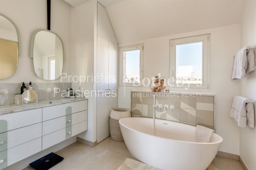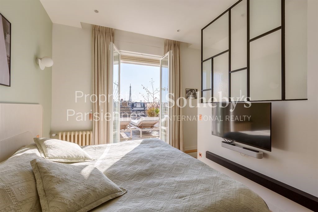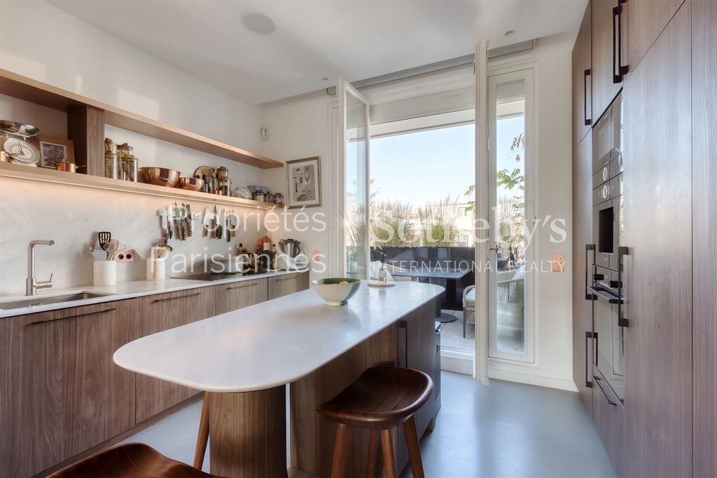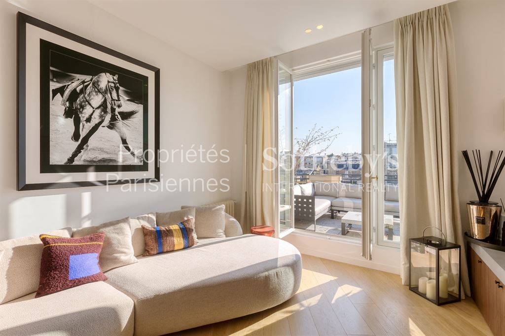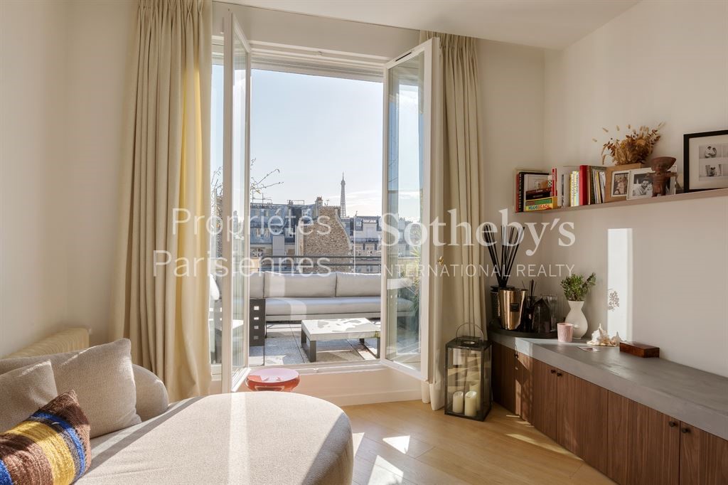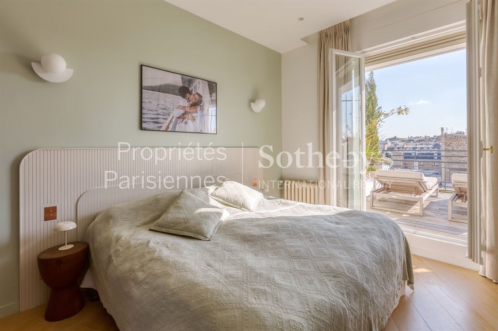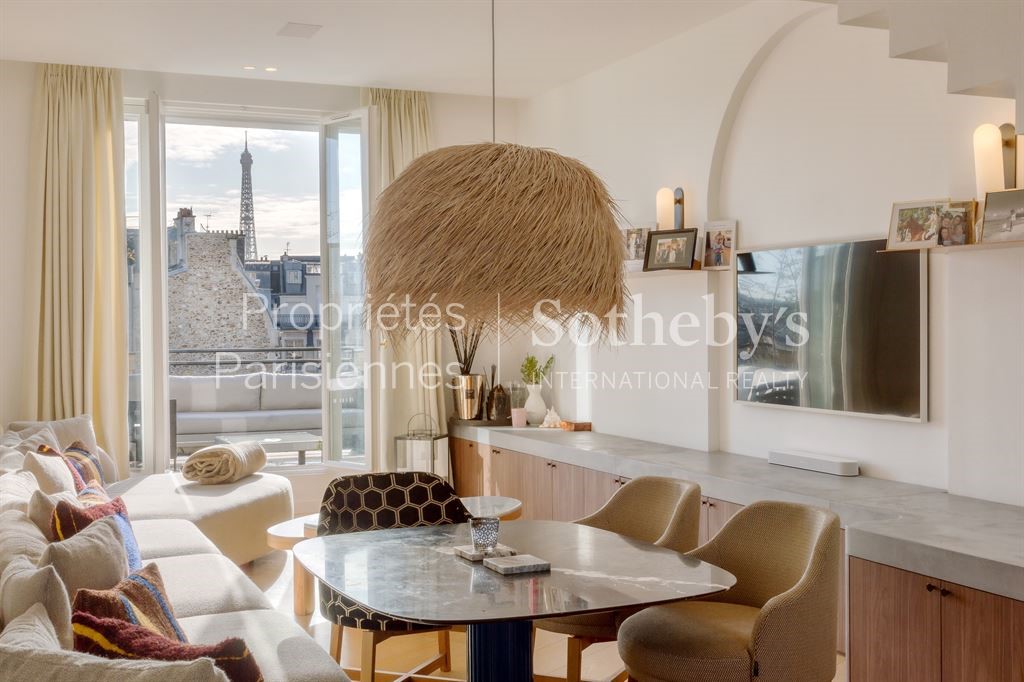 Paris XVI - Victor Hugo - On the top two floors with elevator of a very beautiful art deco building, magnificent apartment completely renovated by renowned architects, with a surface area of ??95 m2 benefiting from 30 m2 of terraces and offering beautiful open views .<BR>It consists of an entrance, a living room, a fitted and equipped dining kitchen, a master bedroom with bathroom and dressing room, a second bedroom with shower room, a laundry room. A cellar and a parking space accessible by elevator in the building complete this property.