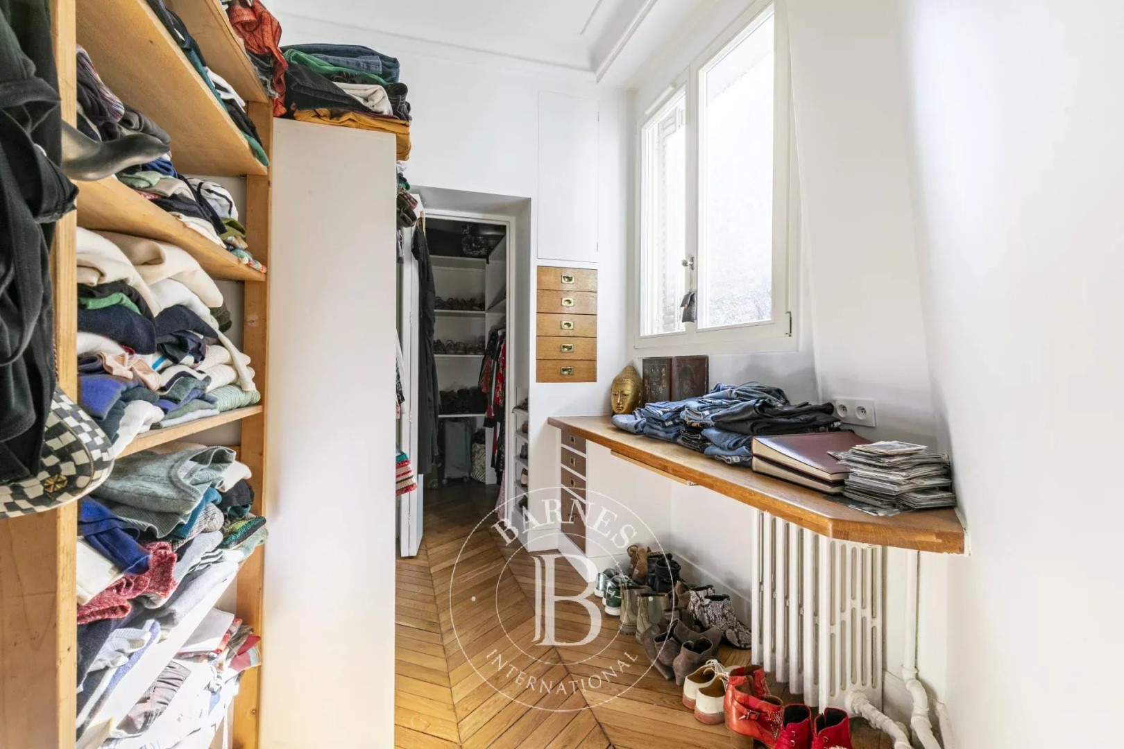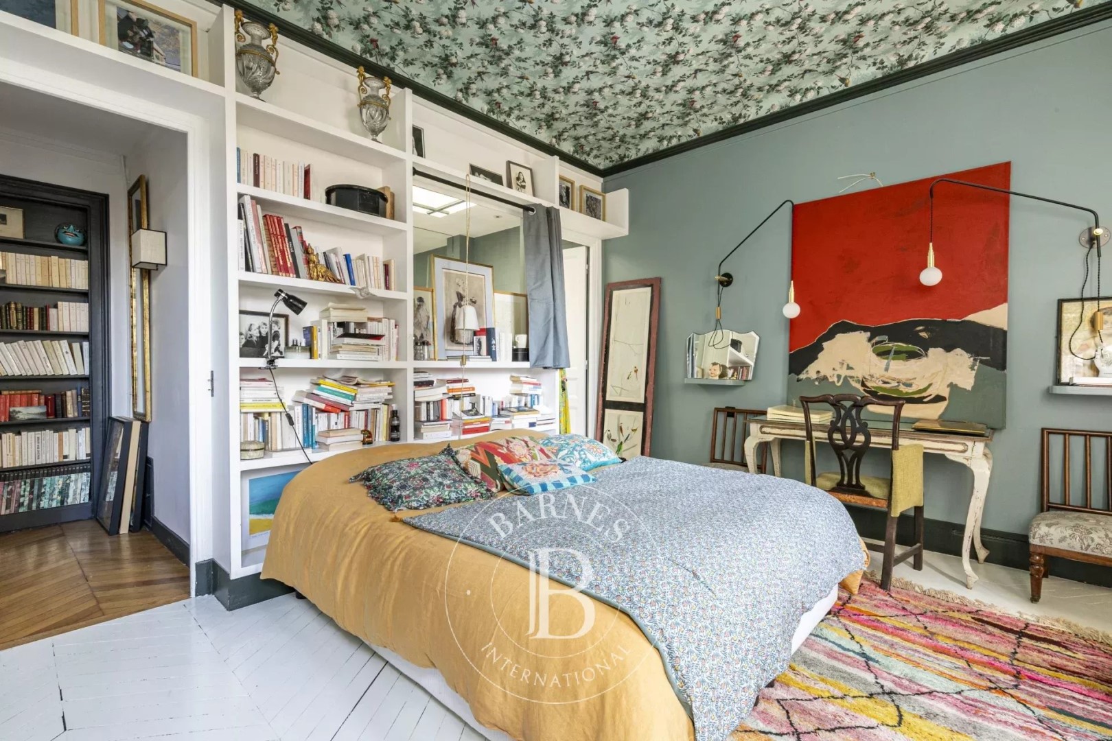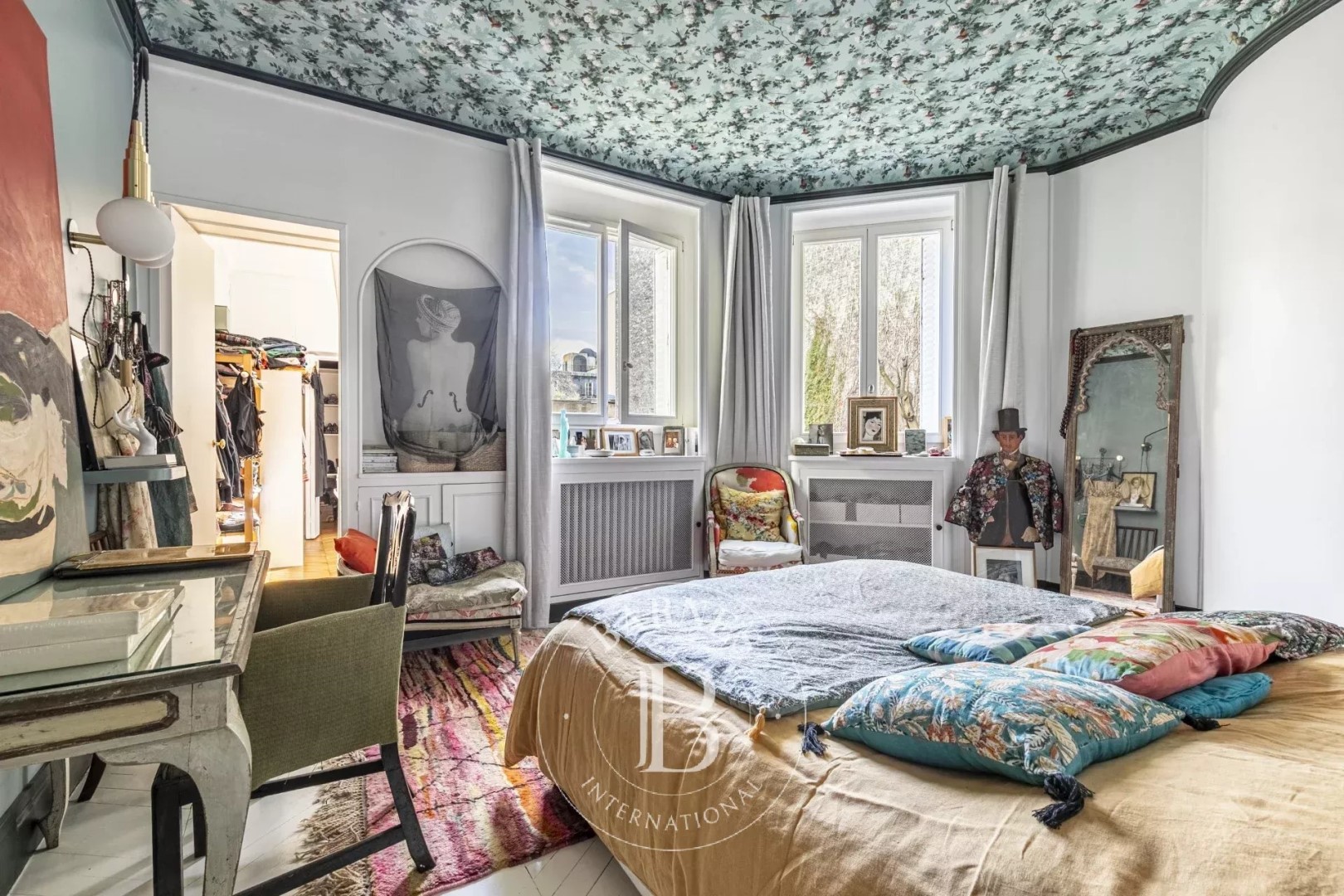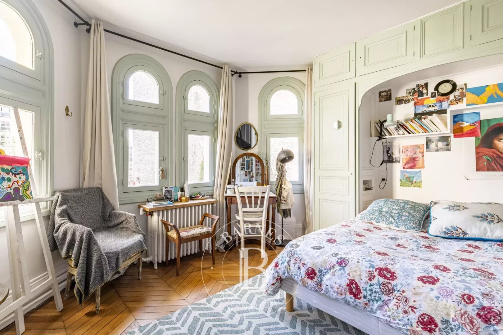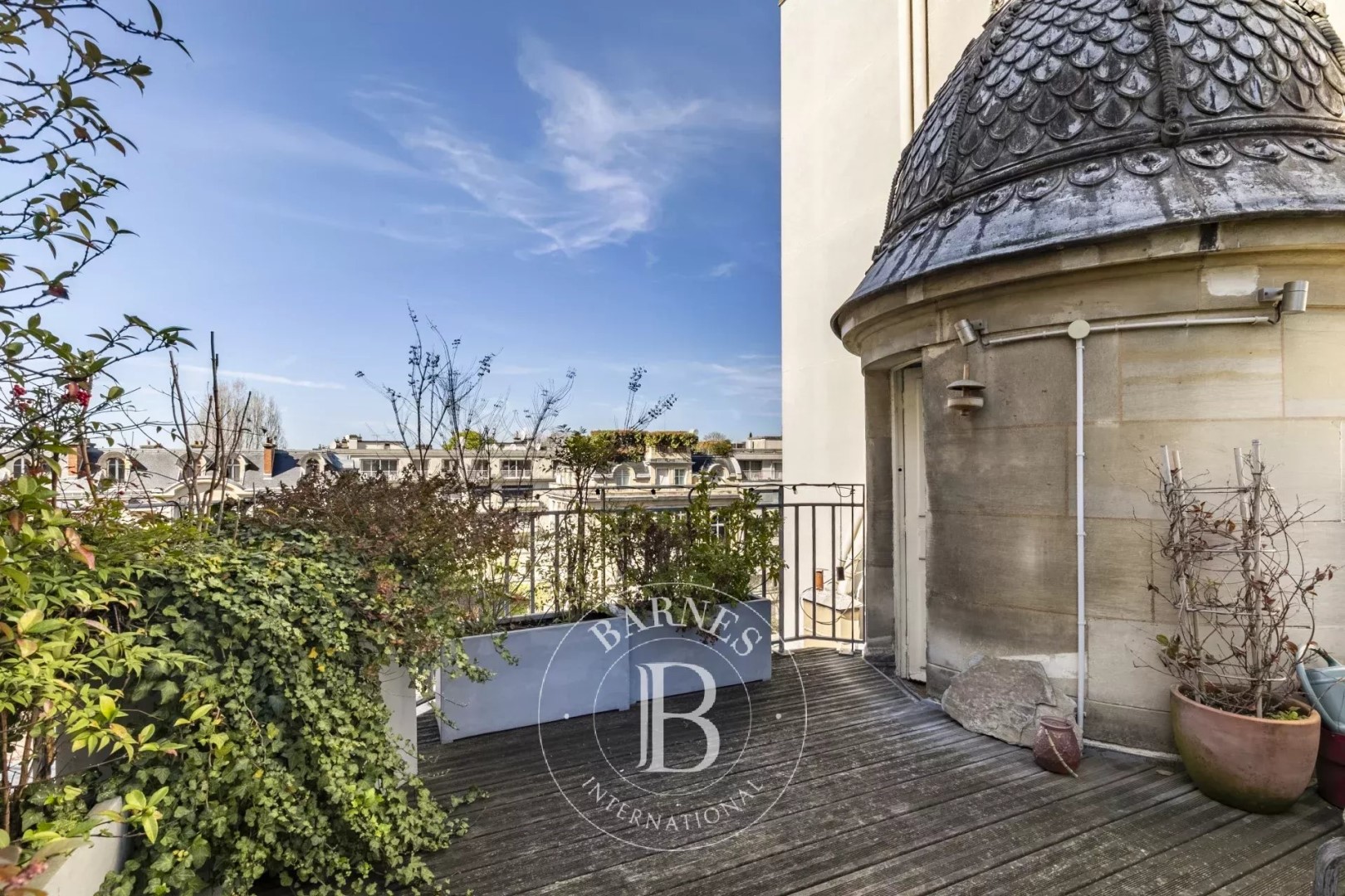 Family apartment, fully renovated, offering 210 sqm of living space, located on the 2nd and top floor of a 19th-century private mansion. Designed like a house and ideally situated just steps from the Jardin du Ranelagh, this dual-aspect East/West apartment features a double living room with fireplace, a semi-open eat-in kitchen, a spacious office with a glass partition overlooking the garden, three bedrooms with a bathroom and a shower room, as well as a master suite with dressing room and en-suite bathroom. A laundry room completes the property. You will also discover a fifth bedroom nestled in the turret, which provides access to a sunny 14 sqm rooftop terrace. This unique property, full of charm, is sure to capture your heart. Property subject to co-ownership regulations.