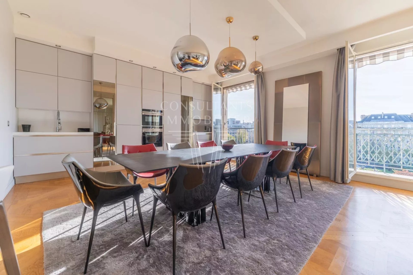 PARIS 16th. AVENUE FOCH. SOUTH-FACING TERRACE. On the 6th floor of a very prestigious building with concierges and security, we offer you a magnificent air-conditioned apartment on a high floor with a south-facing terrace and an open view on the Eiffel Tower. It comprises an entrance gallery with cloakroom and guest toilet, a spacious double living/reception room with an open-plan kitchen, three suites with shower rooms and toilets, and a master suite with two shower rooms, dressing rooms, and two lavatories. This exceptional apartment boasts 3-meter high ceilings, air conditioning, and contemporary décor. With a cellar. A double box and a 20m2 studio complete this property. CONSULTANTS IMMOBILIER LUXURY REAL ESTATE PARIS