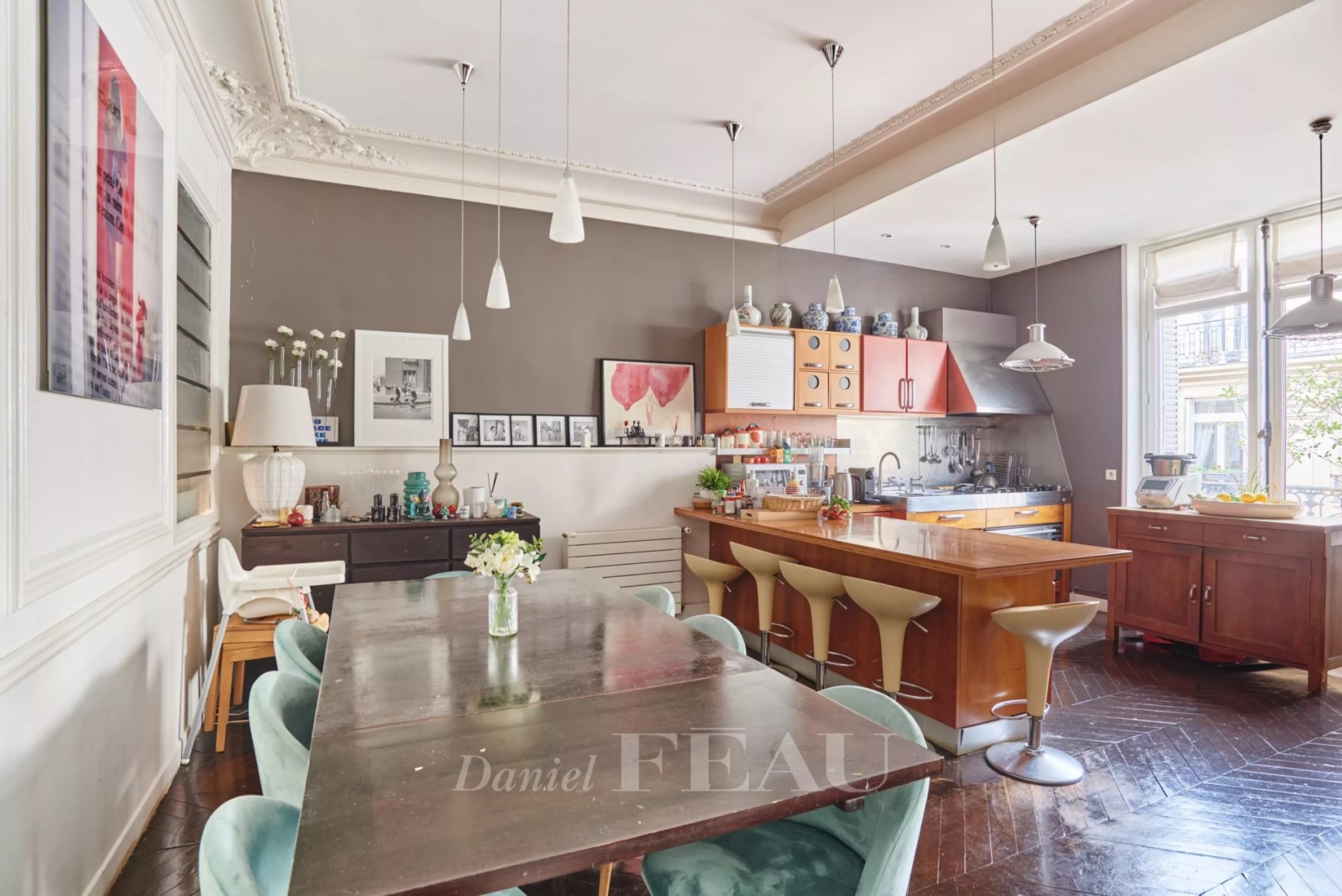 Exclusive listing. Located in a beautiful, prestigious period building characteristic of the Plaine Monceau district, this spacious family and reception apartment is situated on the fourth floor (with elevator access). It comprises an entrance gallery with an office area, a double living room overlooking the street and incorporating the kitchen, a study, and a master suite including a dressing room, bathroom/shower, and separate toilet. The children's area features three quiet bedrooms overlooking a bright, open courtyard, a bathroom with laundry facilities, and a separate toilet. Additionally, a studio apartment with a kitchenette and shower, currently rented, is available for €140,000 on the sixth floor (accessible from the apartment and via the service staircase). Two cellars are also included.