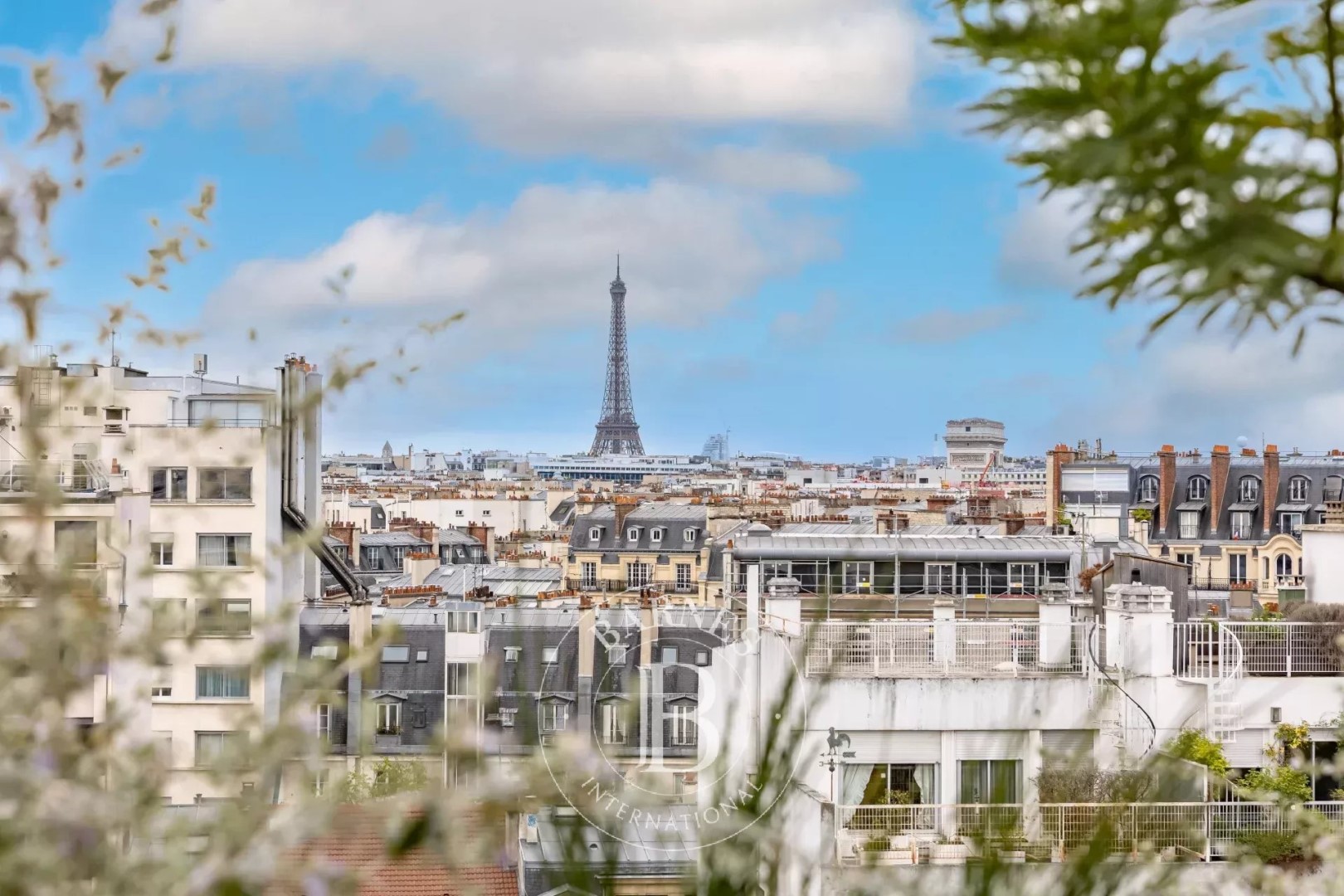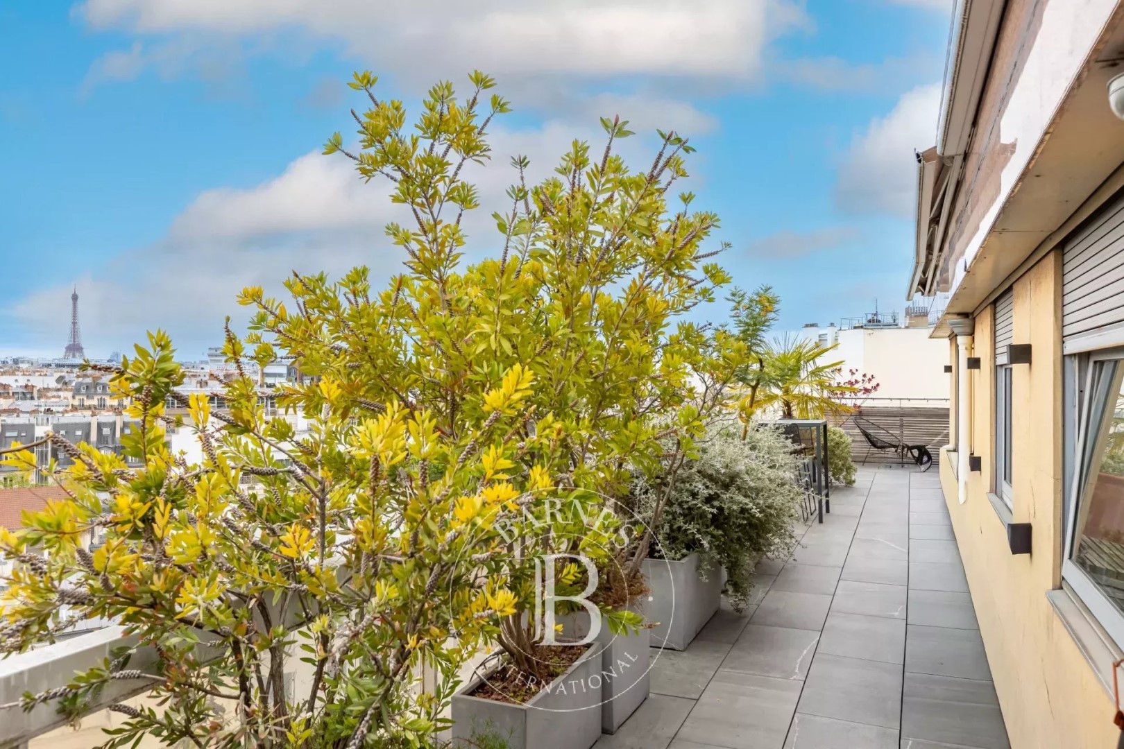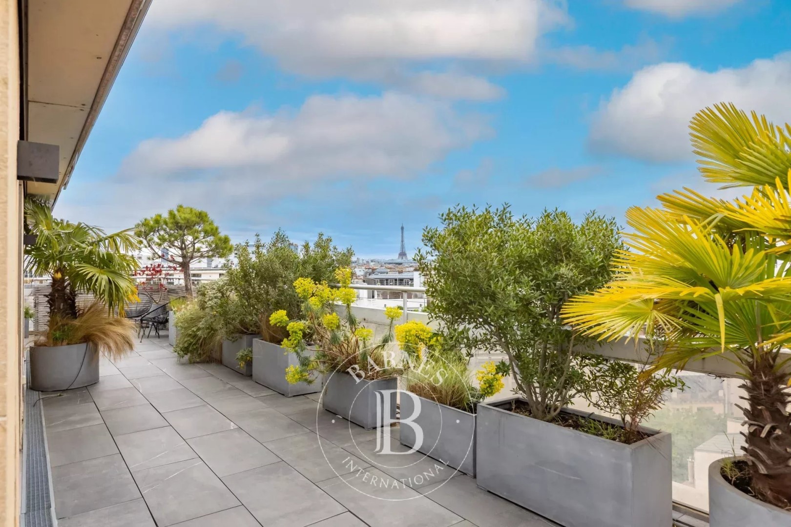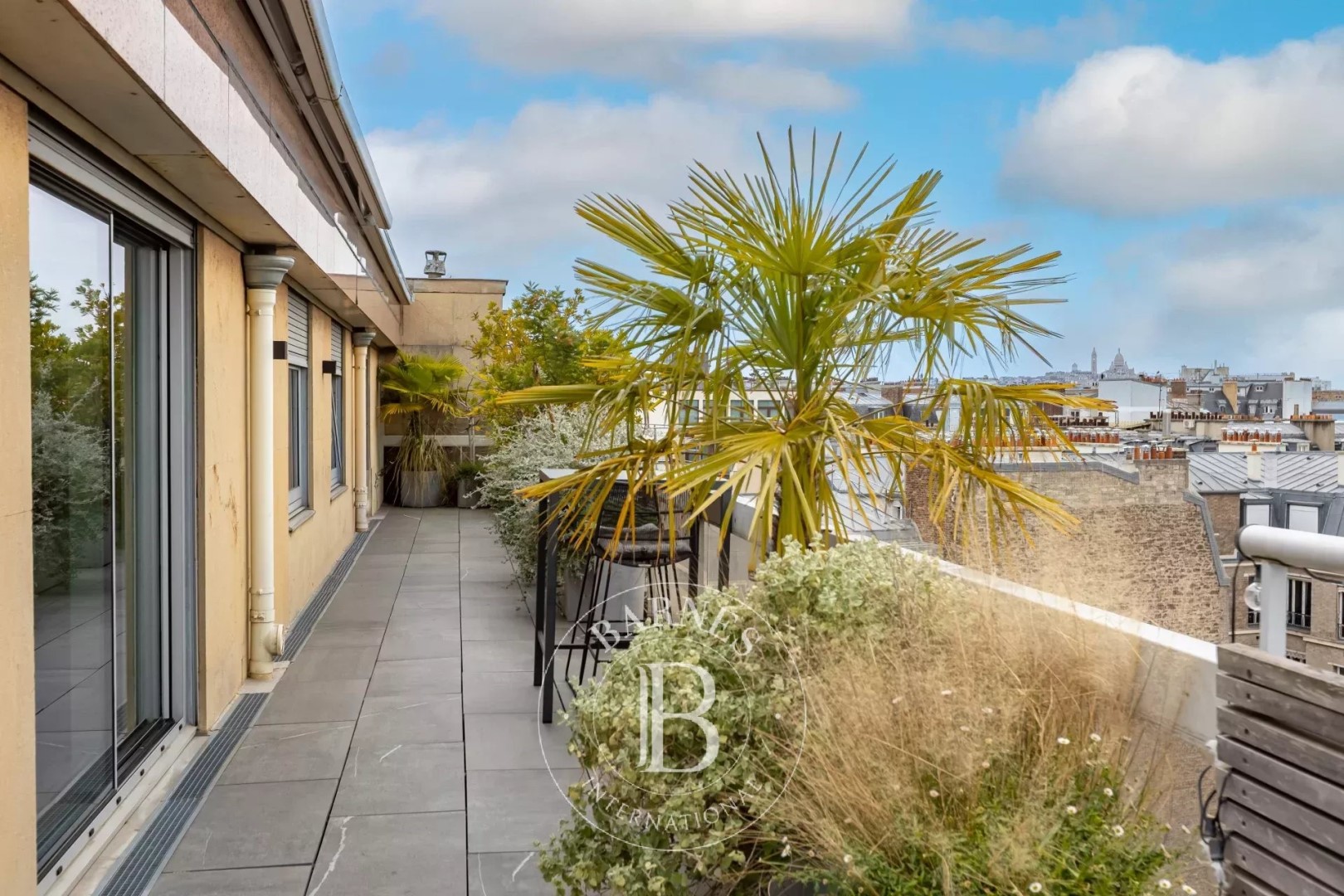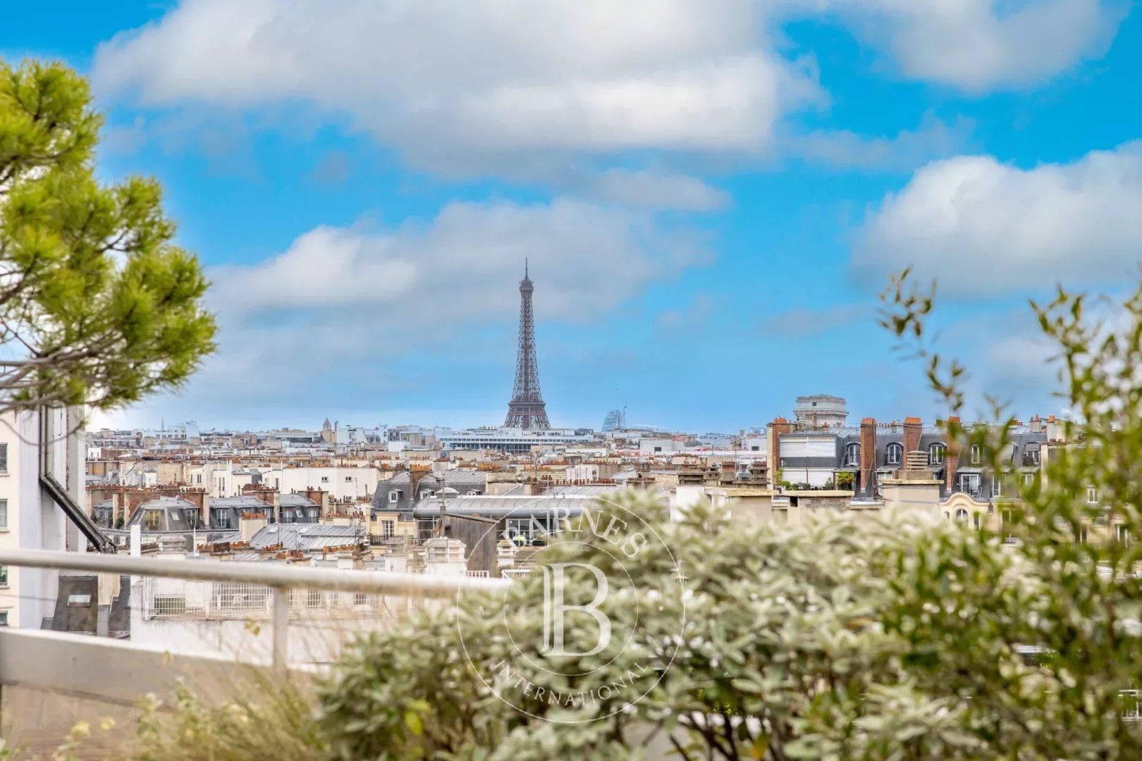 Paris 17th arrondissement - Pereire Ampère - “Penthouse” apartment with ground-level terrace and panoramic views - 2 bedrooms and a study. This 5-room “Penthouse” apartment, with a “Carrez” floor area of 124.66 m², is located on the 8th floor (top floor), with an elevator serving up to the 7th floor. It primarily comprises an entryway, a living-dining room, a fully equipped open-concept kitchen, a laundry room with a separate toilet, a master suite with a walk-in closet and an en-suite shower room, a second bedroom with an adjoining office space and an en-suite shower room, and a second separate toilet. All rooms open onto a 123 m² ground-level terrace with an exceptional panoramic view of Paris and its landmarks, notably the Eiffel Tower and Sacré-Cœur. The apartment also includes a storage unit and, as an option, a large parking space in the building. Translated with DeepL.com (free version)