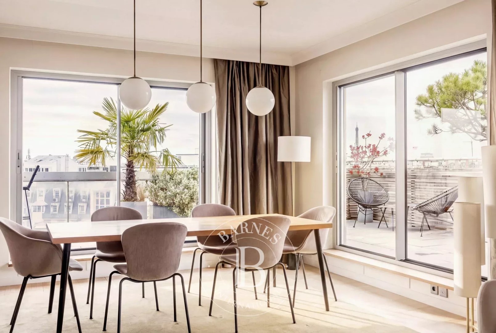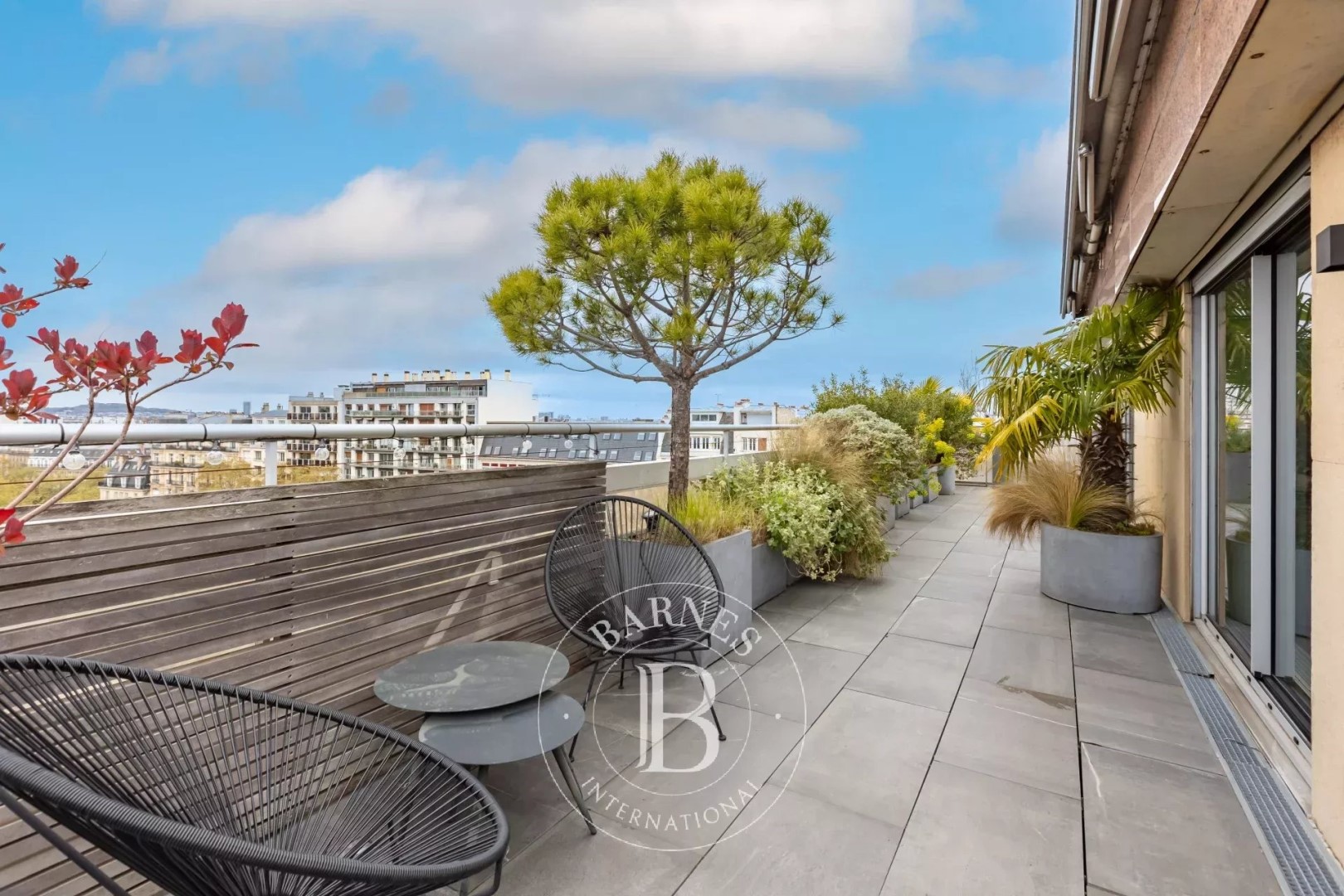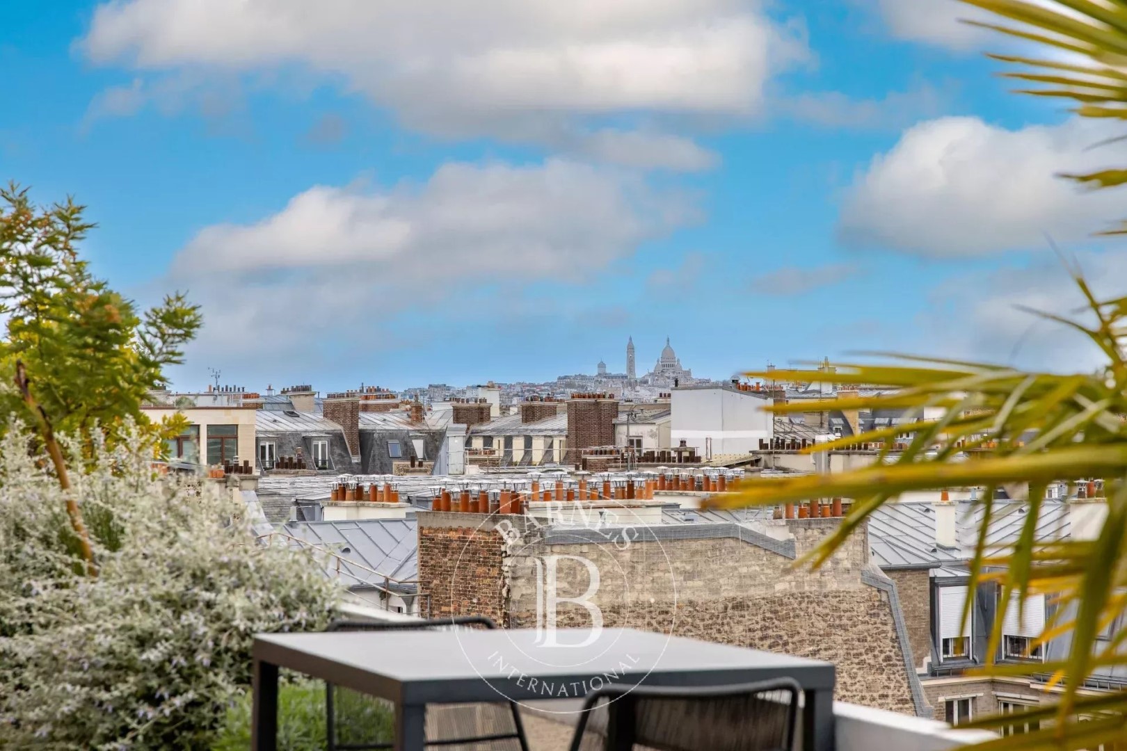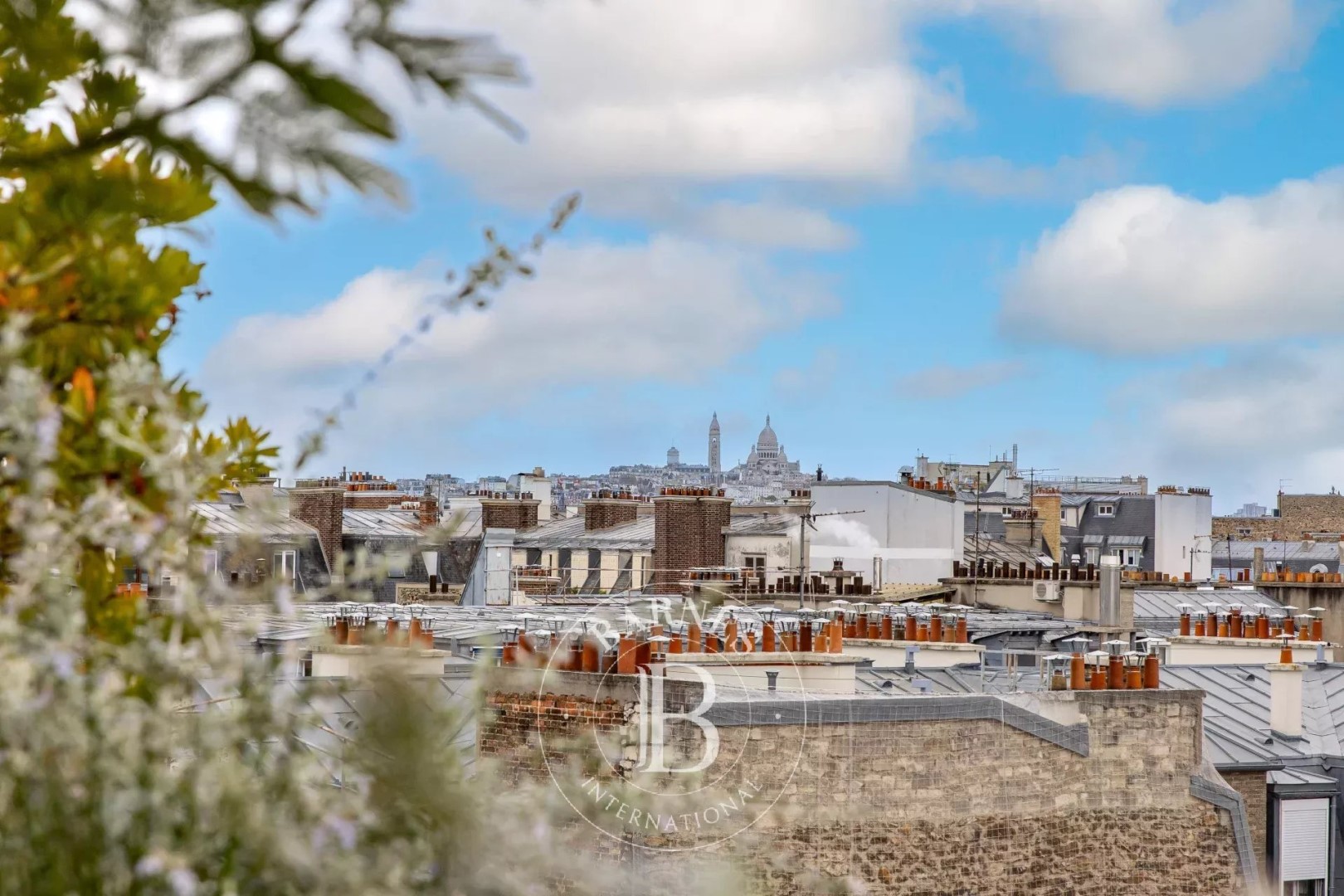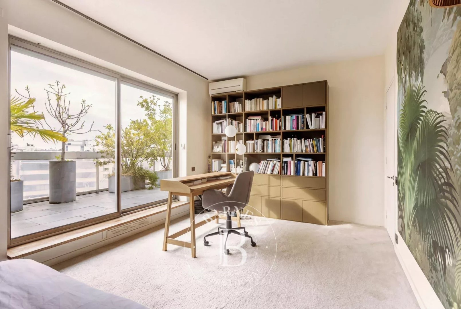 Paris 17th arrondissement - Pereire Ampère - “Penthouse” apartment with ground-level terrace and panoramic views - 2 bedrooms and a study. This 5-room “Penthouse” apartment, with a “Carrez” floor area of 124.66 m², is located on the 8th floor (top floor), with an elevator serving up to the 7th floor. It primarily comprises an entryway, a living-dining room, a fully equipped open-concept kitchen, a laundry room with a separate toilet, a master suite with a walk-in closet and an en-suite shower room, a second bedroom with an adjoining office space and an en-suite shower room, and a second separate toilet. All rooms open onto a 123 m² ground-level terrace with an exceptional panoramic view of Paris and its landmarks, notably the Eiffel Tower and Sacré-Cœur. The apartment also includes a storage unit and, as an option, a large parking space in the building. Translated with DeepL.com (free version)