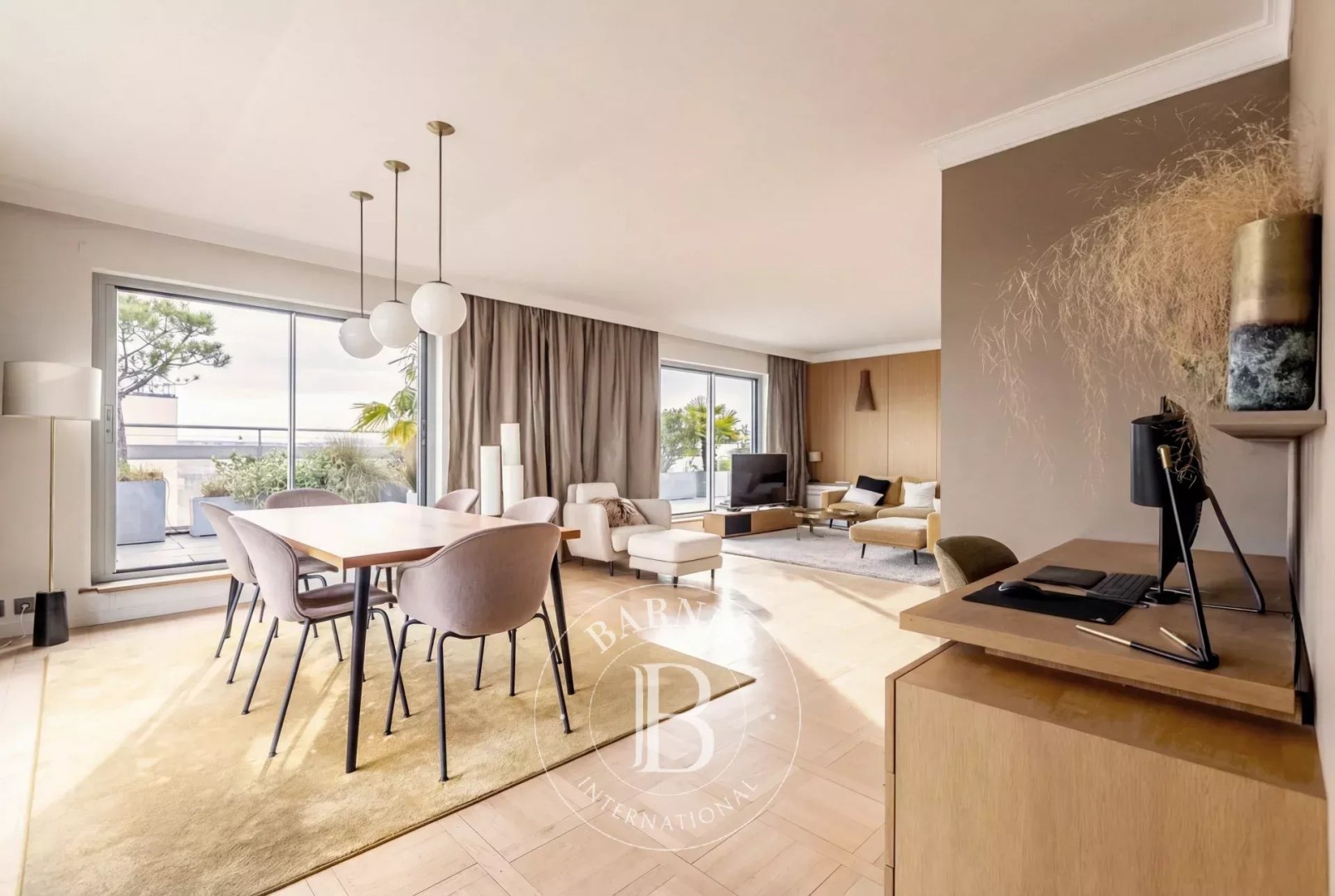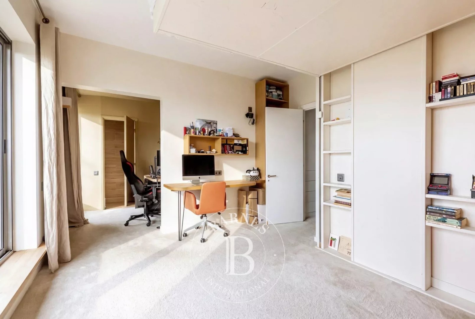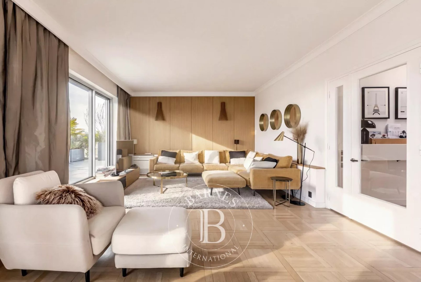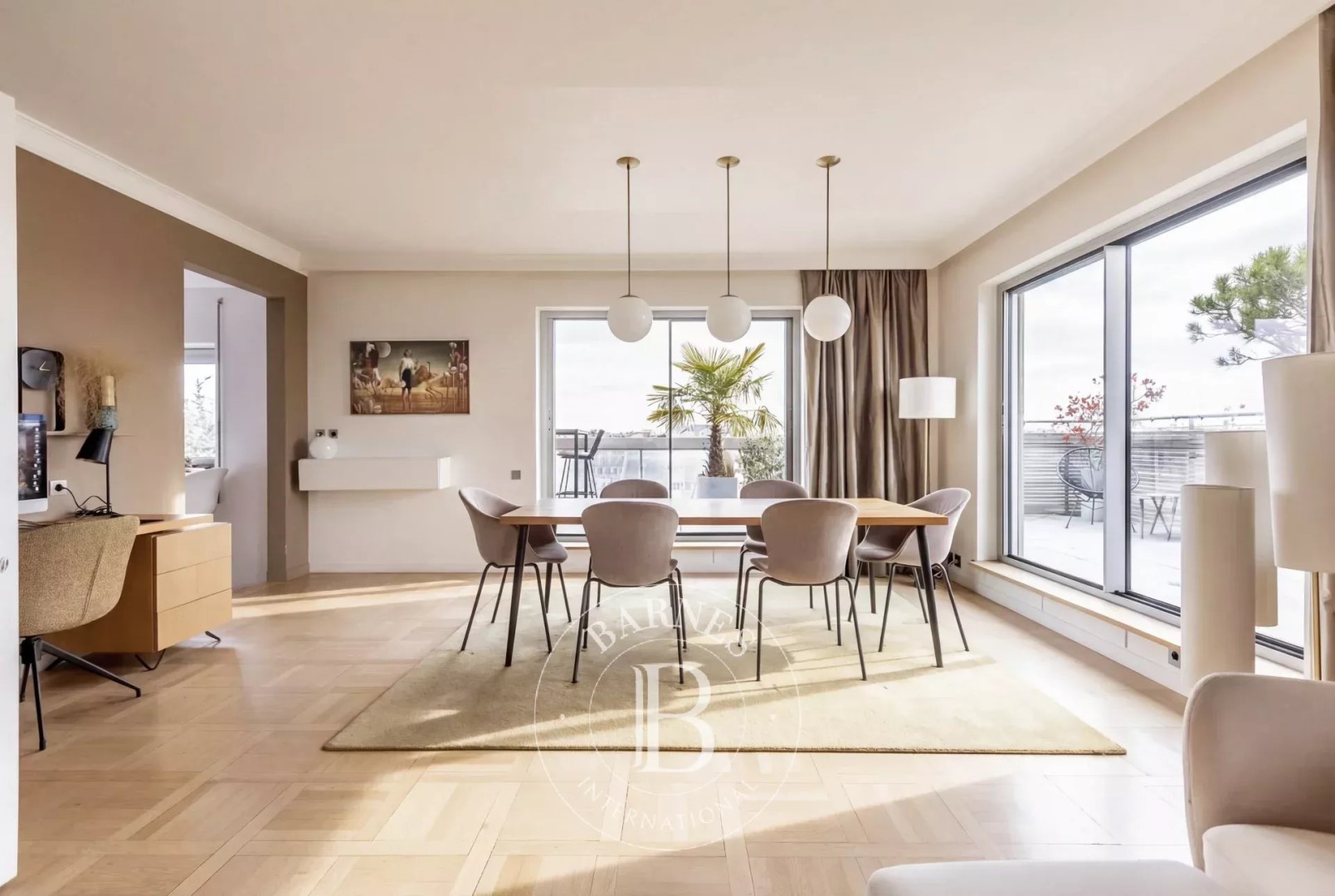 Paris 17th arrondissement - Pereire Ampère - “Penthouse” apartment with ground-level terrace and panoramic views - 2 bedrooms and a study. This 5-room “Penthouse” apartment, with a “Carrez” floor area of 124.66 m², is located on the 8th floor (top floor), with an elevator serving up to the 7th floor. It primarily comprises an entryway, a living-dining room, a fully equipped open-concept kitchen, a laundry room with a separate toilet, a master suite with a walk-in closet and an en-suite shower room, a second bedroom with an adjoining office space and an en-suite shower room, and a second separate toilet. All rooms open onto a 123 m² ground-level terrace with an exceptional panoramic view of Paris and its landmarks, notably the Eiffel Tower and Sacré-Cœur. The apartment also includes a storage unit and, as an option, a large parking space in the building. Translated with DeepL.com (free version)