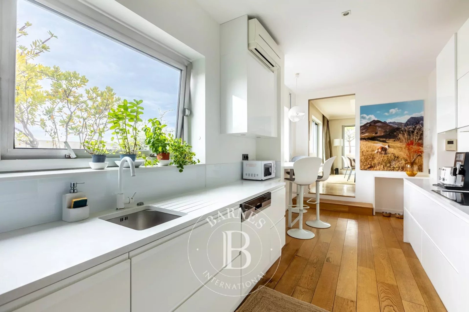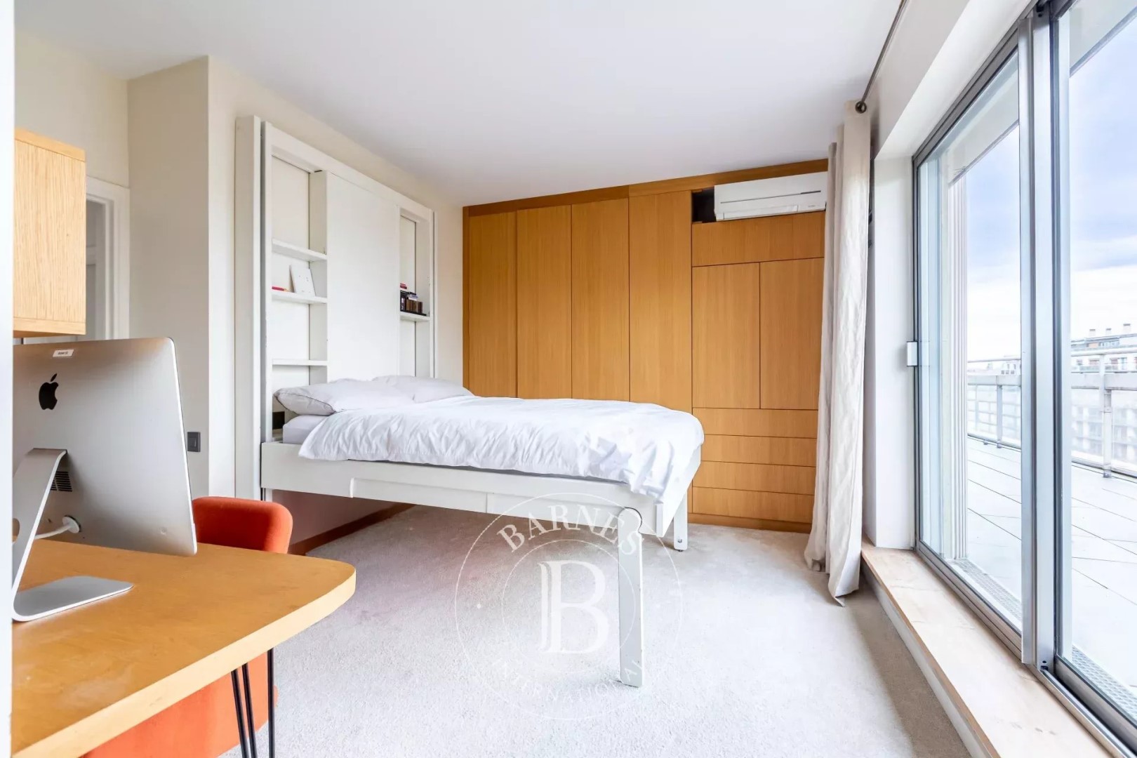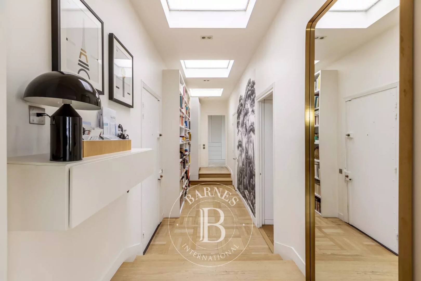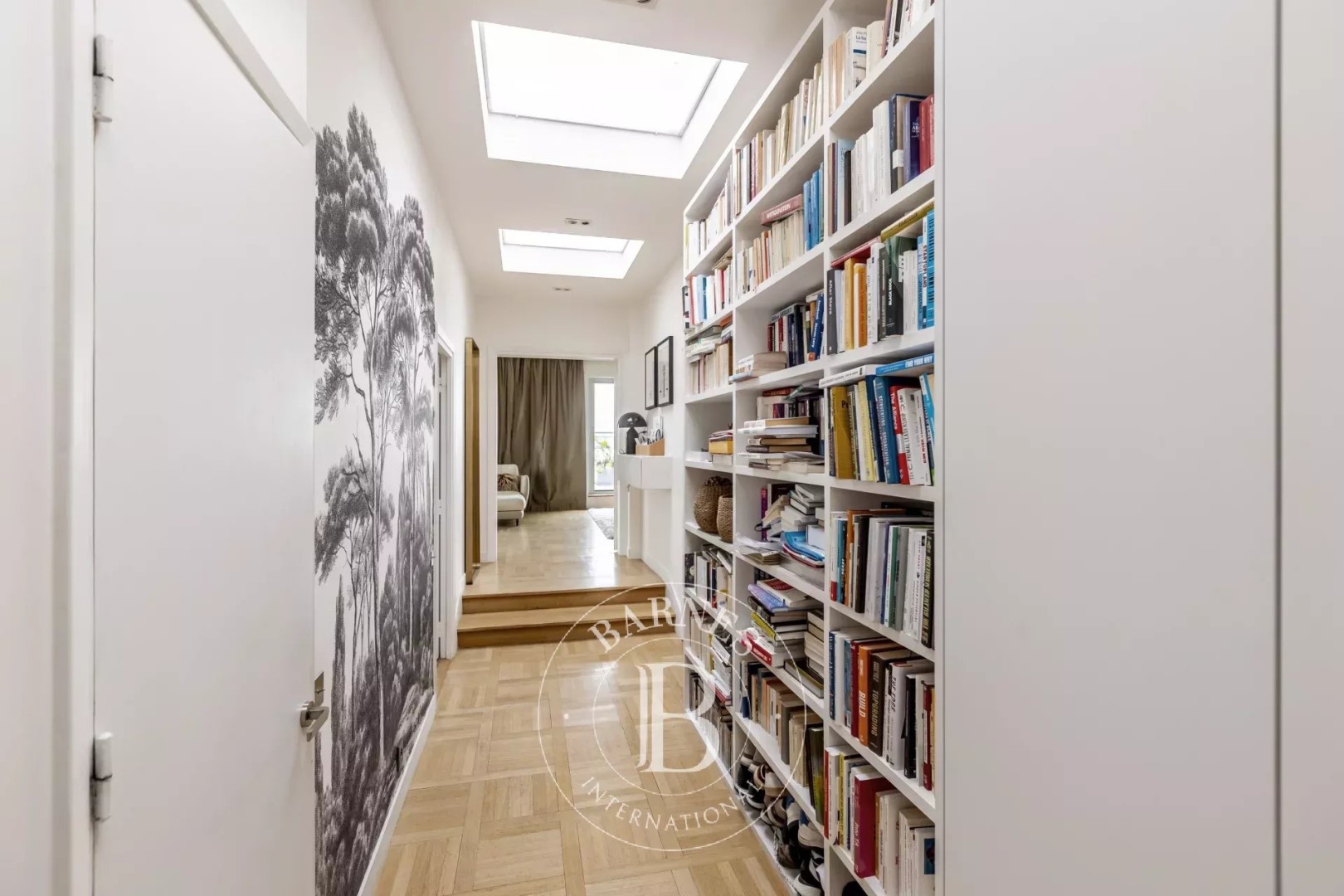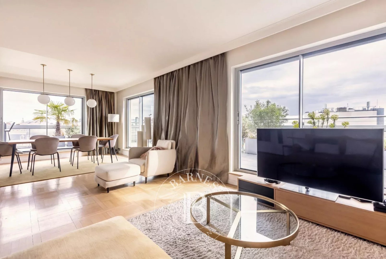 Paris 17th arrondissement - Pereire Ampère - “Penthouse” apartment with ground-level terrace and panoramic views - 2 bedrooms and a study. This 5-room “Penthouse” apartment, with a “Carrez” floor area of 124.66 m², is located on the 8th floor (top floor), with an elevator serving up to the 7th floor. It primarily comprises an entryway, a living-dining room, a fully equipped open-concept kitchen, a laundry room with a separate toilet, a master suite with a walk-in closet and an en-suite shower room, a second bedroom with an adjoining office space and an en-suite shower room, and a second separate toilet. All rooms open onto a 123 m² ground-level terrace with an exceptional panoramic view of Paris and its landmarks, notably the Eiffel Tower and Sacré-Cœur. The apartment also includes a storage unit and, as an option, a large parking space in the building. Translated with DeepL.com (free version)
