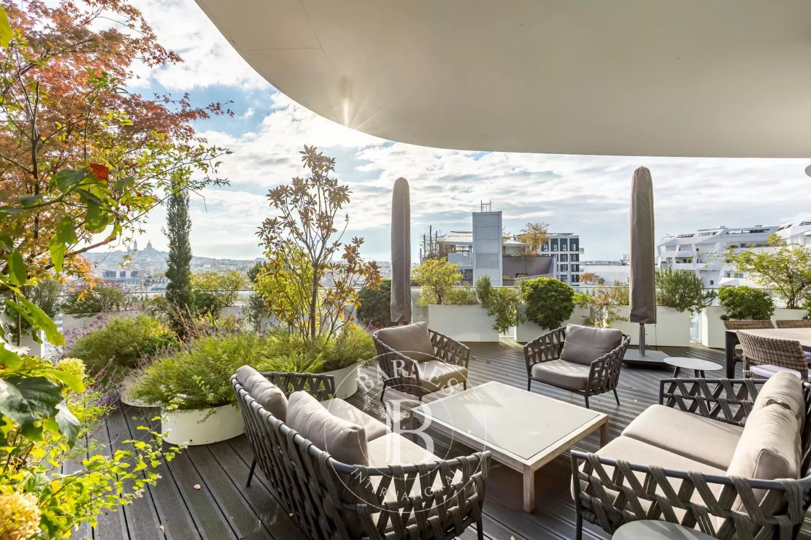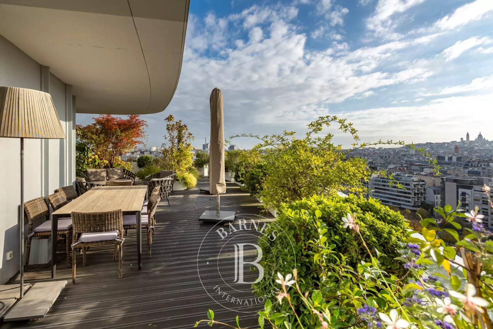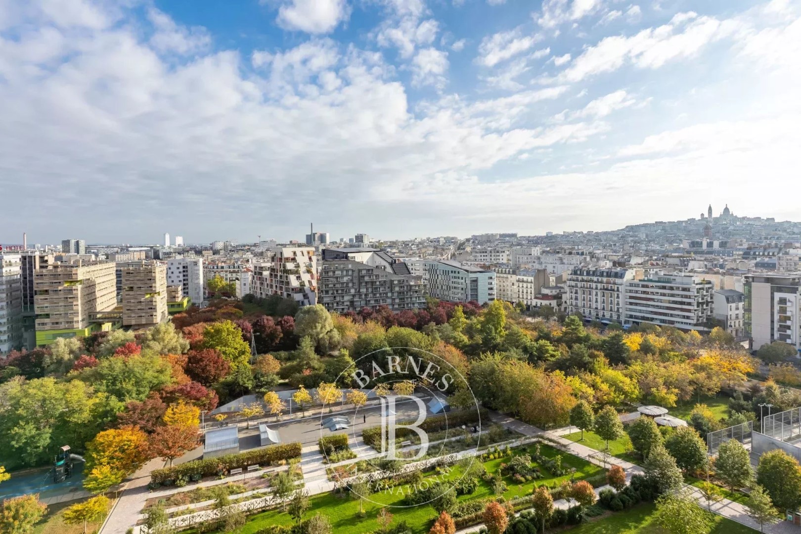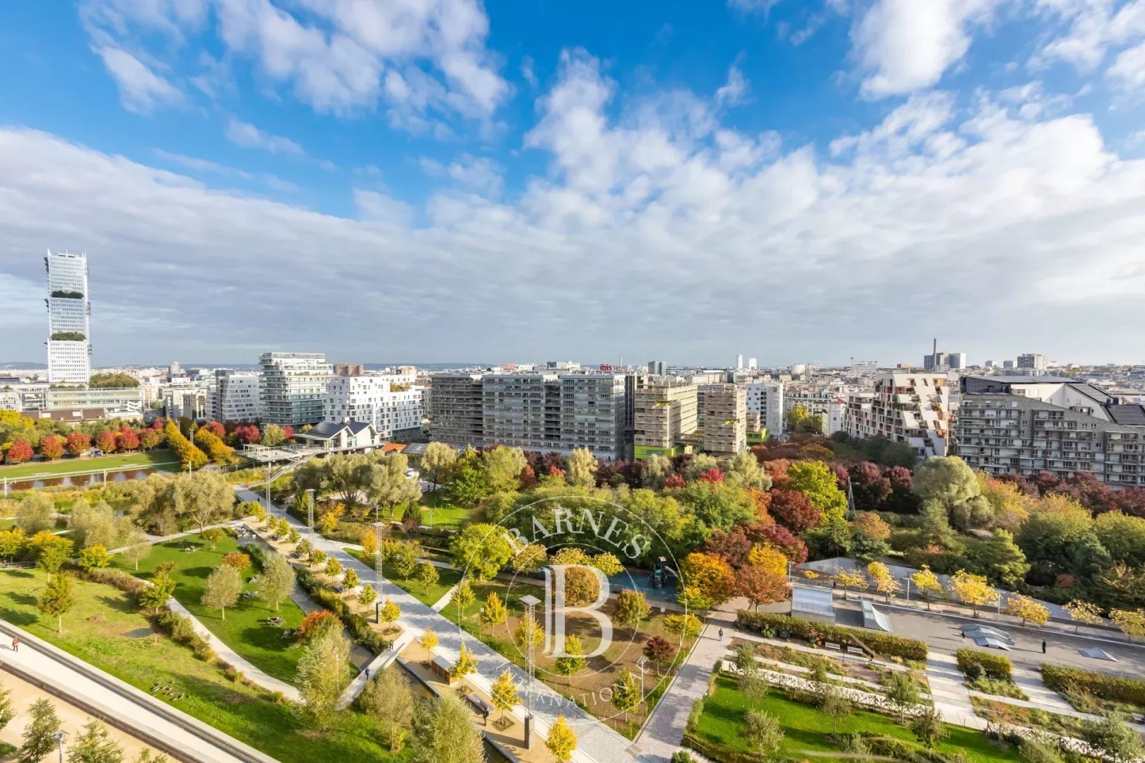 Paris 17th arrondissement - Martin Luther King Garden - Terrace - Panoramic view - 4 bedrooms Ideally located in the heart of the new Batignolles district, on the 9th floor of a contemporary luxury building with elevator, this exceptional apartment offers breathtaking views of Paris and its monuments. It comprises an entrance hall with wardrobe, a large living/dining room extending onto a spectacular green terrace of approximately 245 sq. ft., a veritable oasis of greenery suspended above the city. The fully equipped kitchen opens onto the living room. The sleeping area comprises a master suite with dressing room and shower room, a study, and two bedrooms, each with its own bathroom or shower room. There is also a laundry room. All rooms open onto the terrace. Two parking spaces and a cellar complete this rare property.