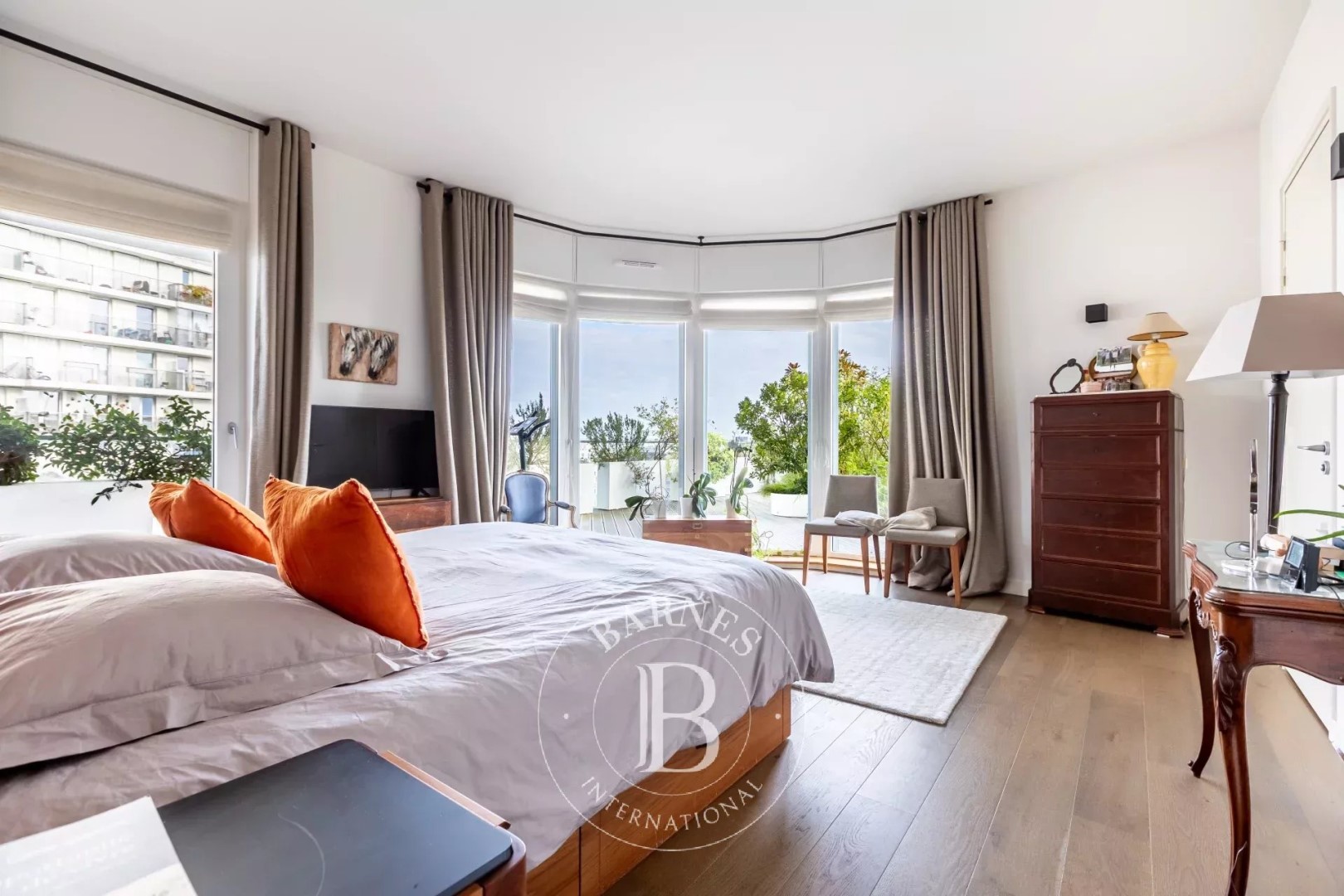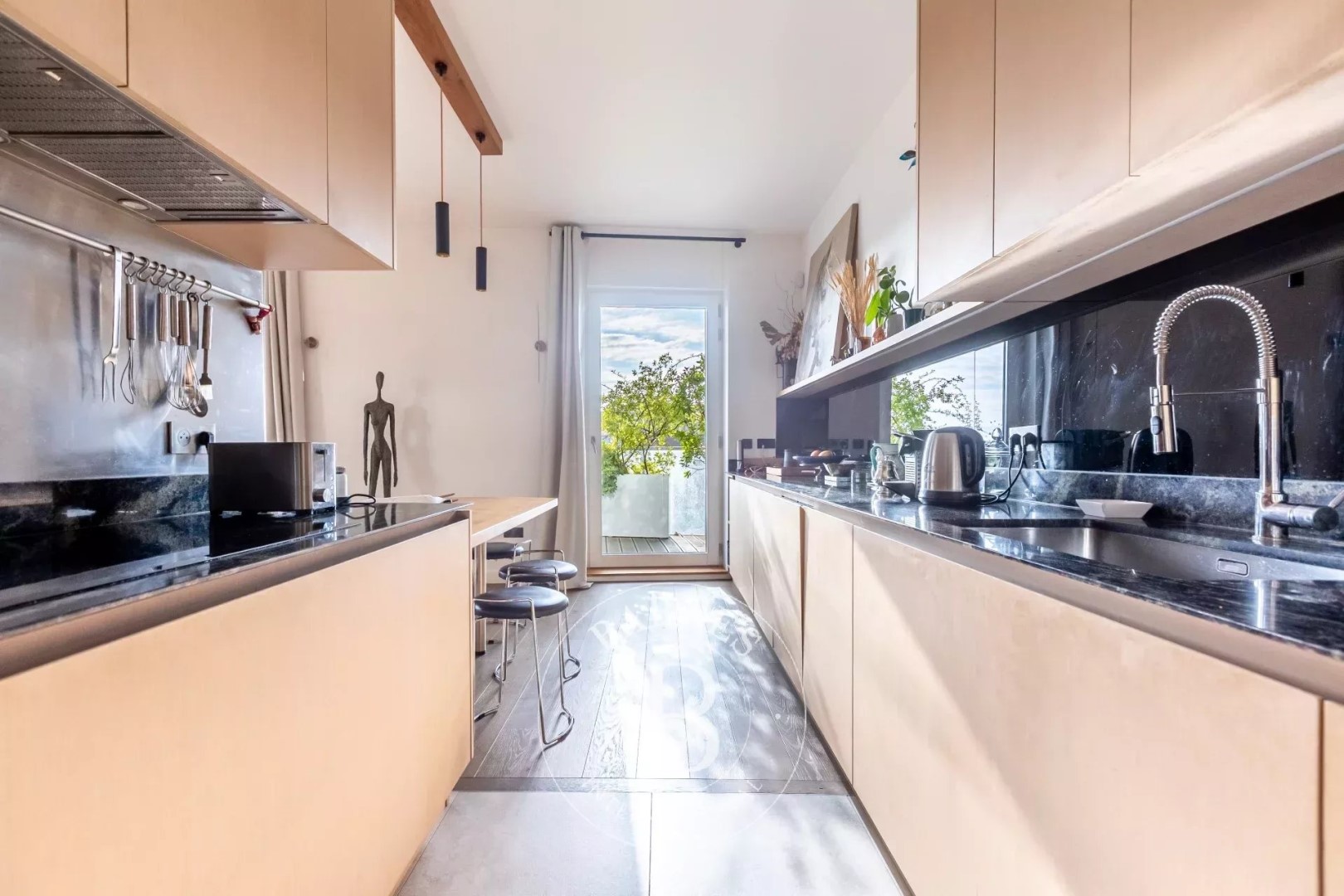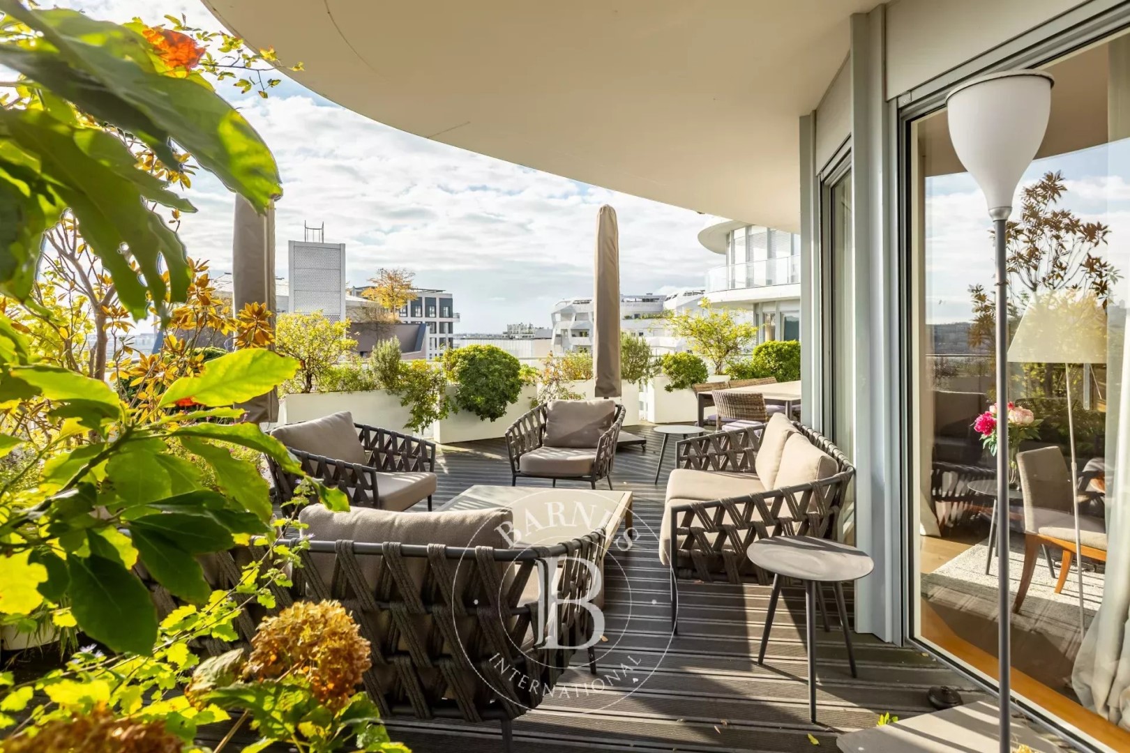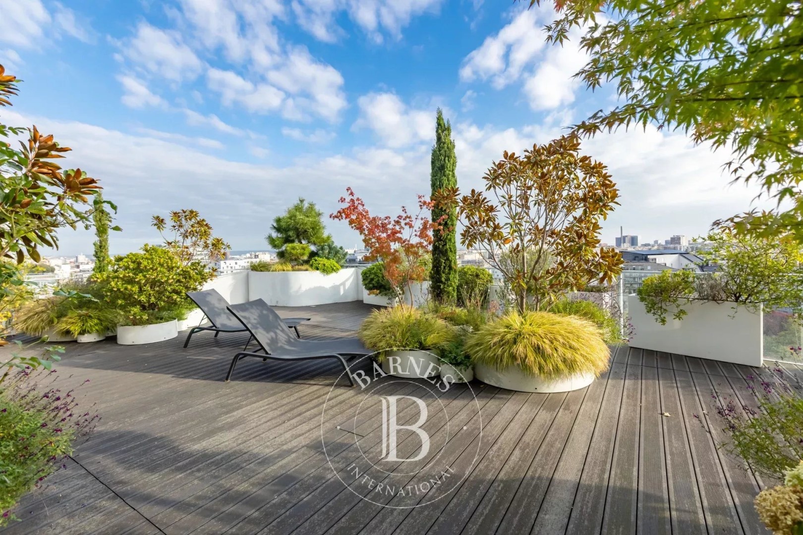 Paris 17th arrondissement - Martin Luther King Garden - Terrace - Panoramic view - 4 bedrooms Ideally located in the heart of the new Batignolles district, on the 9th floor of a contemporary luxury building with elevator, this exceptional apartment offers breathtaking views of Paris and its monuments. It comprises an entrance hall with wardrobe, a large living/dining room extending onto a spectacular green terrace of approximately 245 sq. ft., a veritable oasis of greenery suspended above the city. The fully equipped kitchen opens onto the living room. The sleeping area comprises a master suite with dressing room and shower room, a study, and two bedrooms, each with its own bathroom or shower room. There is also a laundry room. All rooms open onto the terrace. Two parking spaces and a cellar complete this rare property.