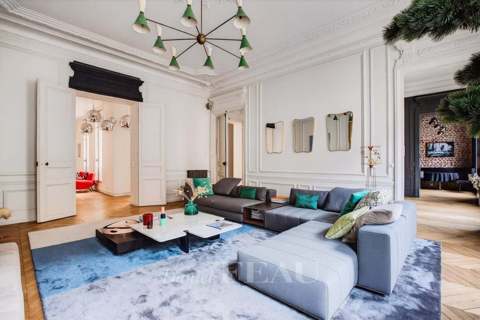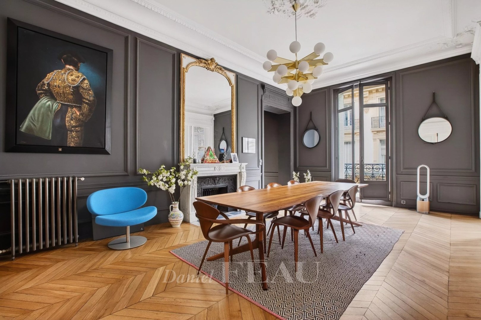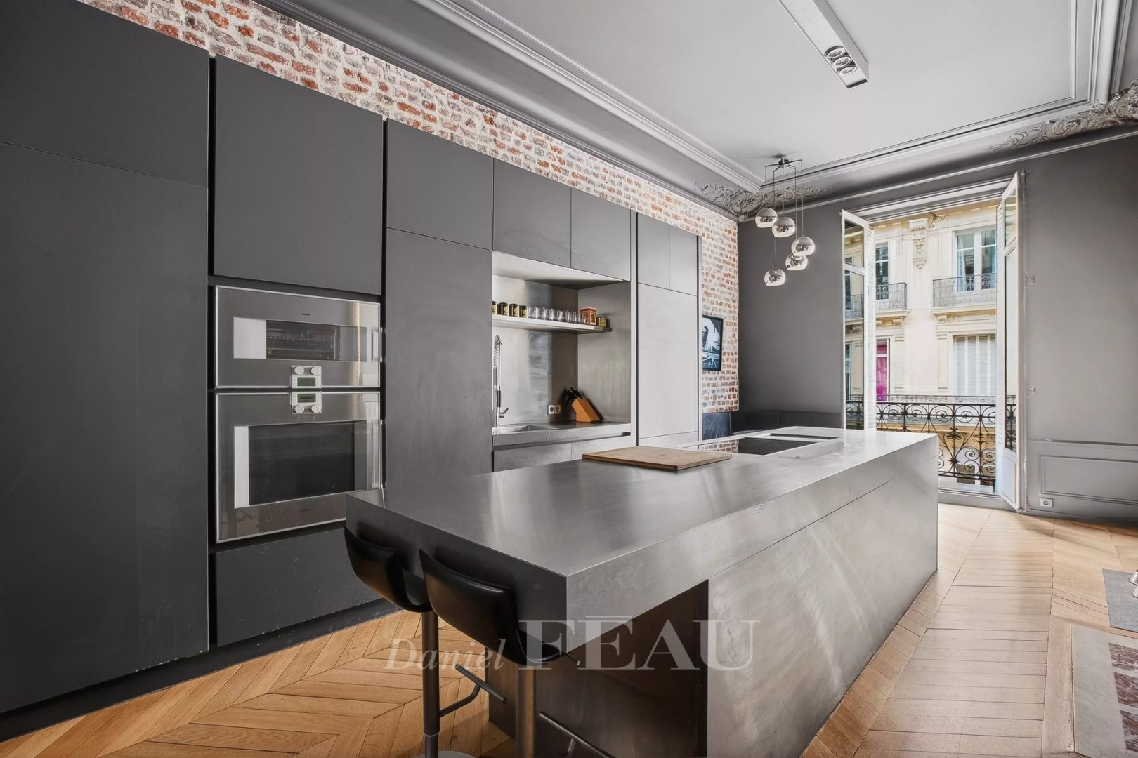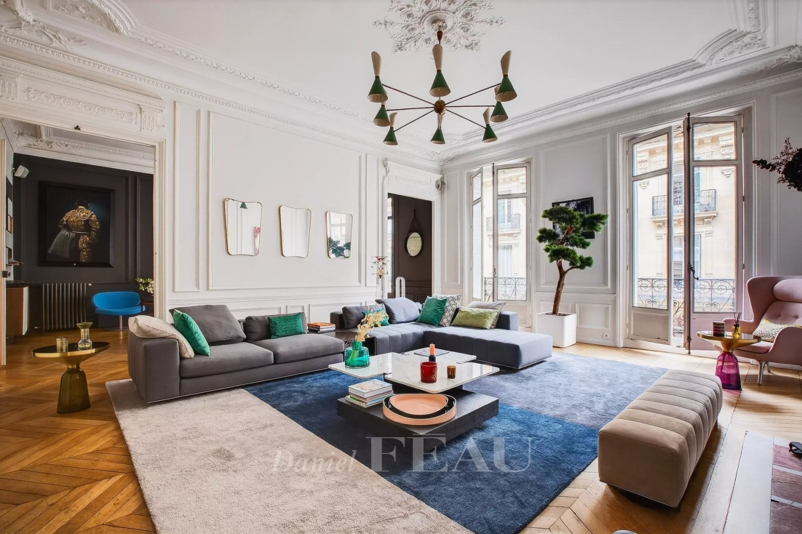 Sole Agent. Rue Meissonier- Rue de Prony. This luxurious apartment benefiting from a continuous balcony is on the second floor of an elegant late 19th century freestone building. Featuring 3.70 metre high ceilings with mouldings, Heriringbone parquet flooring and marble fireplaces, it includes a spacious entrance hall with a study area, a living/reception room with a dining room and a fully equipped kitchen with dining facilities, a bespoke wine cellar, a fitness/utility room, a master suite with a bath/shower room, a bedroom with a shower room, two further bedrooms with mezzanines, and a bathroom with a wc. Ample fitted storage space. With a cellar and two parking spaces in the building.