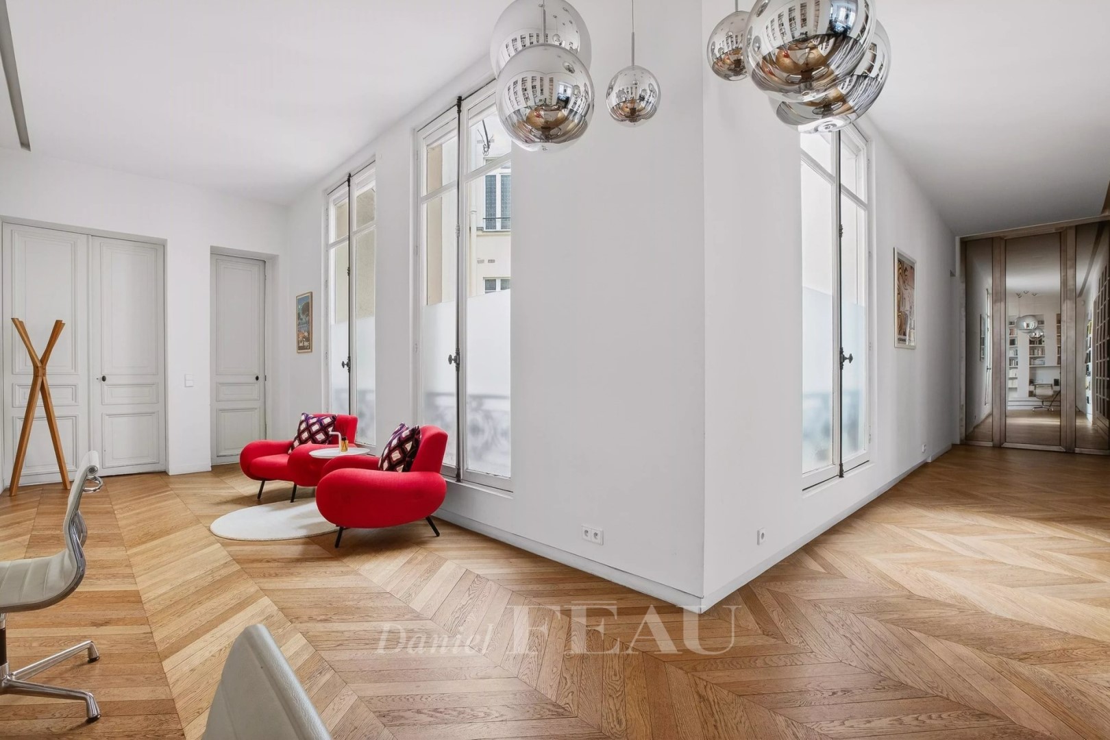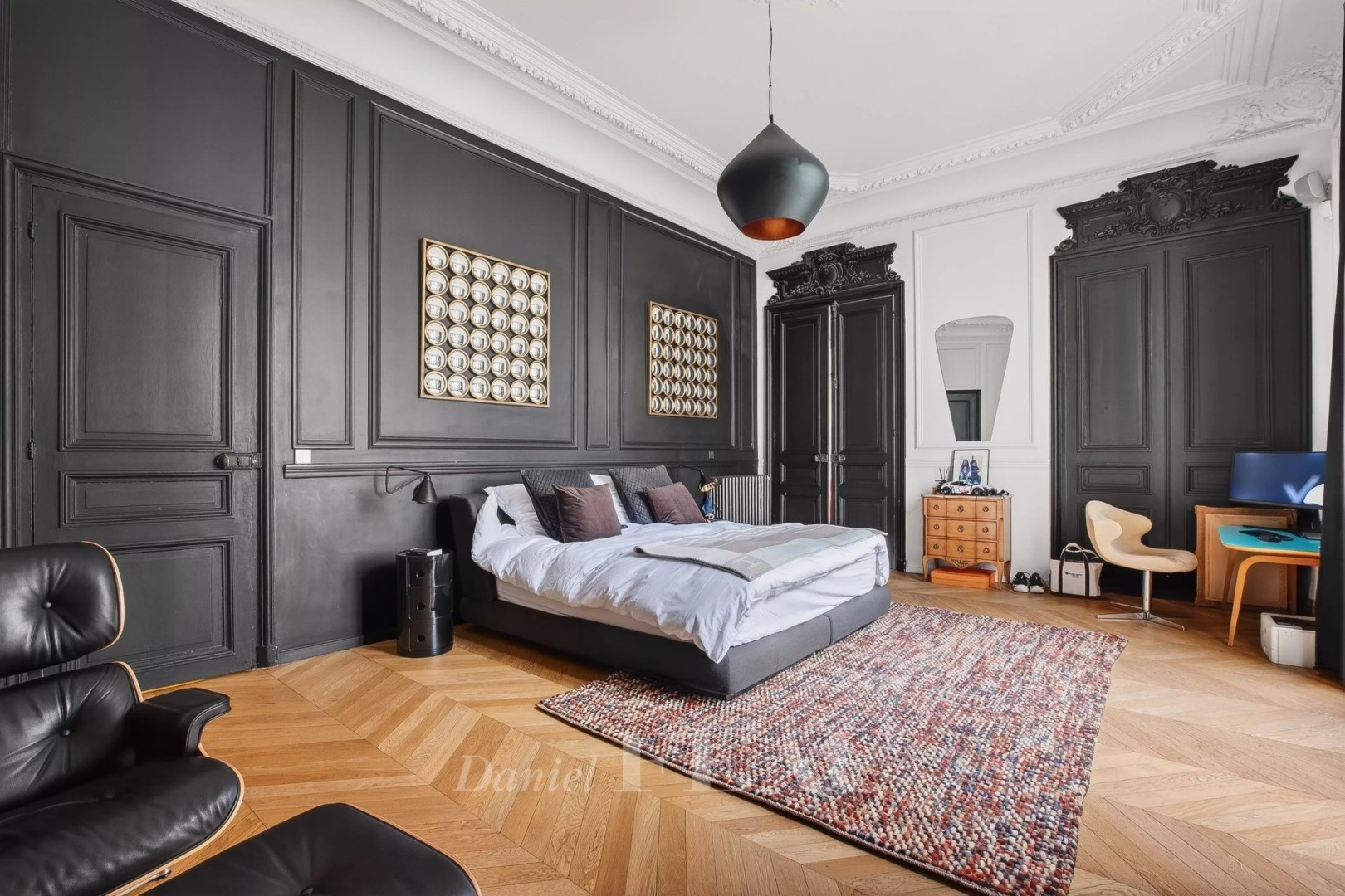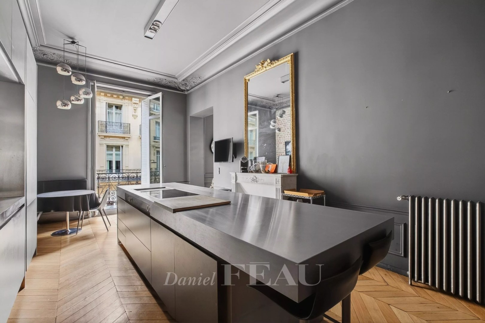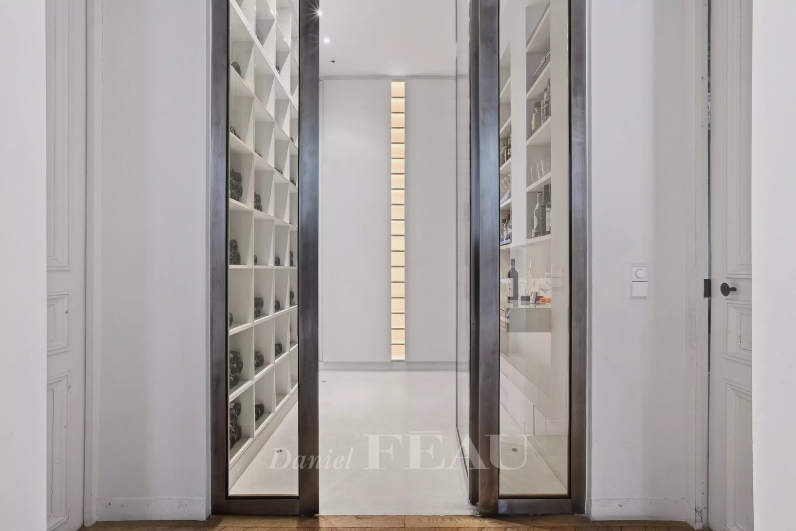 Sole Agent. Rue Meissonier- Rue de Prony. This luxurious apartment benefiting from a continuous balcony is on the second floor of an elegant late 19th century freestone building. Featuring 3.70 metre high ceilings with mouldings, Heriringbone parquet flooring and marble fireplaces, it includes a spacious entrance hall with a study area, a living/reception room with a dining room and a fully equipped kitchen with dining facilities, a bespoke wine cellar, a fitness/utility room, a master suite with a bath/shower room, a bedroom with a shower room, two further bedrooms with mezzanines, and a bathroom with a wc. Ample fitted storage space. With a cellar and two parking spaces in the building.