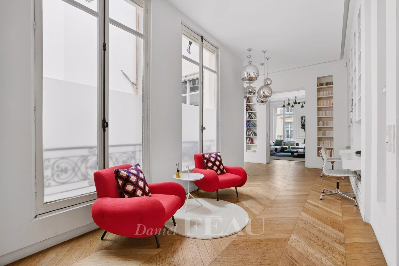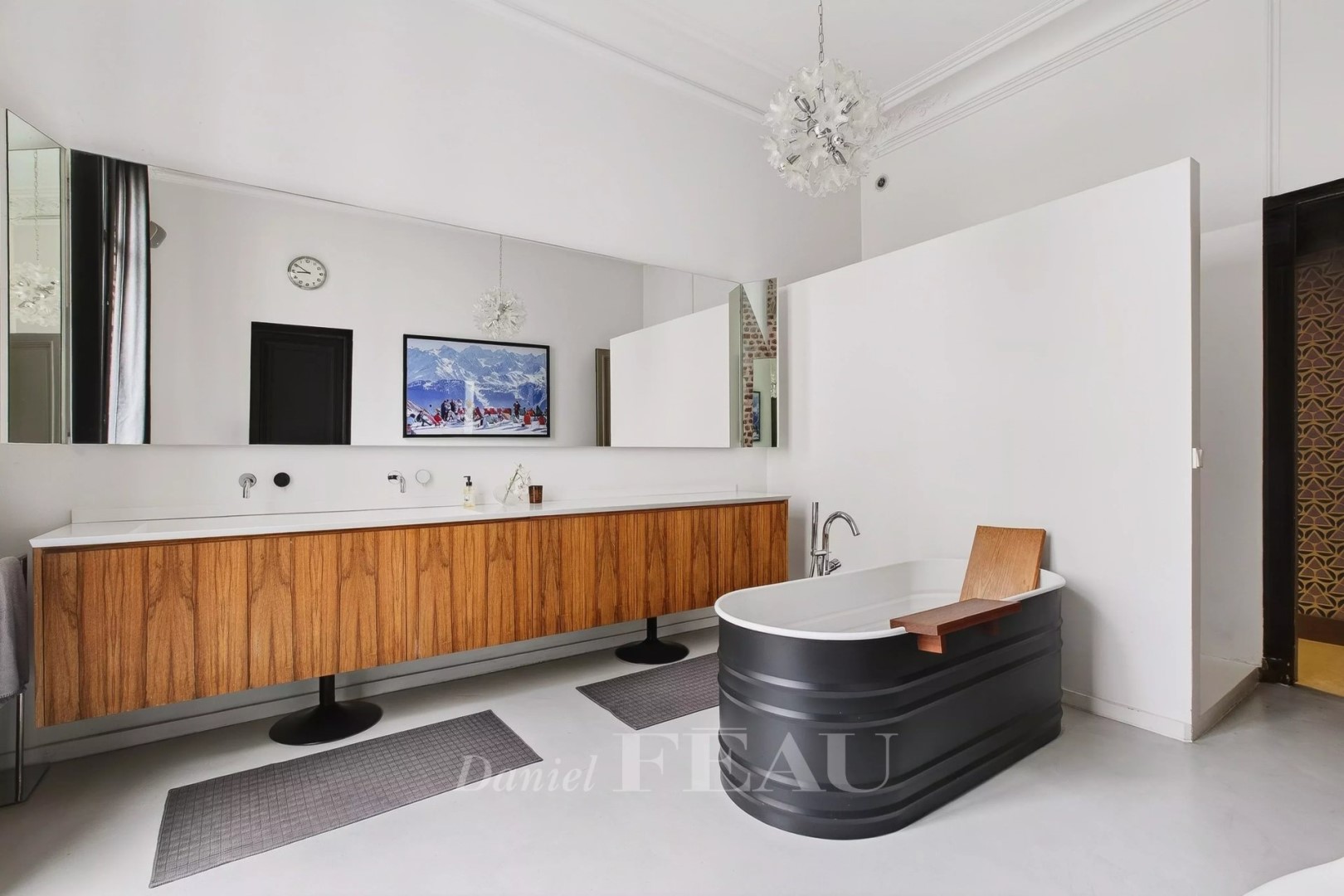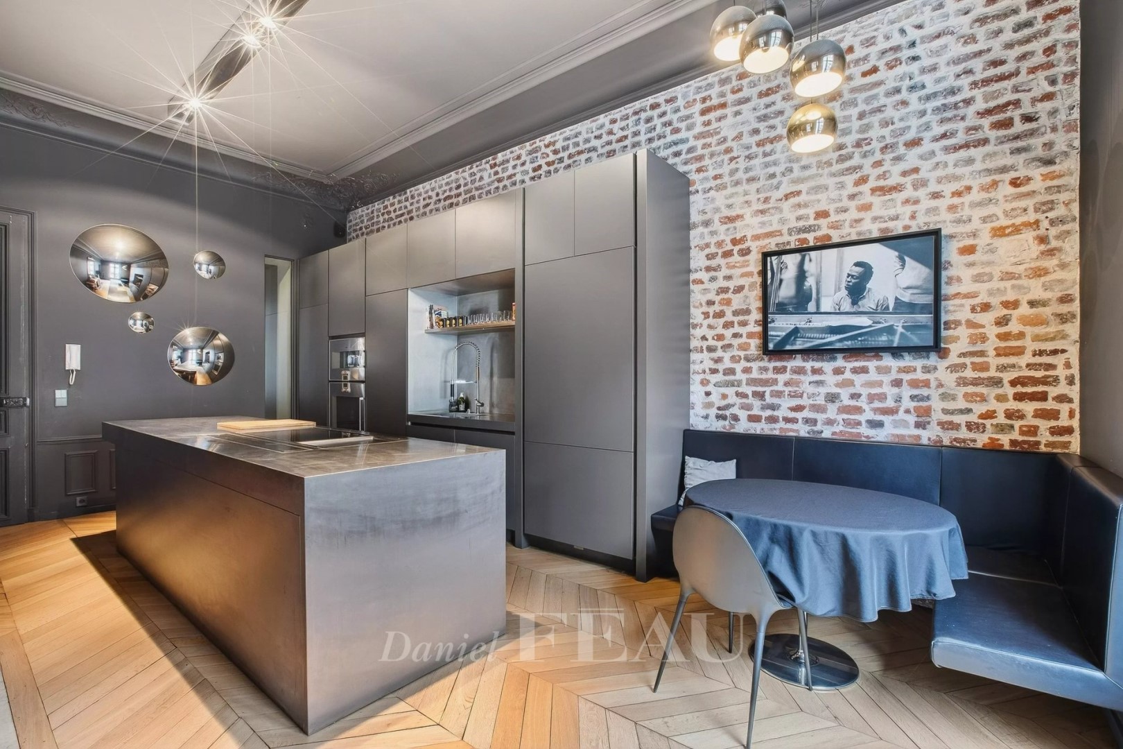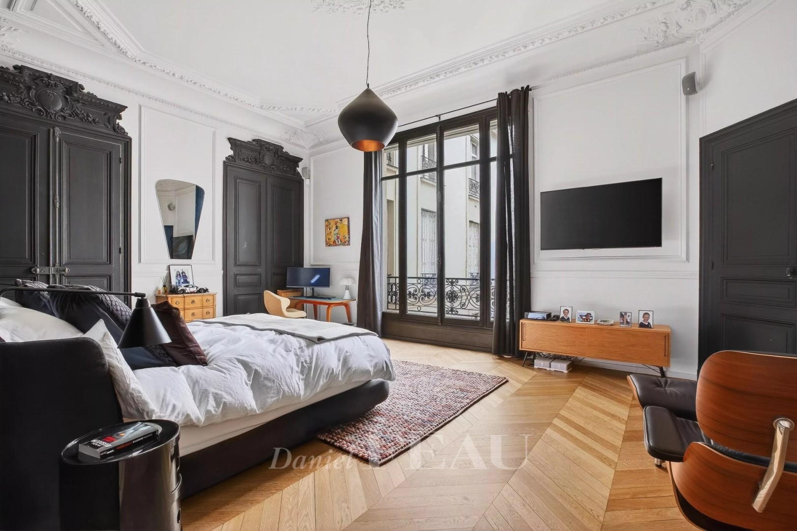 Sole Agent. Rue Meissonier- Rue de Prony. This luxurious apartment benefiting from a continuous balcony is on the second floor of an elegant late 19th century freestone building. Featuring 3.70 metre high ceilings with mouldings, Heriringbone parquet flooring and marble fireplaces, it includes a spacious entrance hall with a study area, a living/reception room with a dining room and a fully equipped kitchen with dining facilities, a bespoke wine cellar, a fitness/utility room, a master suite with a bath/shower room, a bedroom with a shower room, two further bedrooms with mezzanines, and a bathroom with a wc. Ample fitted storage space. With a cellar and two parking spaces in the building.