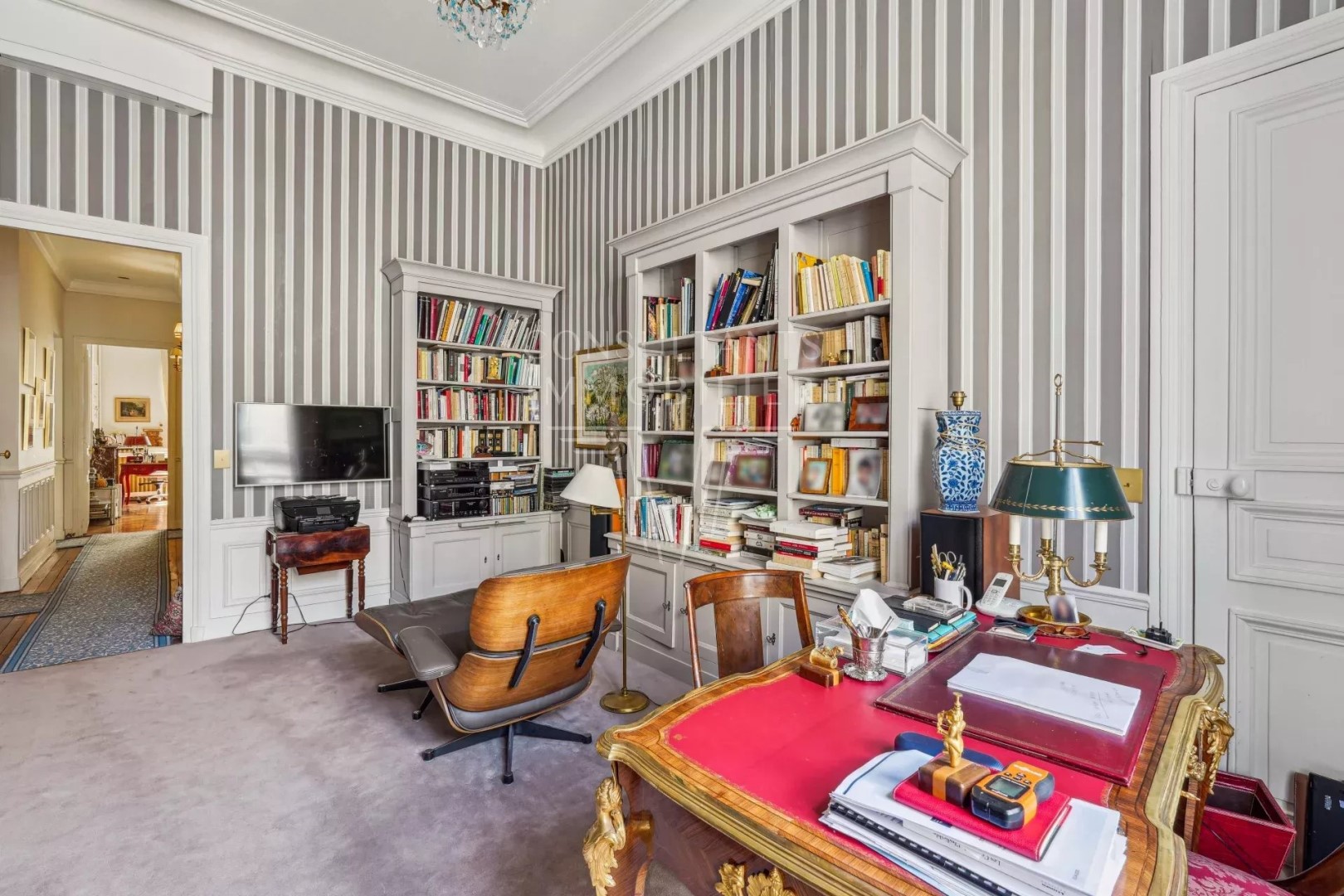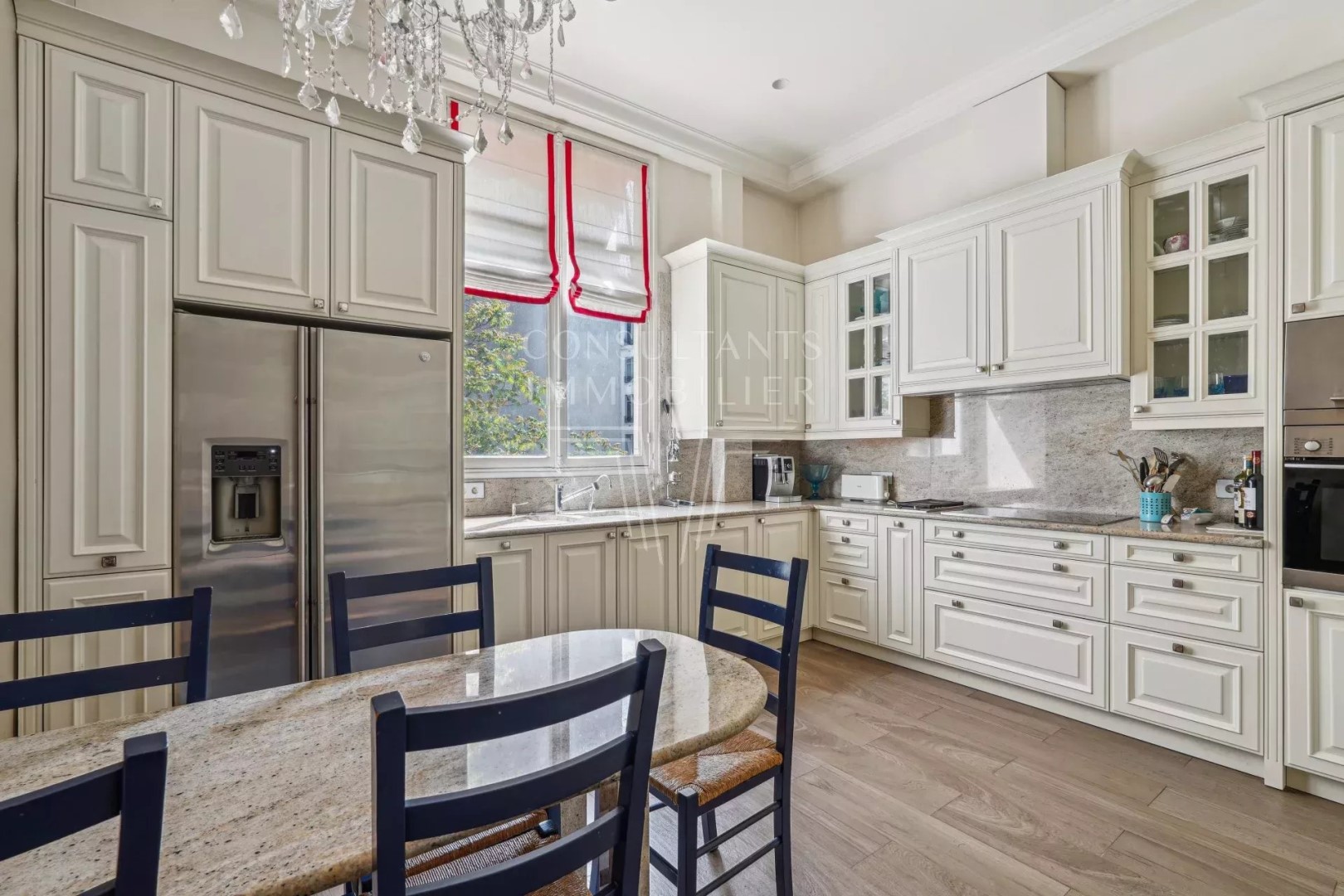 With an open view and south-east exposure this apartment225.3 m² (about 2422 ft²), built in 1890, in a building of 6 floors has 6 rooms including 4 bedrooms, 1 bathroom and 3 toilets. It has a living room 38.17 m² (about 410 ft²), dining room, a None, a balcony and a cellar. It's located on the 3rd floor with a lift. Heating : Collective gaz. Others : intercom, digicode, guard, fireplace. Fees : 2.759. This text is an automatic translation.