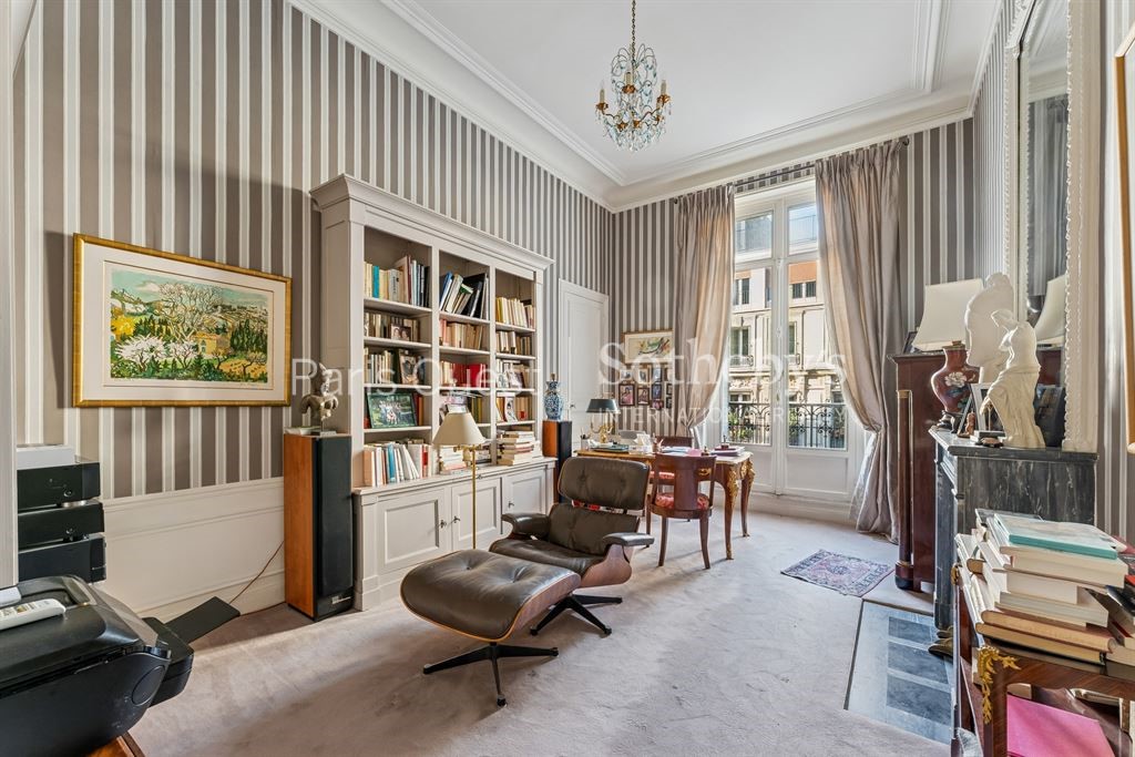 Located on the second floor of an elegant 1890 Haussmannian freestone building, this exceptional reception and family apartment perfectly embodies the essence of refined Parisian living.<BR><BR>From the moment you enter, a majestic gallery hallway with bespoke built-in wardrobes sets the tone, revealing the property's noble proportions and high-quality finishes. It leads to a sumptuous double reception room of approximately 40 sqm, bathed in natural light through large windows, creating an ideal setting for both entertaining and everyday living. Extending from this space, a separate 28 sqm dining room opens onto a continuous balcony, offering a charming outlook and an elegant backdrop for distinguished gatherings.<BR><BR>The private quarters have been thoughtfully designed for harmonious family living and feature a master suite with dressing room and en-suite shower room with toilet, three additional generously sized bedrooms, two further shower rooms with toilets, and a guest powder room. A stylish eat-in kitchen and an independent laundry room complete the perfectly optimized layout.<BR><BR>Boasting impressive 3.80-meter ceiling heights, spectacular volumes, and an excellent floor plan, the apartment exudes a rare sense of space and prestige. Period features have been carefully preserved and enhanced, including herringbone parquet flooring, intricate moldings, ornate fireplaces, and original woodwork, all underscoring the property's timeless character.<BR><BR>A 25 sqm cellar adds valuable storage space, and two parking spaces are available in the immediate vicinity.<BR><BR>Presented in very good overall condition, this remarkable residence seamlessly blends historic charm with modern comfort, offering an exceptional lifestyle opportunity in the heart of Paris.