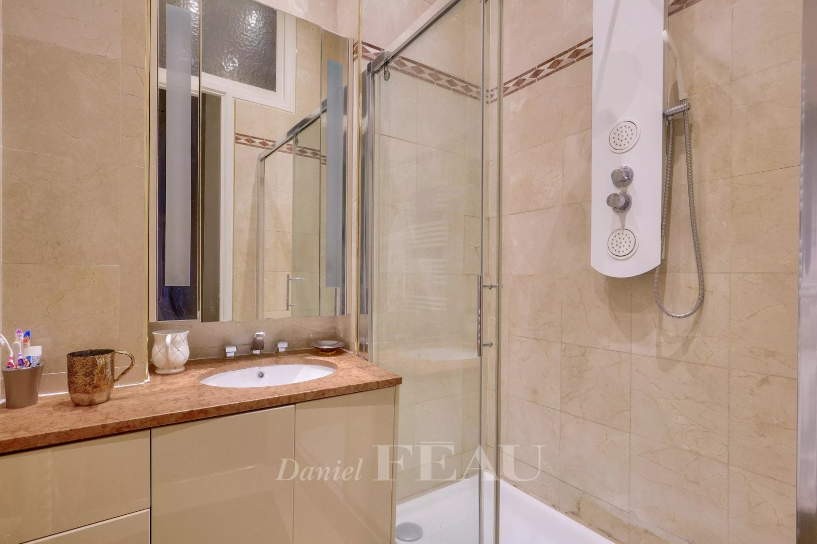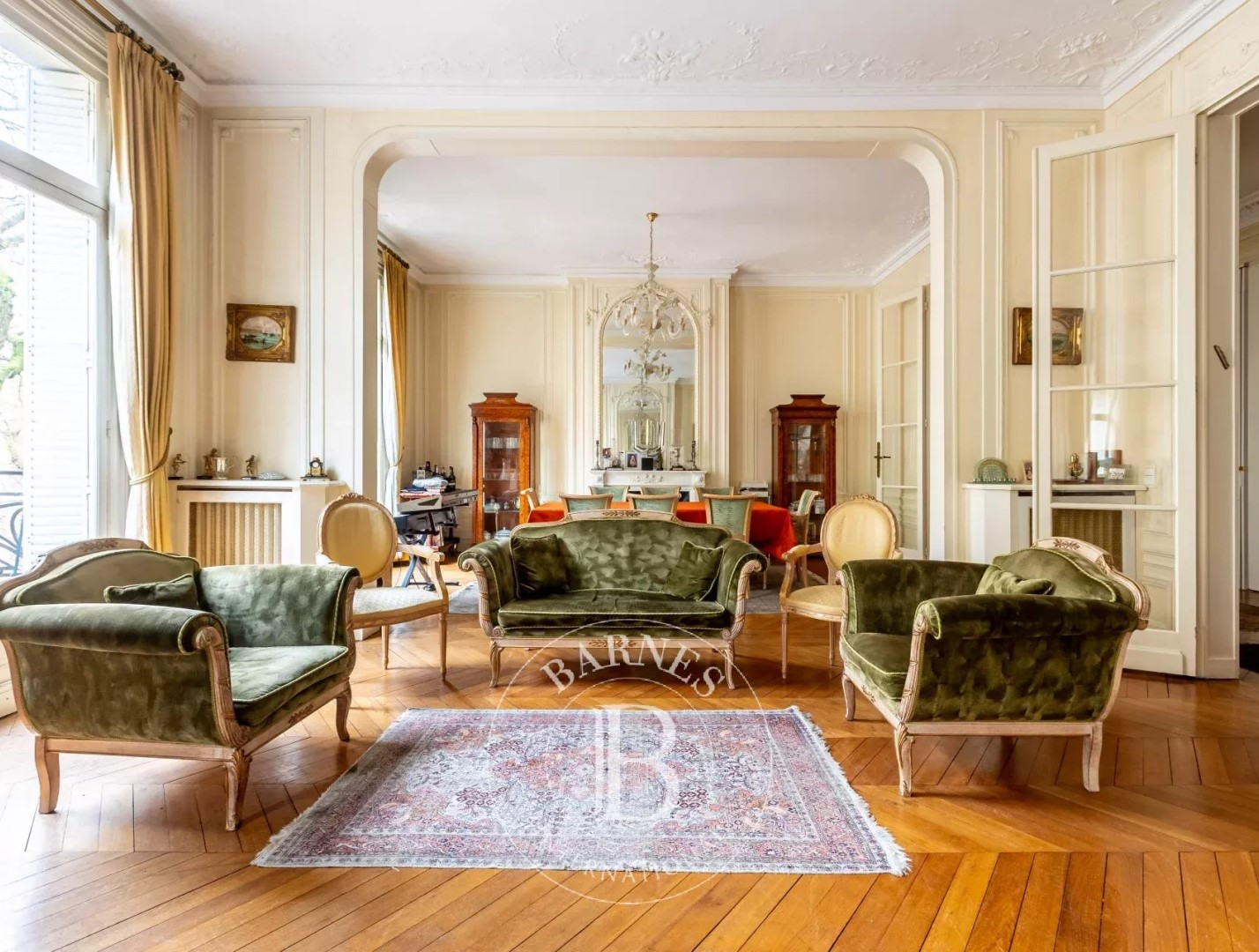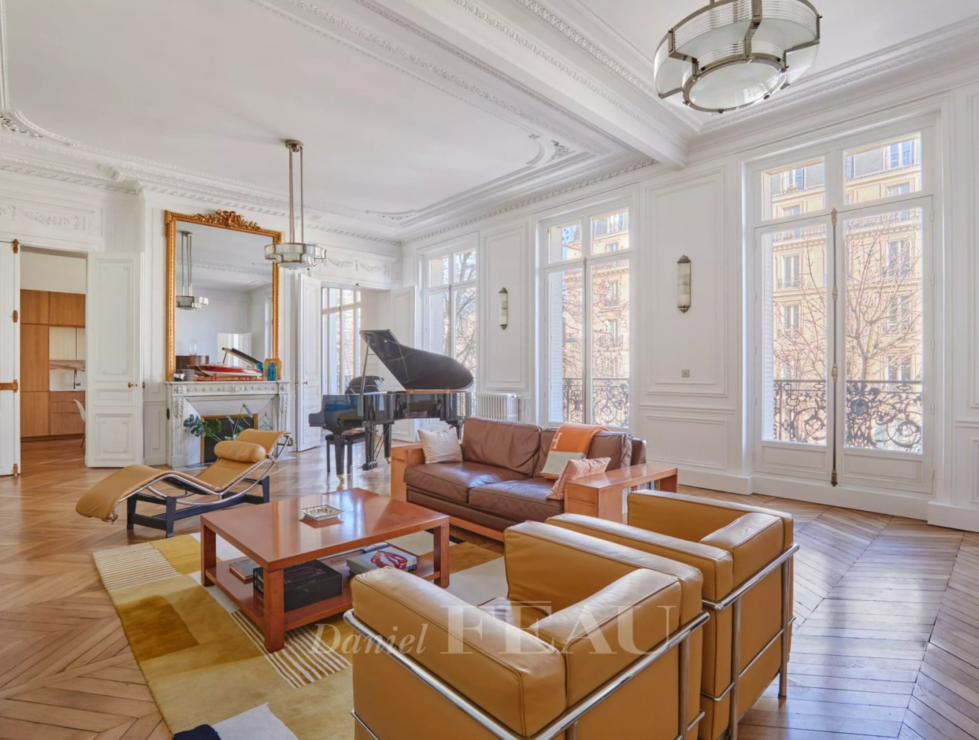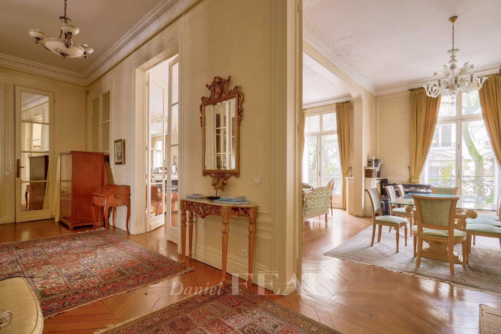 Rue Georges Berger, in the immediate vicinity of leafy Parc Monceau. This elegant 260 sqm apartment is on the 2nd floor of a luxurious late 19th century freestone building. A spacious entrance hall leads to a double living/reception room featuring 3.70 metre high ceilings with mouldings, parquet flooring and a fireplace, a dining room overlooking a courtyard, a guest wc, a spacious kitchen with dining facilities, a master suite with a bathroom, a shower room, three further bedrooms (one with a dressing room), and a utility room. A second kitchen could create a further bathroom. With a maid’s bedroom and a cellar. Renovation is required to exploit the full potential.