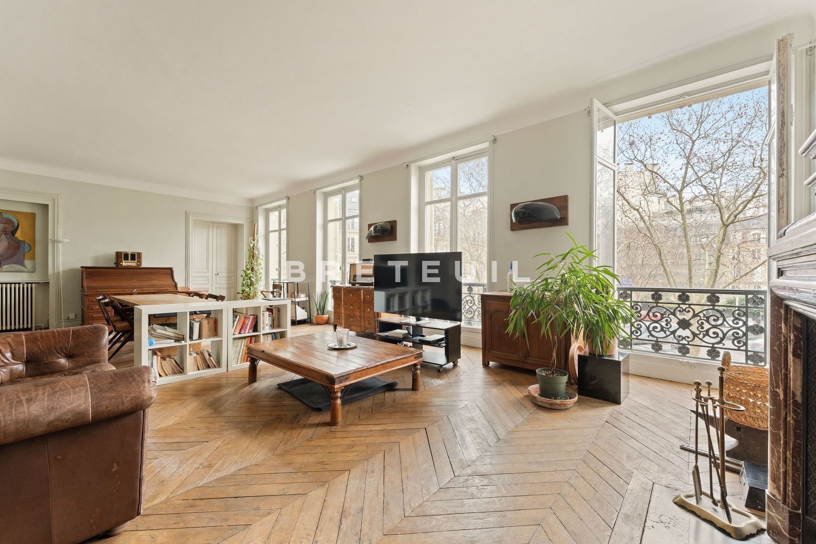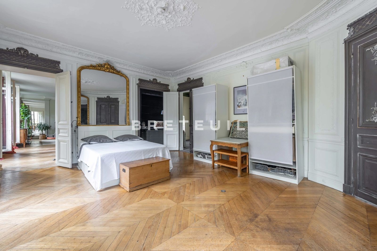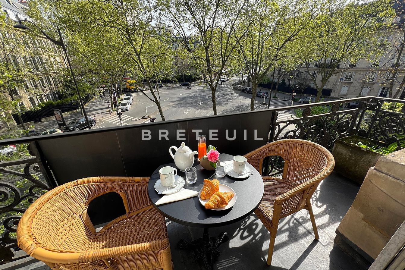 Villiers/Wagram. In a beautiful old building with live-in janitor, on the noble floor with elevator access, 196 m² family and reception apartment with unobstructed, tree-lined, unoverlooked view. Entrance hall, 57 m² double living and dining room (parquet flooring, moldings, fireplaces and 3.20 m high ceilings), adjoining open-plan kitchen, three bedrooms, one with balcony, three bathrooms, two toilets, laundry room, dressing room. Modular layout (4th bedroom possible). Large cellar. Fully renovated condominium (roof, facade, common areas, elevator).