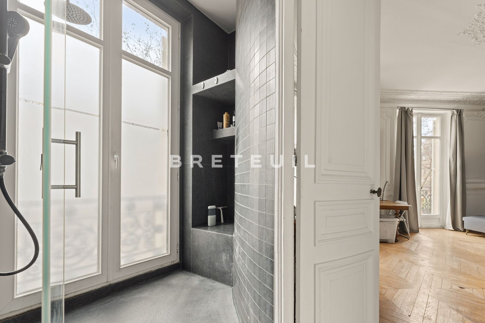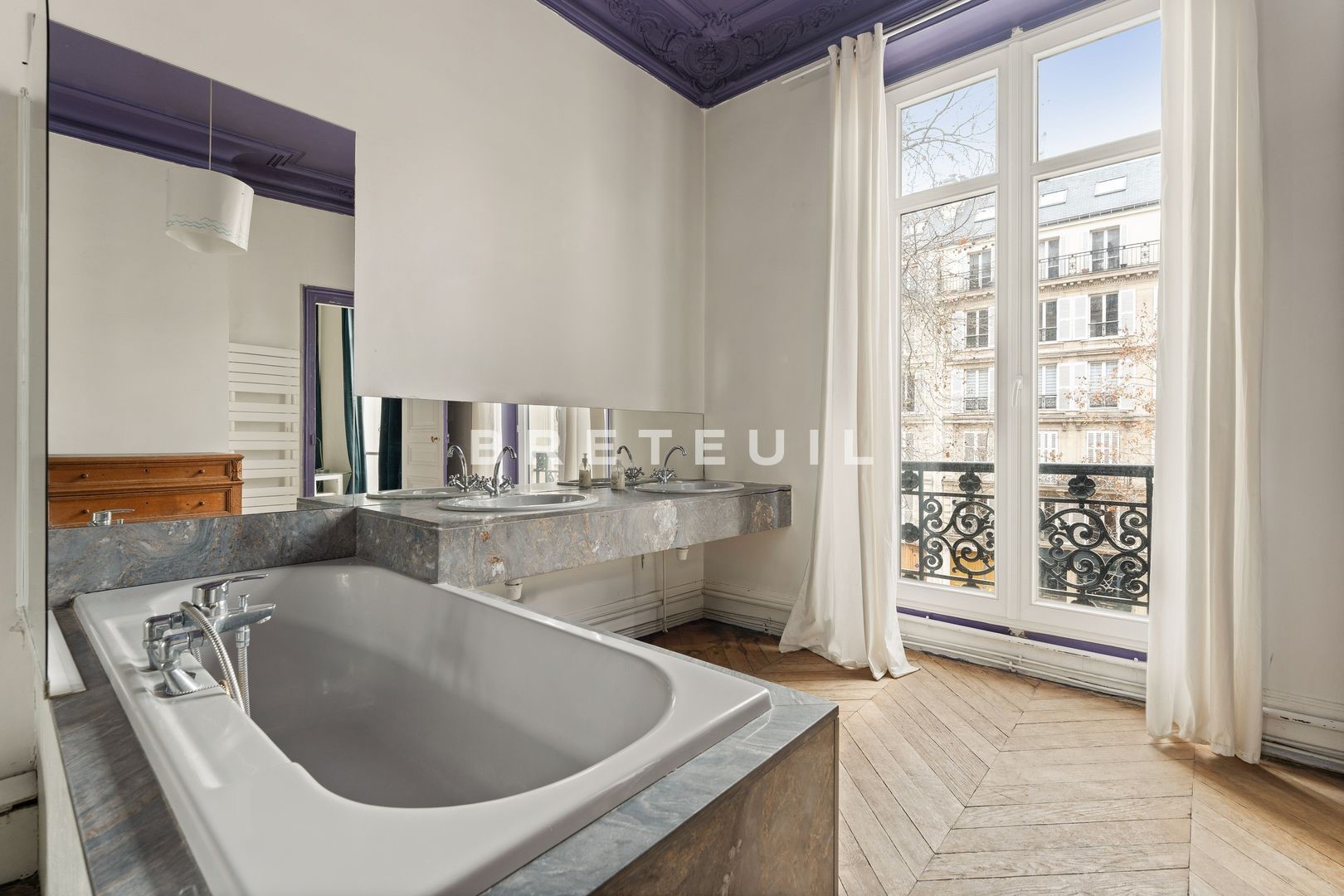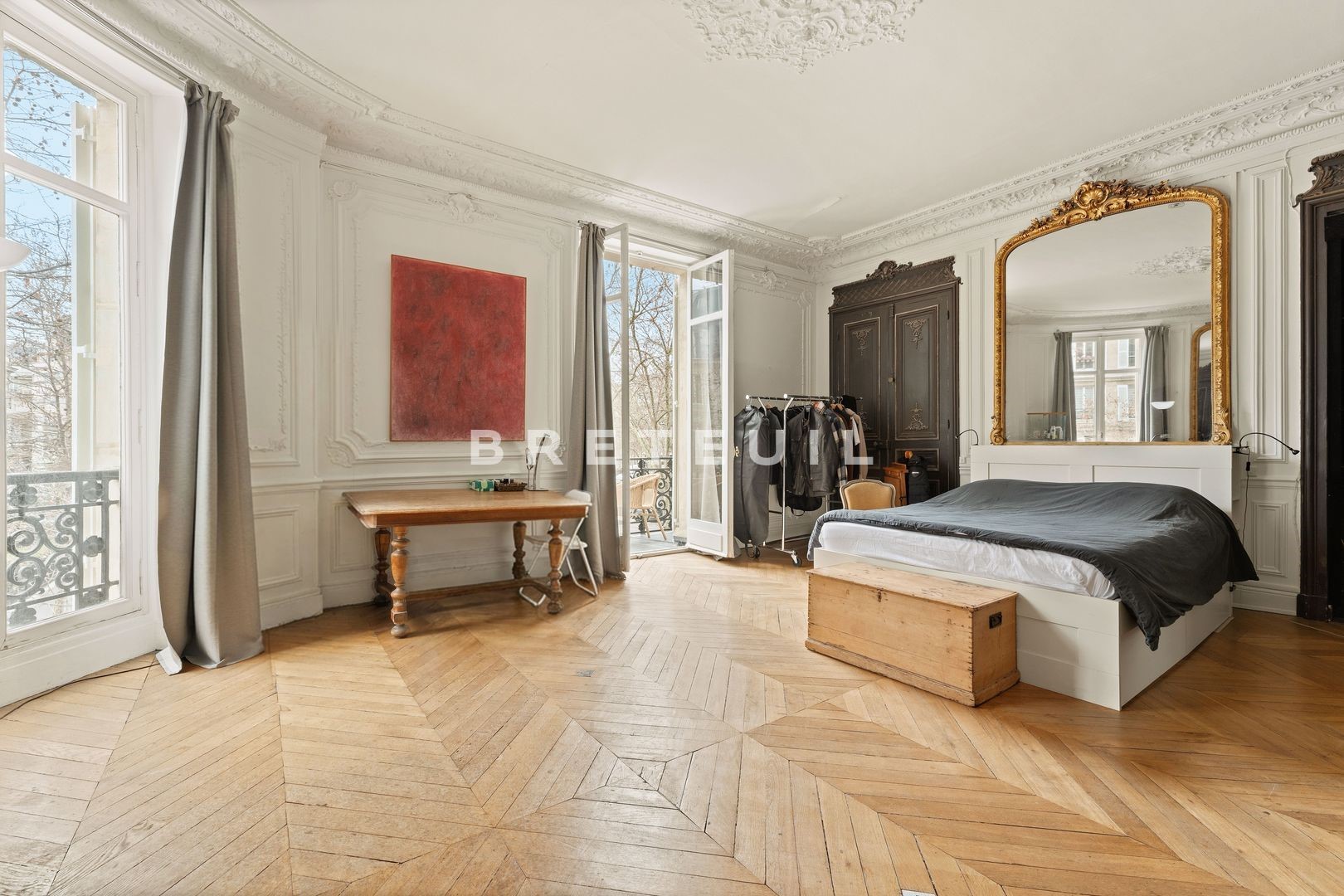 Villiers/Wagram. In a beautiful old building with live-in janitor, on the noble floor with elevator access, 196 m² family and reception apartment with unobstructed, tree-lined, unoverlooked view. Entrance hall, 57 m² double living and dining room (parquet flooring, moldings, fireplaces and 3.20 m high ceilings), adjoining open-plan kitchen, three bedrooms, one with balcony, three bathrooms, two toilets, laundry room, dressing room. Modular layout (4th bedroom possible). Large cellar. Fully renovated condominium (roof, facade, common areas, elevator).