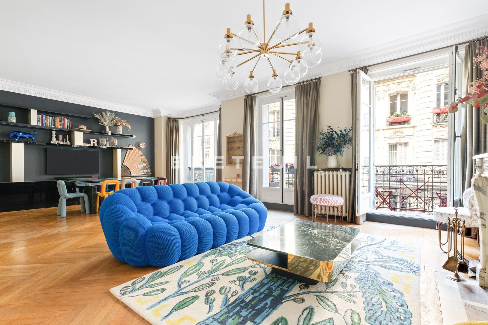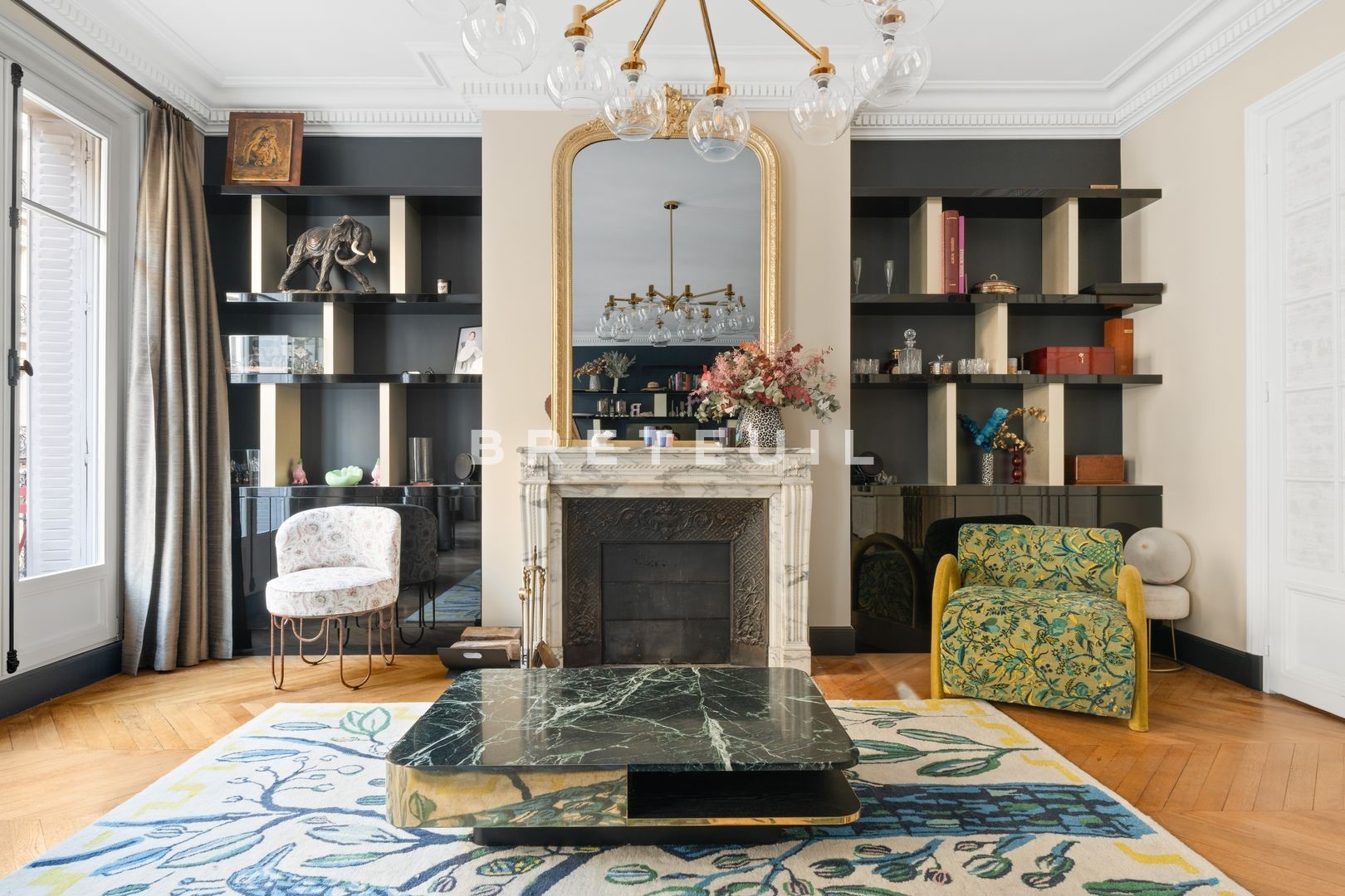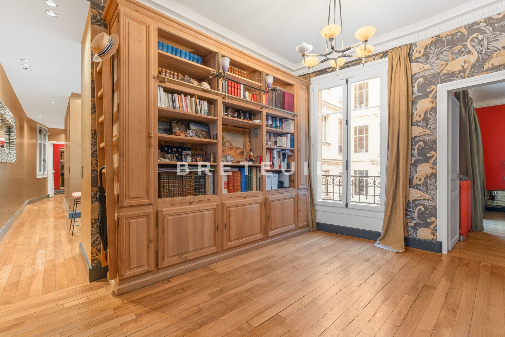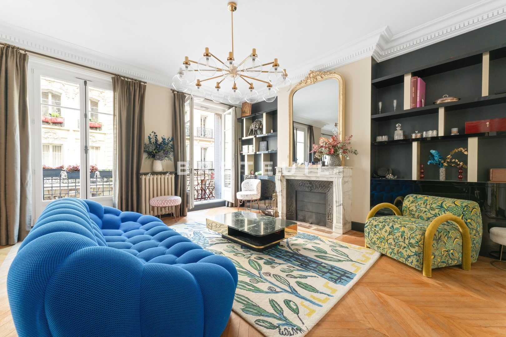 Ideally located in a quiet, residential street, just a stone's throw from Parc Monceau, Place des Ternes and Marché Poncelet, this beautiful, fully-renovated, walk-through family apartment (172 m² Loi Carrez) is on the 2nd floor of a Haussmann-style building served by an elevator and with a live-in janitor. Entrance gallery, double reception room of approx. 50 m² with two balconies, fitted kitchen/diner, two suites with their own bathroom and toilet, a third bedroom and an office/library area that could be converted into a 4th bedroom. Old world charm, herringbone parquet flooring, moldings, fireplaces. Refurbished in 2020 by architect Olivia Massimi. Guest toilet, plenty of storage space. Carnot middle and high school sectorization. Cellar. Parking available at extra cost.