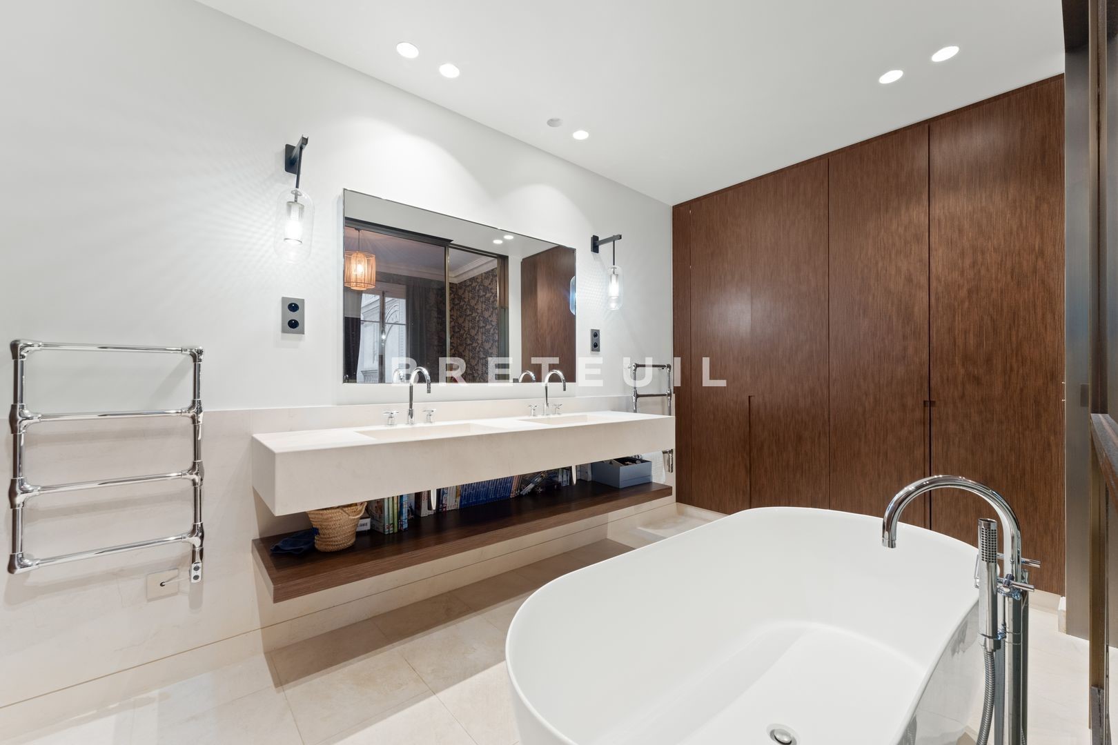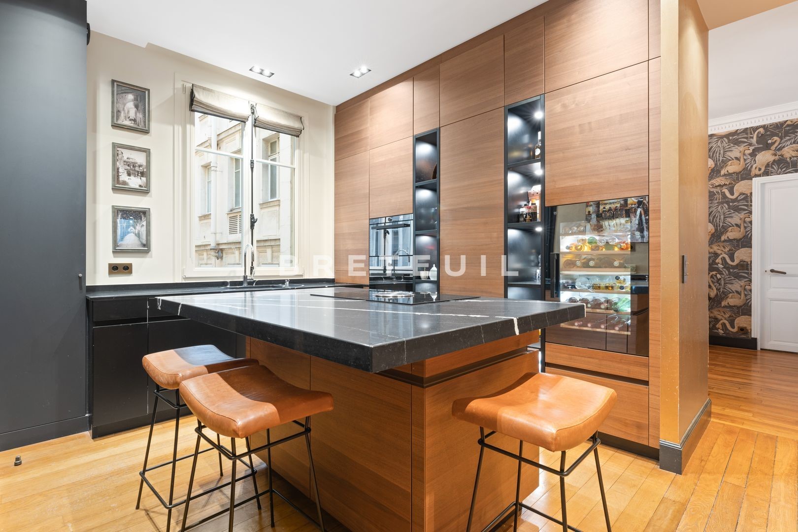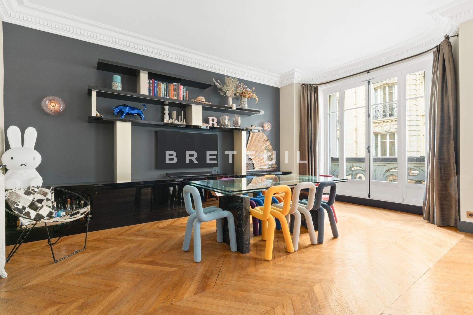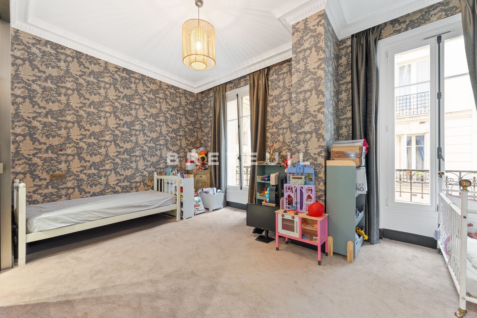 Ideally located in a quiet, residential street, just a stone's throw from Parc Monceau, Place des Ternes and Marché Poncelet, this beautiful, fully-renovated, walk-through family apartment (172 m² Loi Carrez) is on the 2nd floor of a Haussmann-style building served by an elevator and with a live-in janitor. Entrance gallery, double reception room of approx. 50 m² with two balconies, fitted kitchen/diner, two suites with their own bathroom and toilet, a third bedroom and an office/library area that could be converted into a 4th bedroom. Old world charm, herringbone parquet flooring, moldings, fireplaces. Refurbished in 2020 by architect Olivia Massimi. Guest toilet, plenty of storage space. Carnot middle and high school sectorization. Cellar. Parking available at extra cost.