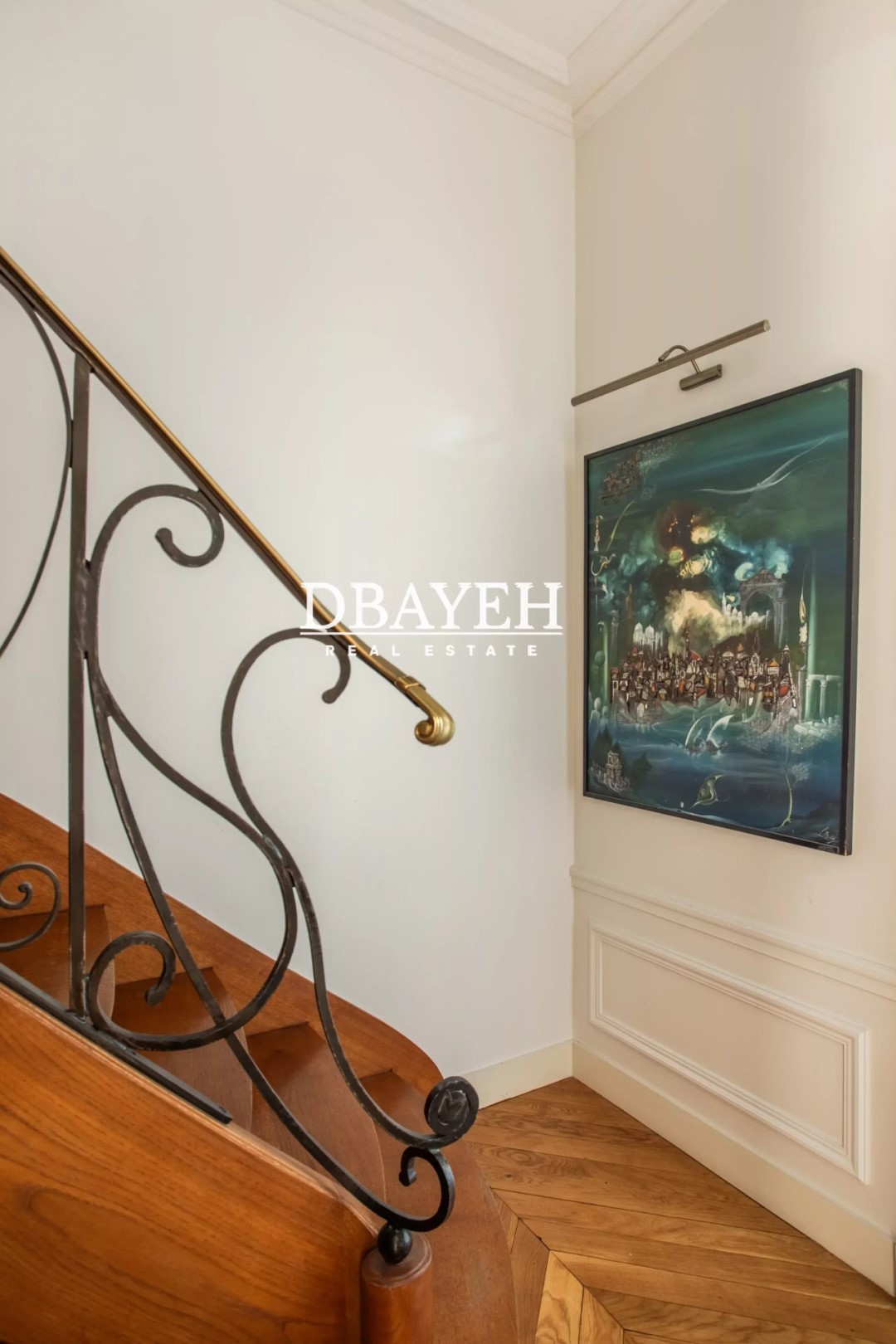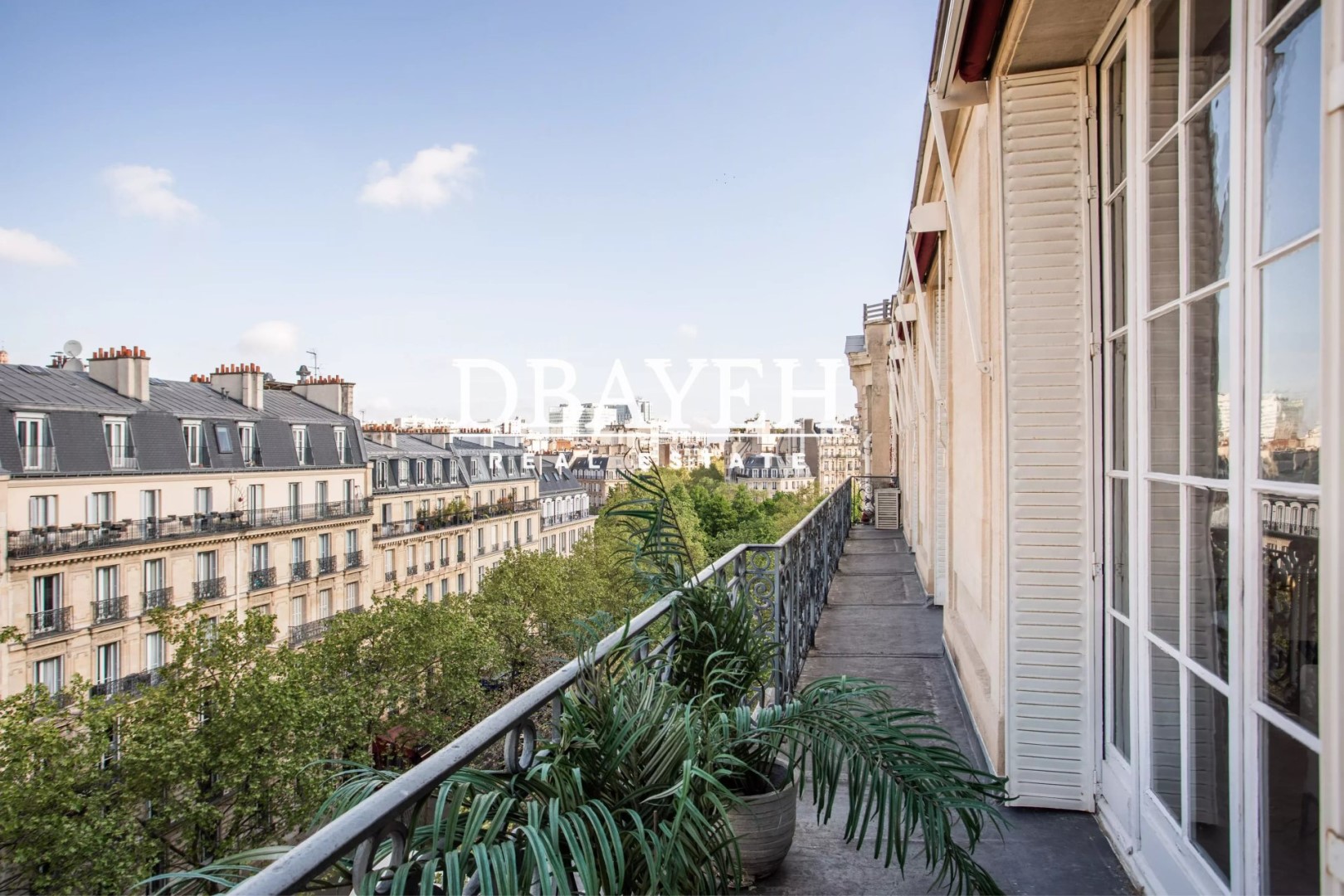 Paris 17th - Niel - Duplex 4/5 bedrooms - Top floors - Continuous balconies At the top floors of a high standing Haussmannian building, a duplex apartment of 272.24 sqm Carrez (total surface area of 281.52 sqm) as well as two continuous balconies of 16.49 sqm and 21.7 sqm respectively. The apartment benefits from a triple exposure. On the first level, it includes an entrance, a double reception, a dining kitchen (Siematic) with a large glass roof opening onto a large quiet courtyard balcony, a master bedroom with a dressing room, a bathroom and shower, two bedrooms, a bathroom with bathtub, shower, and toilet, a children's play and work area, a laundry room, and a separate guest toilet. Upstairs, a 4th large bedroom, a shower room with toilet, and an office. Beautiful ceiling height, parquet flooring, moldings, fireplaces. Unobstructed views and very good brightness. Two cellars complete this exceptional property as well as a 21m² studio with kitchenette and shower room and toilet (additional to the price at €250,000)