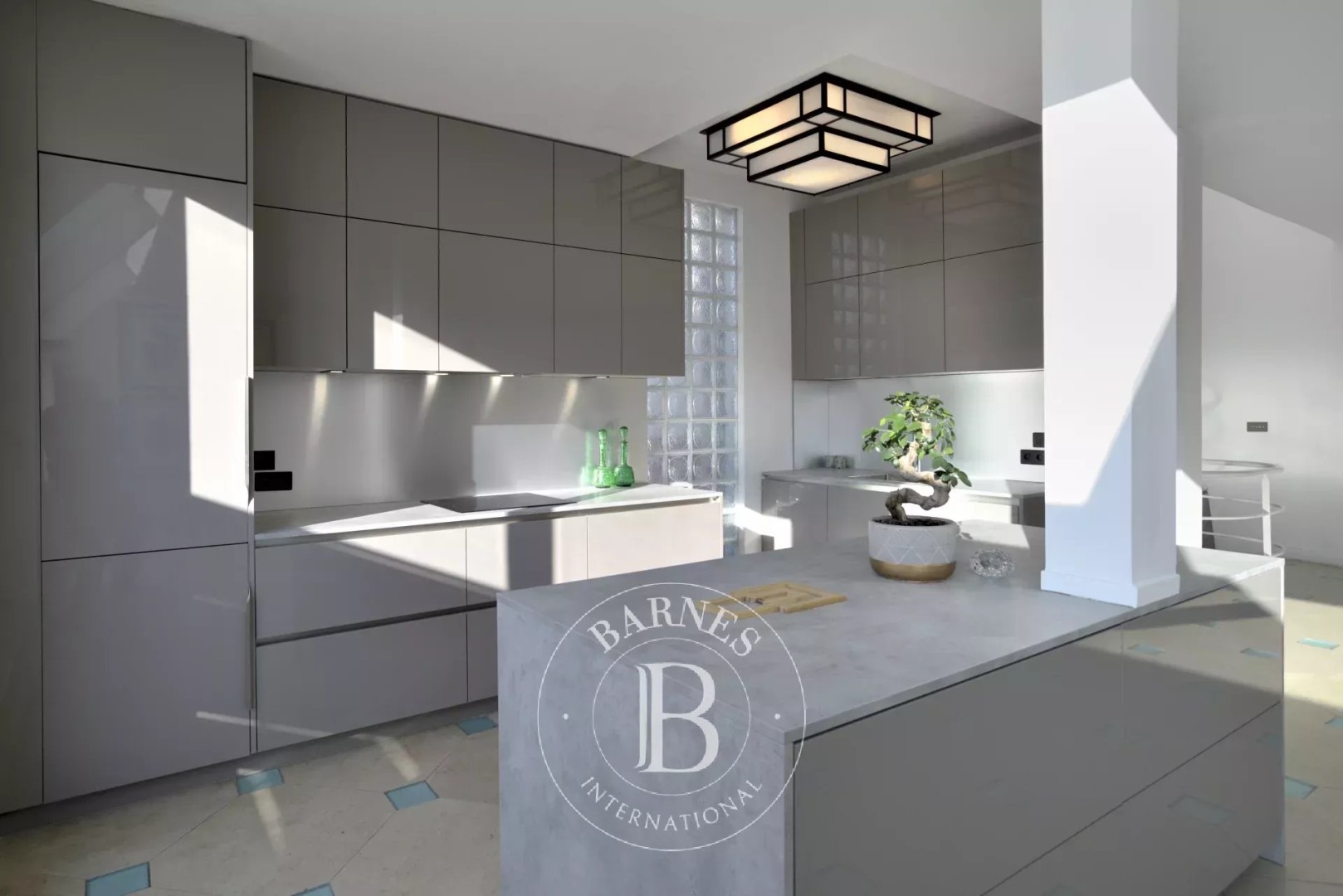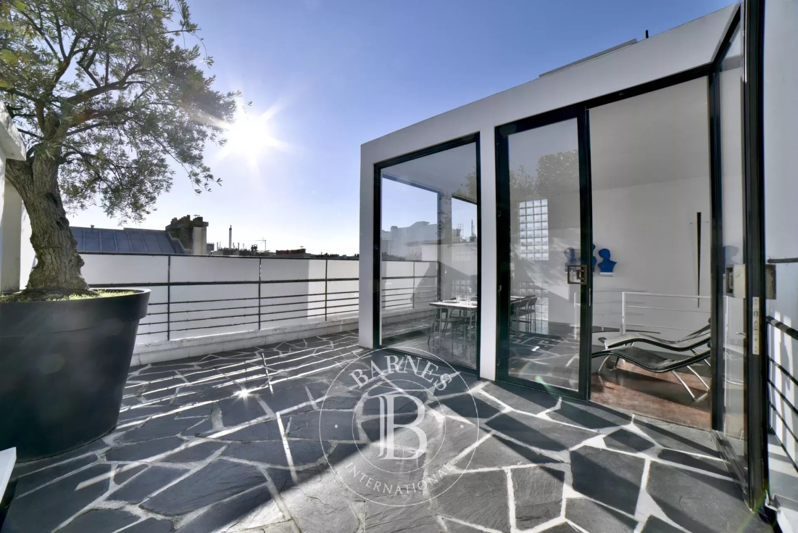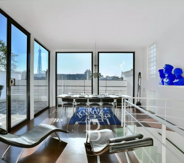 Set in a quiet street just off the Trocadéro, this unique triplex apartment is located on the top floors of a remarkable freestone building known as ‘la Maison de Verre’. With a surface area of 230 m², it boasts a superb 32 m² south-facing terrace with uninterrupted views of the Eiffel Tower. Steeped in history, this rare property combines modernist architecture with spectacular volumes. It comprises a vast 82 m² living room with open-plan kitchen, five beautiful bedrooms, two of which have large balconies, and retains decorative features that are emblematic of its era, including a granite glass staircase by Saint-Gobain (1929), the real centrepiece of the flat. Bathed in light throughout the day, this penthouse captivates with its unique atmosphere and timeless elegance. A cellar and nearby parking space (extra charge) complete this exceptional property. Subject to co-ownership.