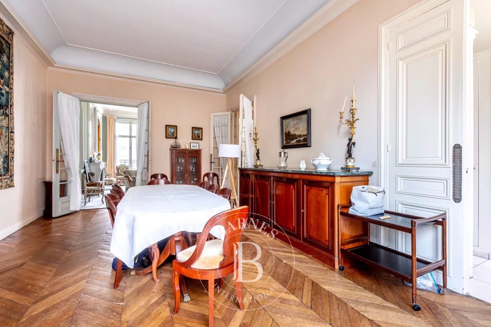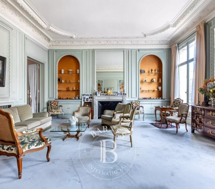Paris 17th Arrondissement, Parc Monceau - 5-Bedroom Family and Reception Apartment - Continuous Balcony Ideally located near Parc Monceau on a charming, quiet, and prestigious street, this 230 sq m (2,475 sq ft) apartment is situated on the 3rd floor, the only unit on the landing, with a continuous balcony. Boasting impressive 3.70 m (10 ft 11 in) ceilings, this property offers very spacious rooms. It comprises: an entrance gallery, a double reception room, a dining room, a kitchen with a pantry, a guest toilet, a master suite overlooking the street with a bathroom/toilet, a bathroom, a bedroom with its own shower room/toilet, and three further bedrooms, one with a washroom. This property, which requires renovation, has retained all its original features (parquet flooring, moldings, fireplaces) and has an excellent layout with plumbing connections throughout. The apartment also includes two large cellars (20.3 and 14.6 sq m / 216 and 150 sq ft). Additionnally to the price, there are two separate staff rooms on the 6th floor, each with its own washbasin with an additional optional 2 parking spots. Carnot school district