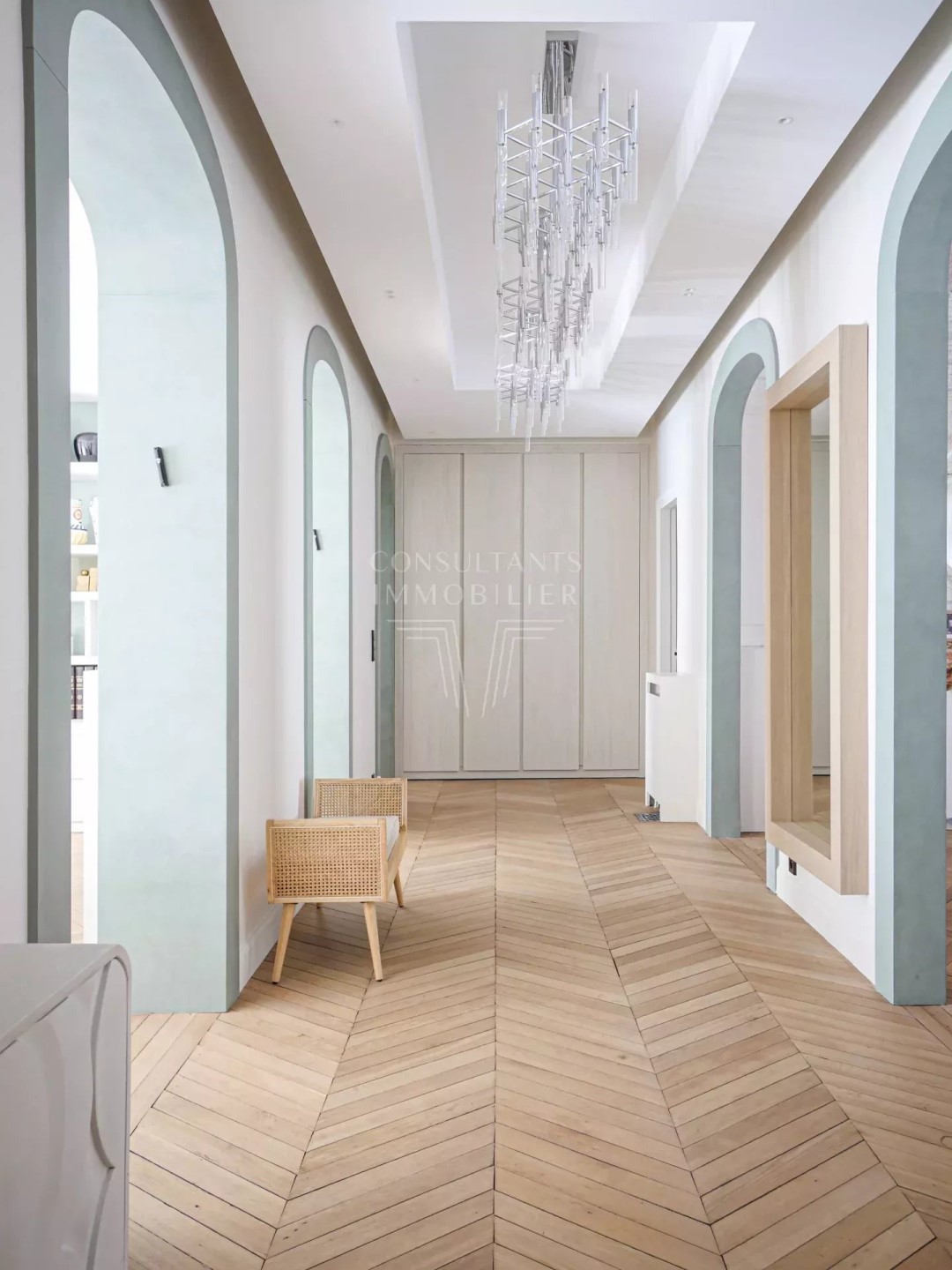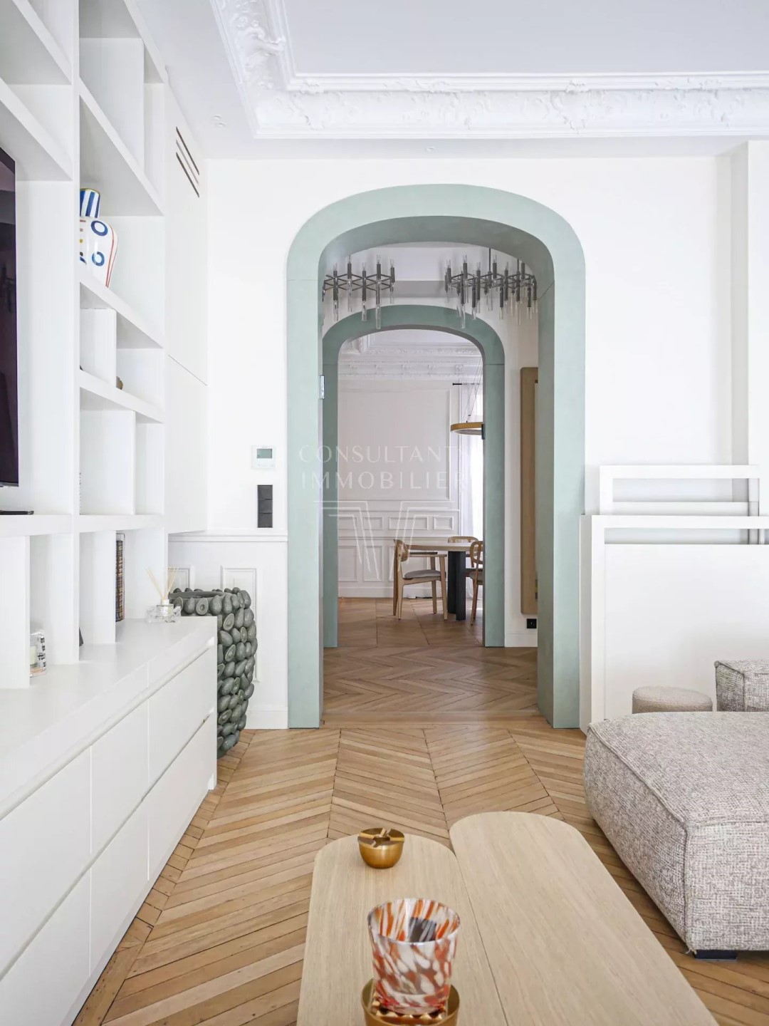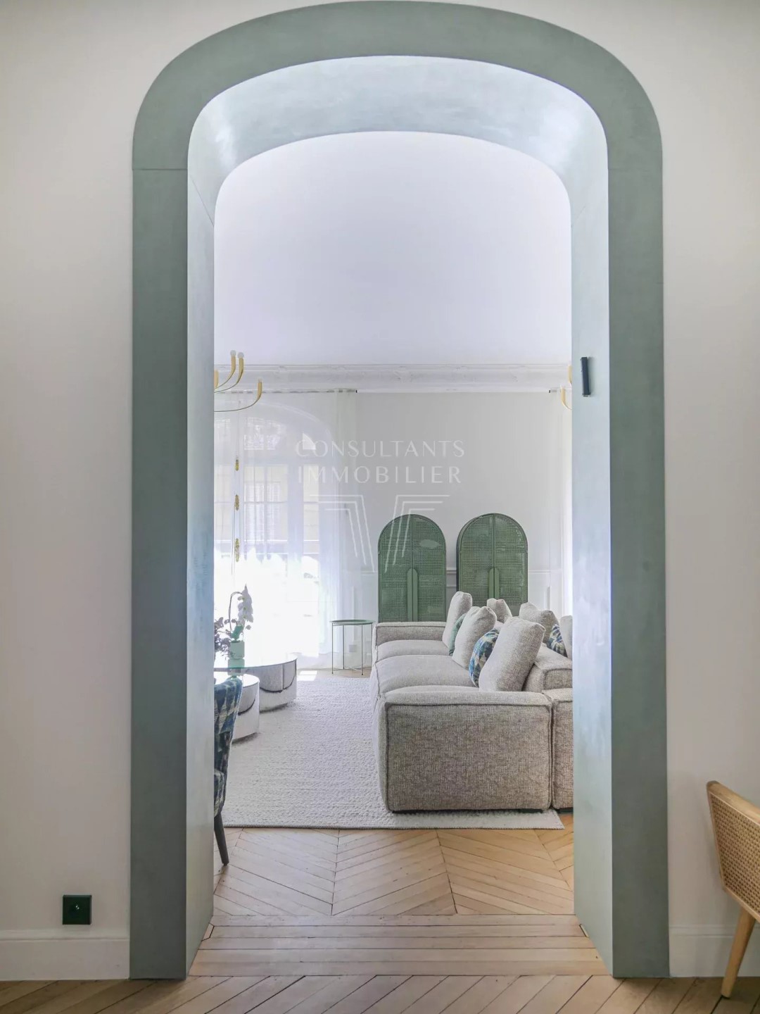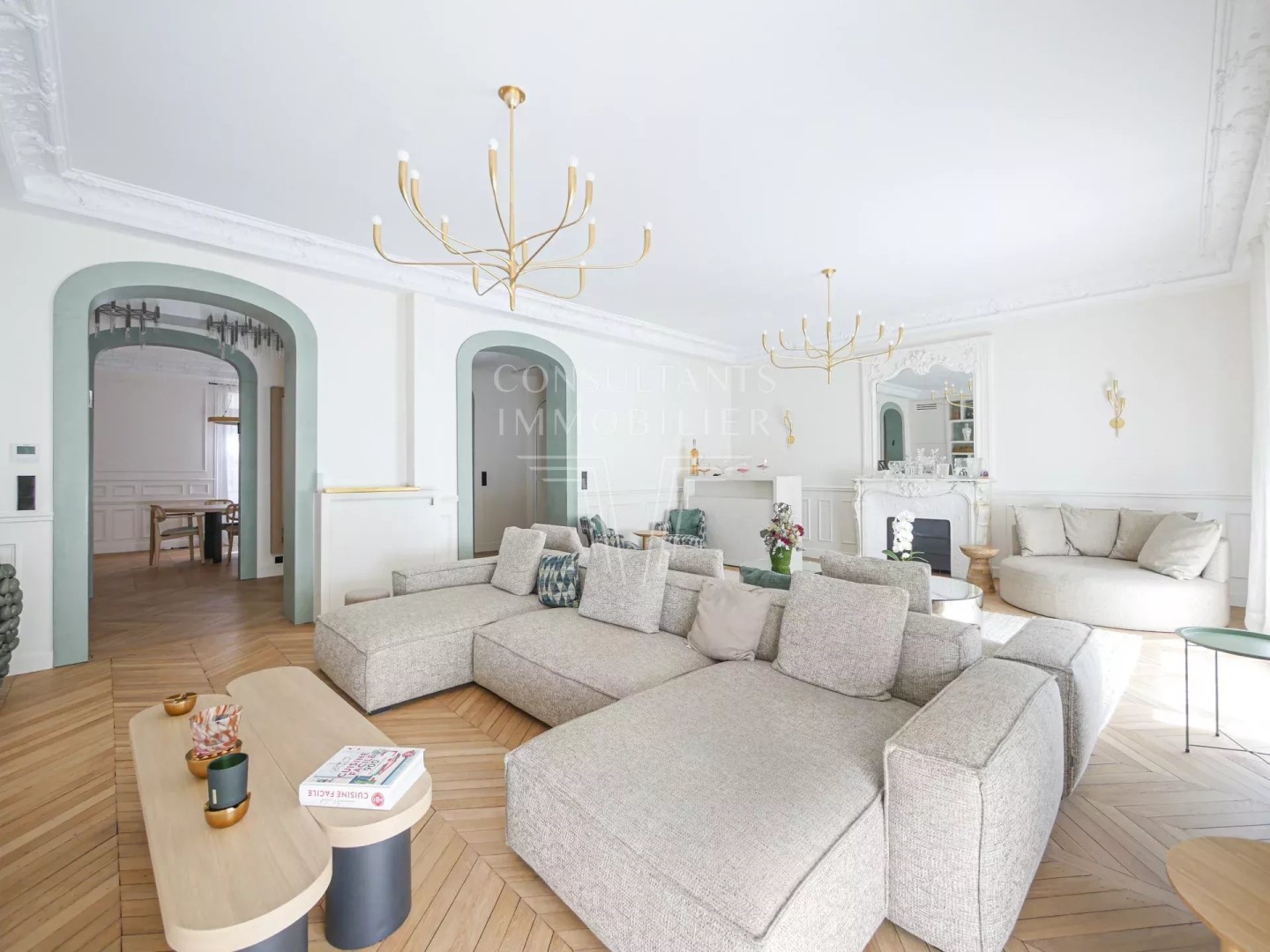 PARIS 17th. PARC MONCEAU NEIGHBORHOOD. EXCEPTIONAL PARISIAN FAMILY APARTMENT. On the first floor - second level - of a luxurious early 20th-century freestone building, recently refaced, with magnificent common areas and a caretaker: Refined dual-aspect apartment for both family and reception. It has been entirely renovated by a renowned architect in 2024, and it has retained all the period features. This property benefits from generous volumes and includes: an entrance gallery, a magnificent 50 sqm double living/reception room with a fireplace and a herringbone parquet floor, a 24 m² dining room, a kitchen with dining facilities, a master bedroom with a walk-in closet and bathroom, two further bedrooms, a second bathroom, and two lavatories. With a cellar and two small storage rooms. Exceptional location, a few steps from Parc Monceau, metro stations Ternes and Monceau, shops, and schools. CONSULTANTS IMMOBILIER LUXURY REAL ESTATE PARIS