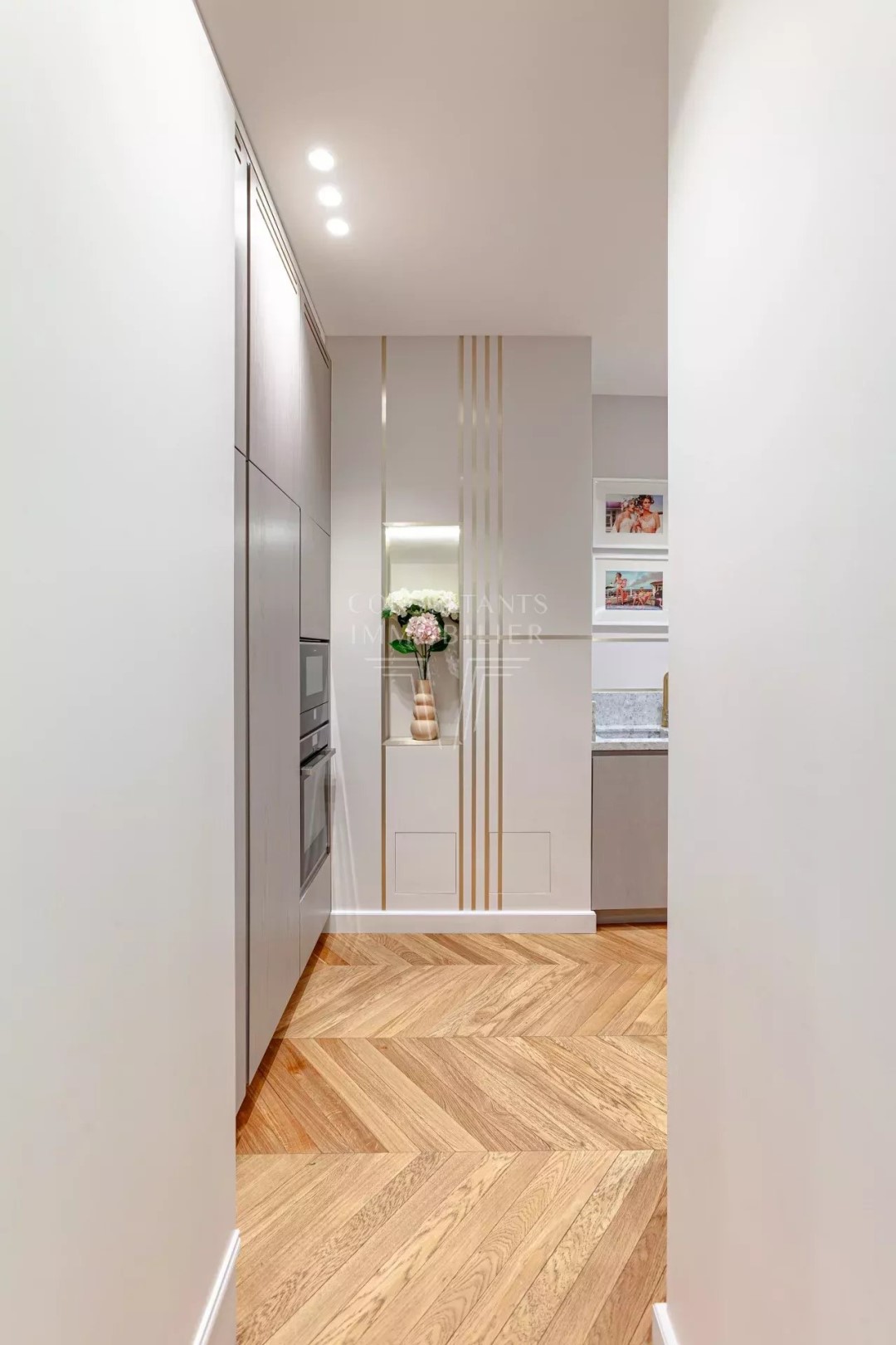 PARIS 17th – Courcelles / Parc Monceau On the third floor of a prestigious Haussmannian building with a concierge, the only apartment on the landing, this superb 185.40 sq m (Carrez Law) apartment faces south and is fully air-conditioned. Renovated and decorated by a renowned architect using high-end materials, it offers magnificent proportions (3.10 m ceiling height) and an ideal layout: an elegant entrance gallery, a light-filled triple reception room of 70 sq m comprising a living room, a rotunda dining room, and a boudoir, a fully equipped eat-in kitchen, a master suite with bathroom, shower, and toilet, three further bedrooms, a second bathroom, and a guest toilet. A large cellar completes this exceptional property. A parking space nearby is available for purchase (€60,000 agency fees included). Highly sought-after address, a stone's throw from Parc Monceau and the shops on Rue de Courcelles. School district: Collège Carnot.