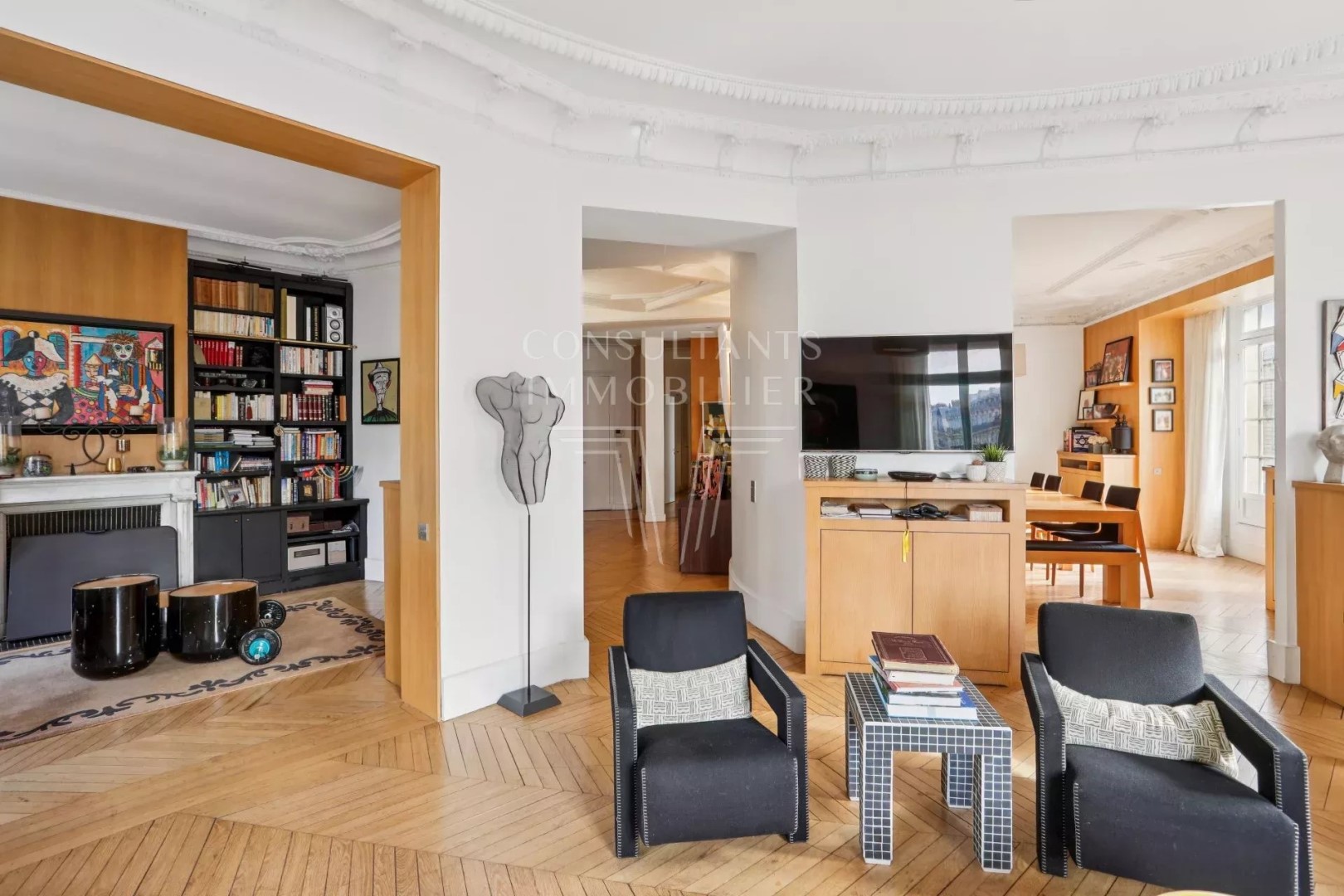 With an open view and south-west exposure this apartment214 m² (about 2300 ft²) has 6 rooms including 4 bedrooms, 1 bathroom and 2 toilets. It has a living room 47 m² (about 505 ft²), dining room 27 m² (about 290 ft²), a None and a balcony. It's located on the 4th floor with a lift. Heating : Collective. Others : guard, cable television. Fees : 2.759. This text is an automatic translation.