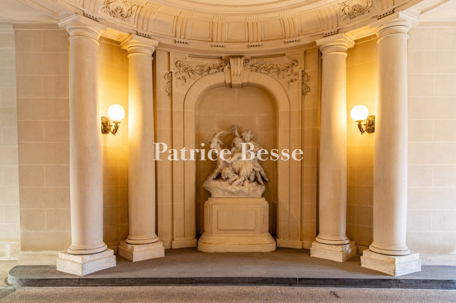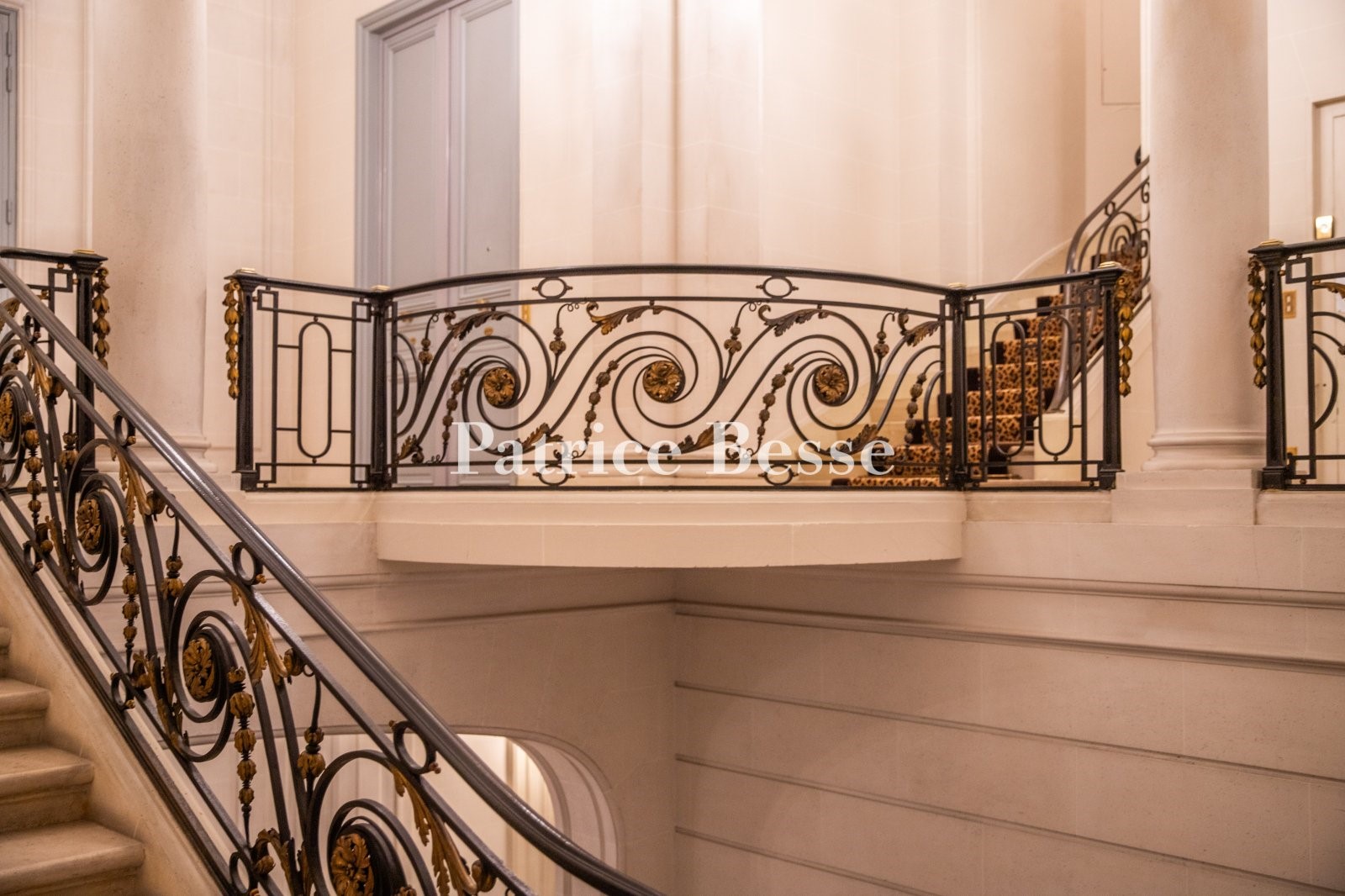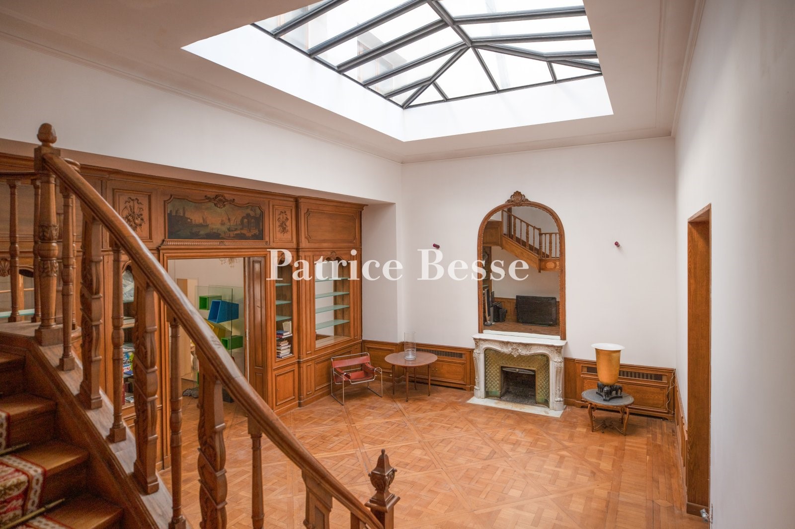 A more than 300-m² reception apartment, in a 19th-century mansion house, between Avenue Victor Hugo and the Bois de Boulogne. This private mansion, built in the late 19th century, boasts a classic and sober façade typical of the Haussmannian era. Made of ashlar, the edifice rises up above its sleeper wall of rusticated masonry. The walls of the upper floors are adorned with pilasters crowned by Ionic capitals, while the windows are underlined by sculpted bas-reliefs depicting abundance.<br />After passing through the carriage gate, a sculpture by Jean-Baptiste Carpeaux depicting a goat and 4 cupids welcomes visitors. Opposite, a large, marble staircase with a remarkable wrought-iron balustrade leads to the first floor on which the property is located. It can also be reached via an elevator. The entrance is made up of a hall with grey and red marble flooring and could serve as the setting for sculptures or works of art. The ceiling height of 5 metres further enhances this majestic impression. Overlooking the street, a living room with a ceiling boasting very ornate moulding and wood-panelled walls could be used as an office or a bedroom. Two bathrooms open directly into this room. Opposite, there is a room into which light streams through a large glass roof typical of 19th-century galleries. It is fitted with Versailles wood stripped flooring and the oak wainscotting is enhanced by a Hubert Robert inspired overmantel mirror in the shape of a door. An adjacent dining room is followed by a kitchen and an office. An interior staircase leads to the second floor, which has two bedrooms as well as a bathroom. The master bedroom is located on the third floor, in the attic level, and boasts exposed metal beams that bestow an industrial aspect upon it. In the corner, there is a semi-open-plan bathroom.
