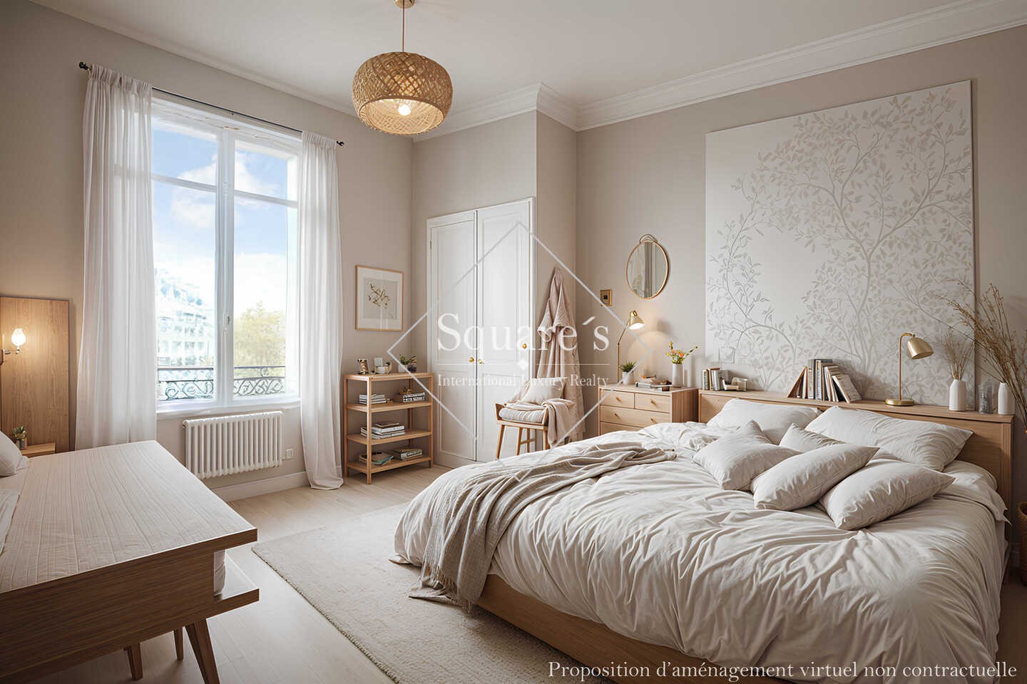 Exceptional property of 163m² located on the 3rd floor of a beautiful old building in the heart of Plaine Monceau, benefiting from a triple exposure with clear and sunny views. Excellent distribution with a star plan, this completely renovated apartment consists of an entrance gallery, a double reception of 55m2, three large bedrooms, a bathroom, a shower room, two dressing rooms, a laundry room and a guest toilet. Two cellars complete the offer